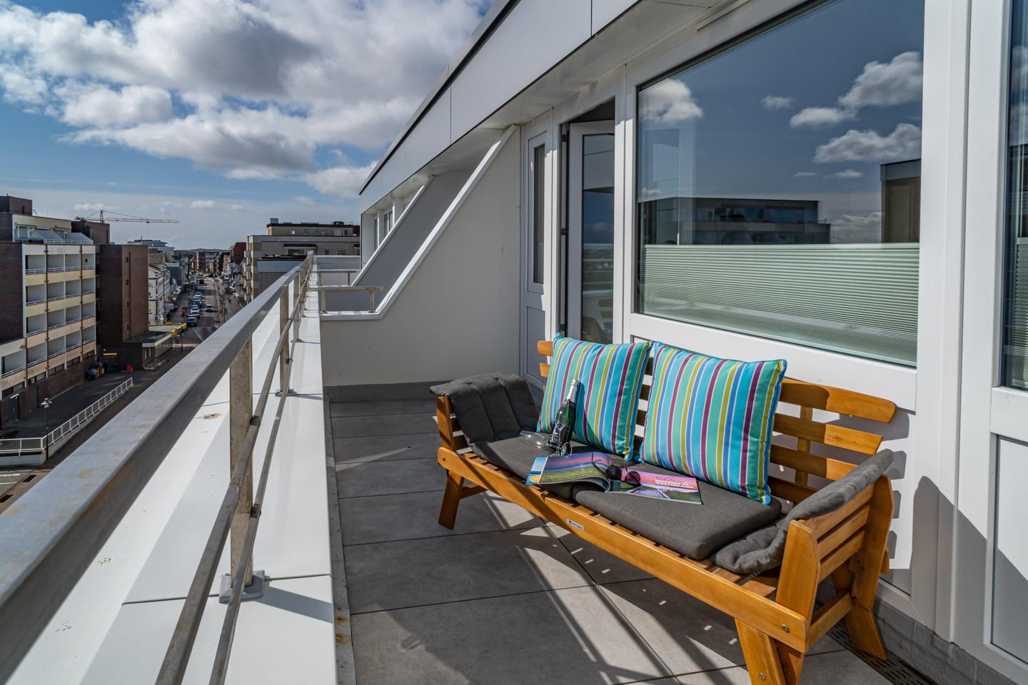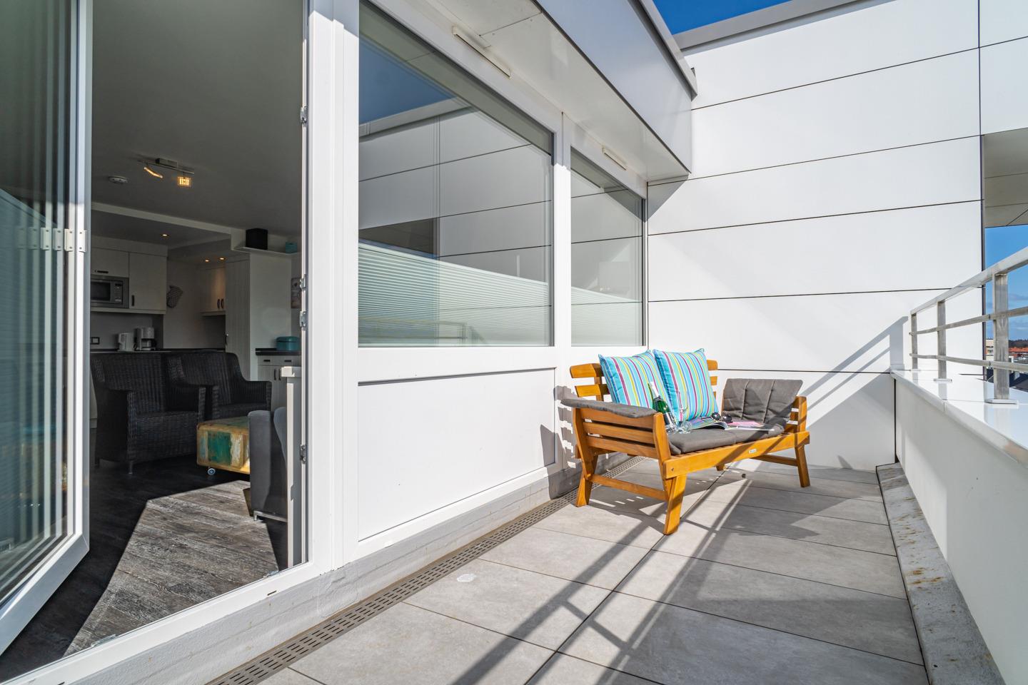 Modern ausgestattete 2-Zimmer-Nichtraucher-Ferienwohnung, ca. 51 m², 5. Etage mit 2 Dachterrassen zum Osten (Morgensonne, mit Balkonmöbeln und Auflagen) für 2 Erwachsene und max. 2 Kinder.
