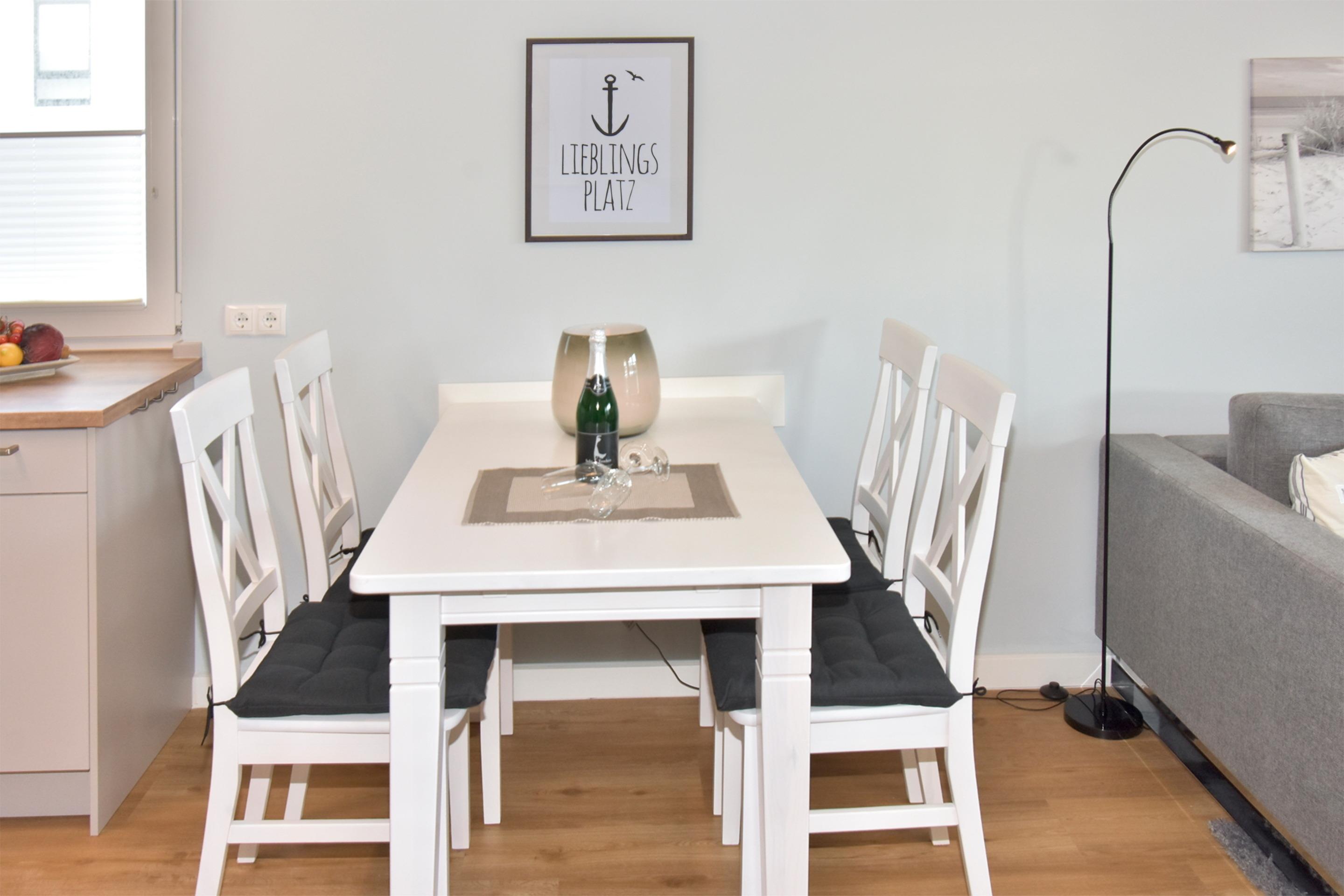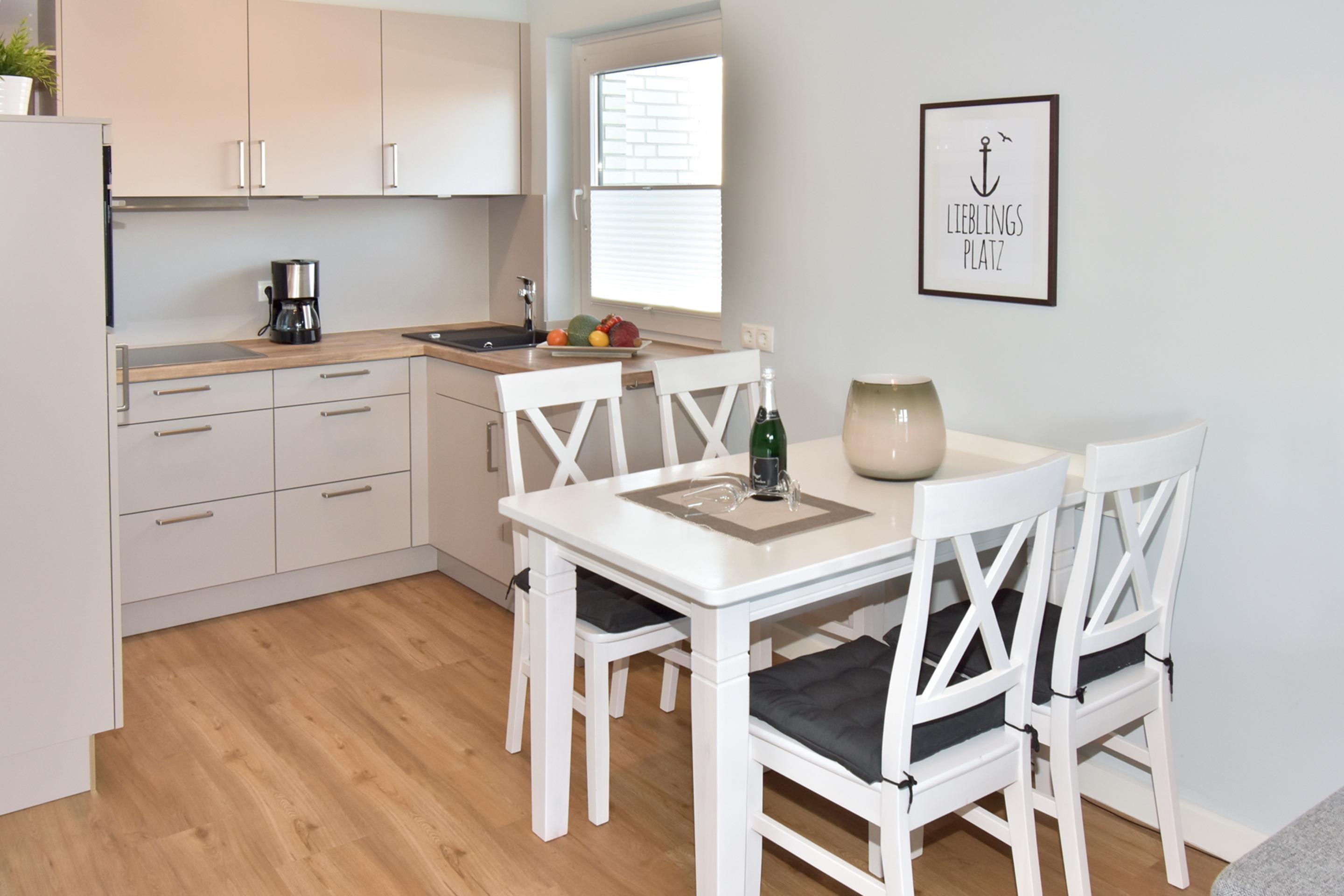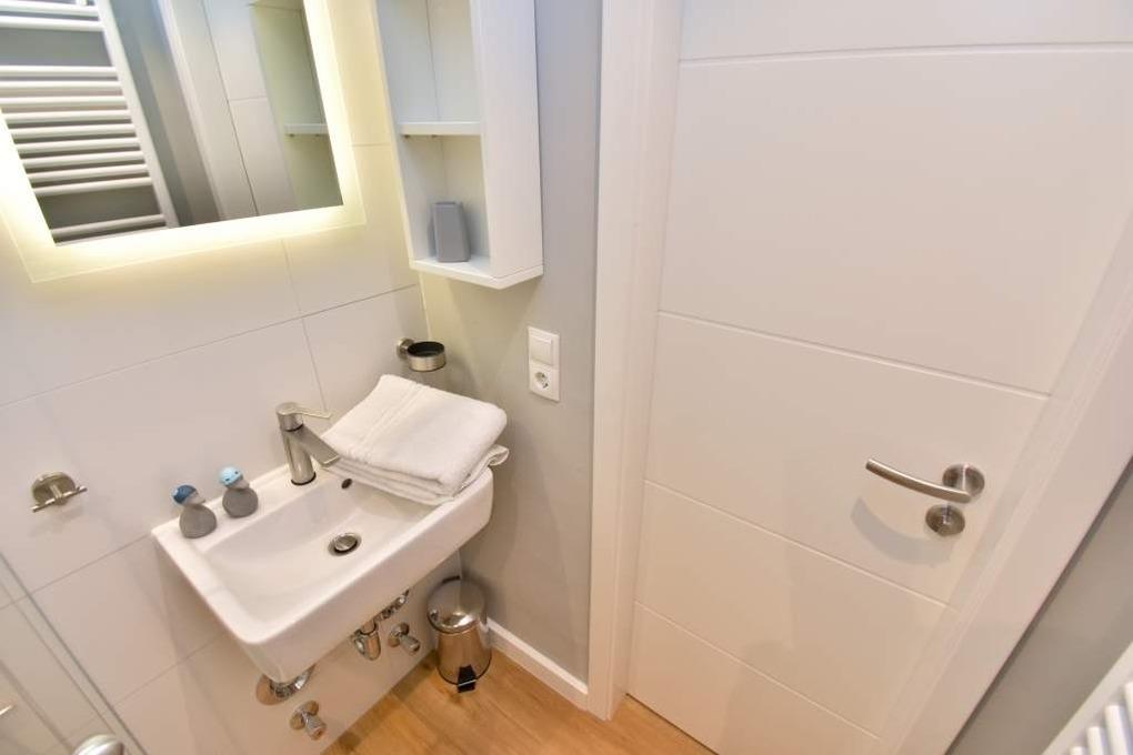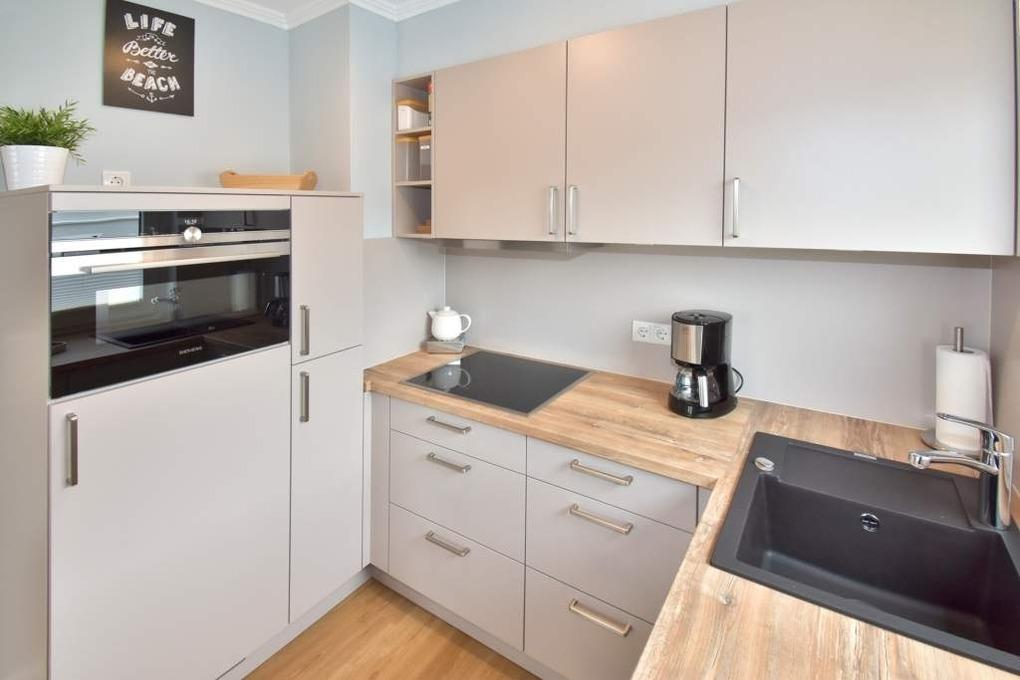 Im Schlafzimmer erwartet Sie ein schickes Doppelbett (1,80 x 2,00 m, mit zwei Einzelmatratzen) sowie ein zusätzlicher Flachbild-TV. Die offen gestaltete, moderne Küche lässt keine Wünsche offen: Cerankochfeld (4 Kochzonen), Geschirrspüler, Mikrowellen-Backofen-Kombigerät, Kühlschrank mit Gefrierfach, Milchaufschäumer, Kapselmaschine, Kaffeemaschine, Wasserkocher und Toaster gehören zur umfangreichen Ausstattung. Das hochwertig ausgestattete Bad verfügt über eine Dusche mit extraflachem Einstieg, Waschtisch, Handtuchtrockner, Fön und WC – durchdacht und stilvoll gestaltet.