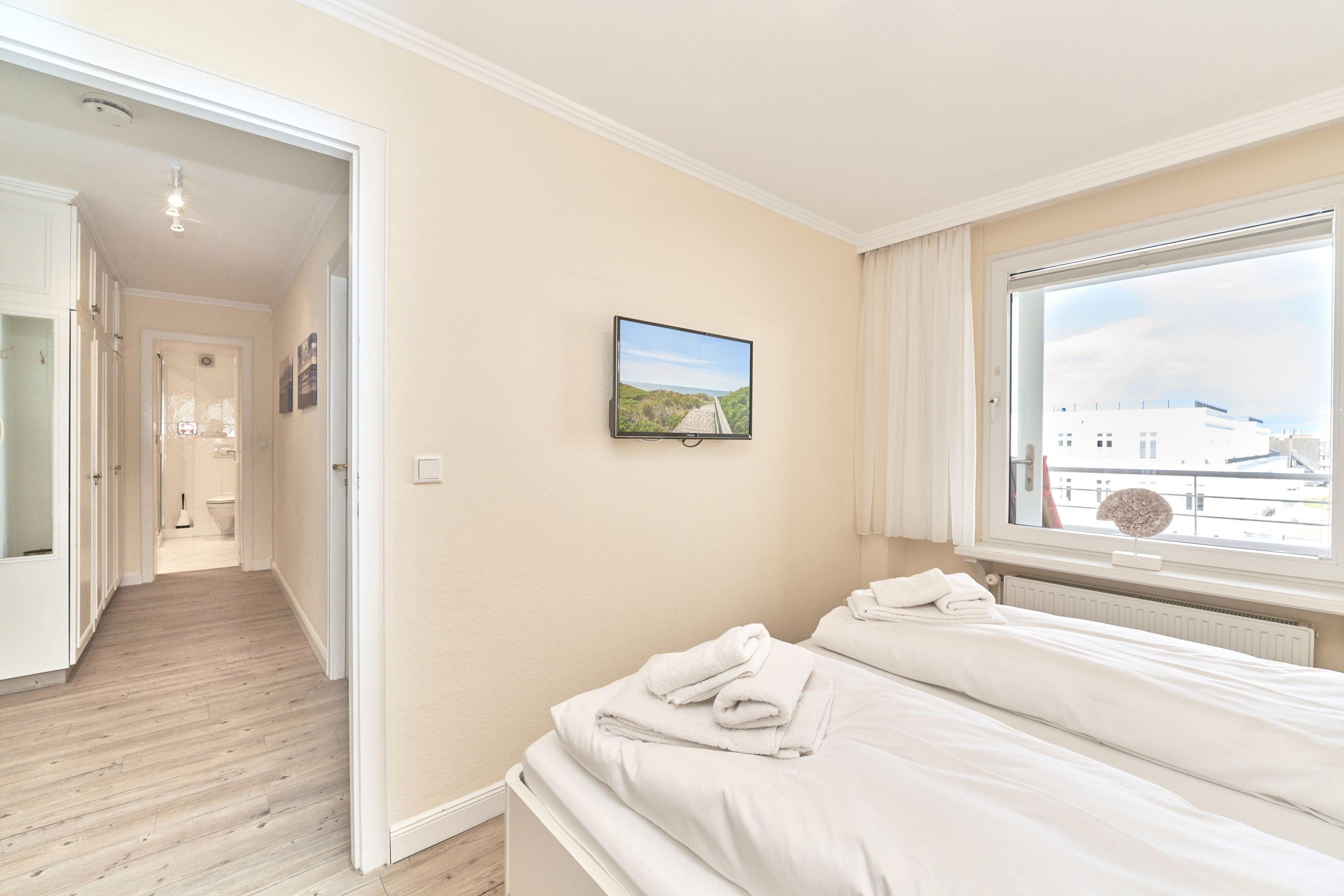 Am Haus Sola Bona parken Sie direkt und kostenlos, ein Aufzug bringt Sie bis auf Ihre Etage. Somit beginnt der schon mal Urlaub entspannt. Das schöne Wohnzimmer mit seinem Essbereich verfügt über einen Flat-TV, eine Sitzgruppe mit Sessel, sowie einen Couchtisch und direkten Zugang zum Balkon, von welchem Sie einen Blick nach Osten zur Keitumer Kirche haben. Liebevoll und im Detail aufeinander abgestimmt ist die Ferienwohnung eingerichtet. Das Schlafzimmer verfügt über ein Doppelbett mit 2 Nachttischschränkchen sowie einen großen Einbauschrank und ist mit Parkettboden ausgelegt. Das freundliche Badezimmer mit Dusche und WC, ist komplett ausgestattet und steht Ihnen für Ihre morgendliche Erfrischung zur Verfügung.