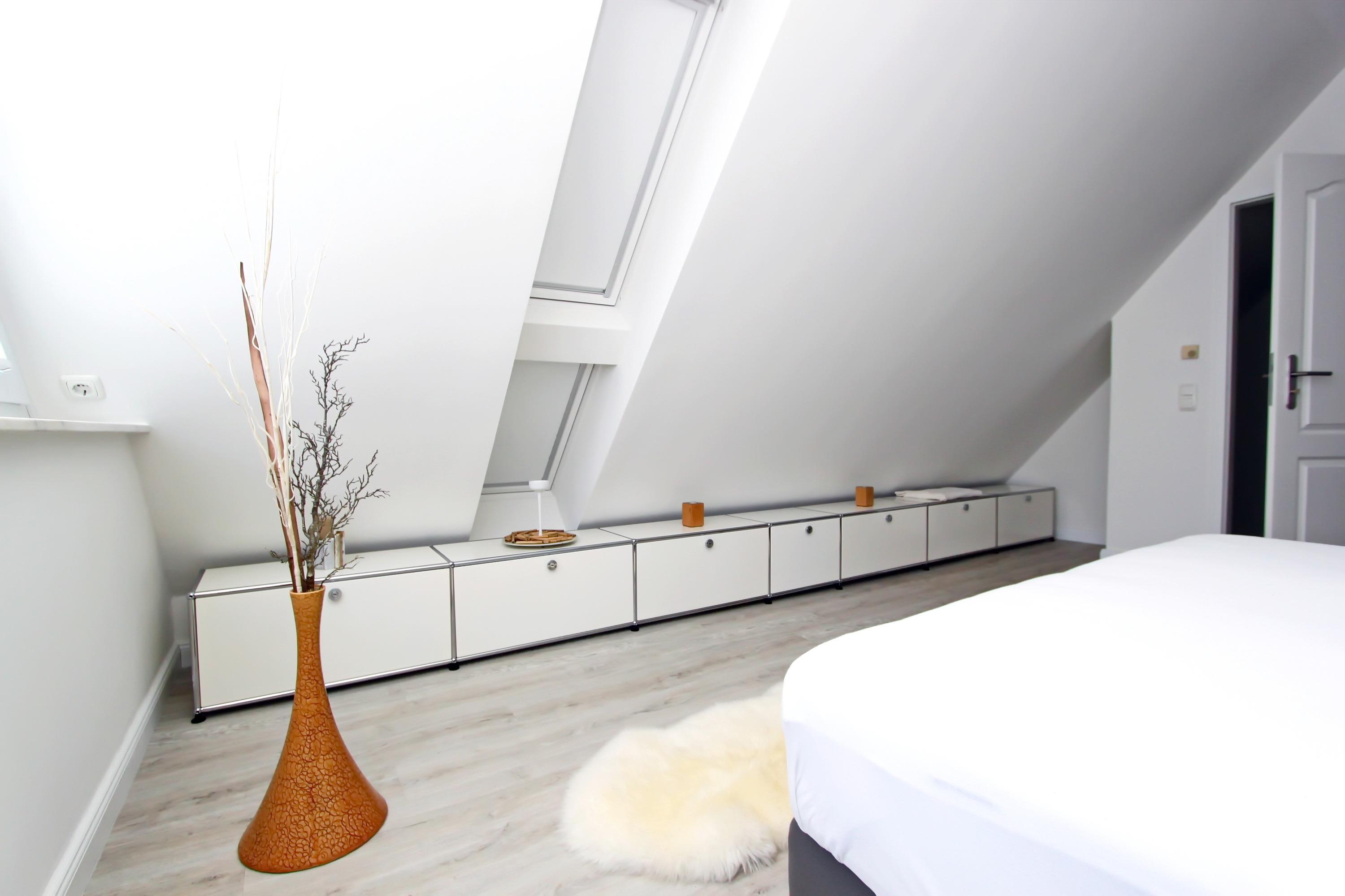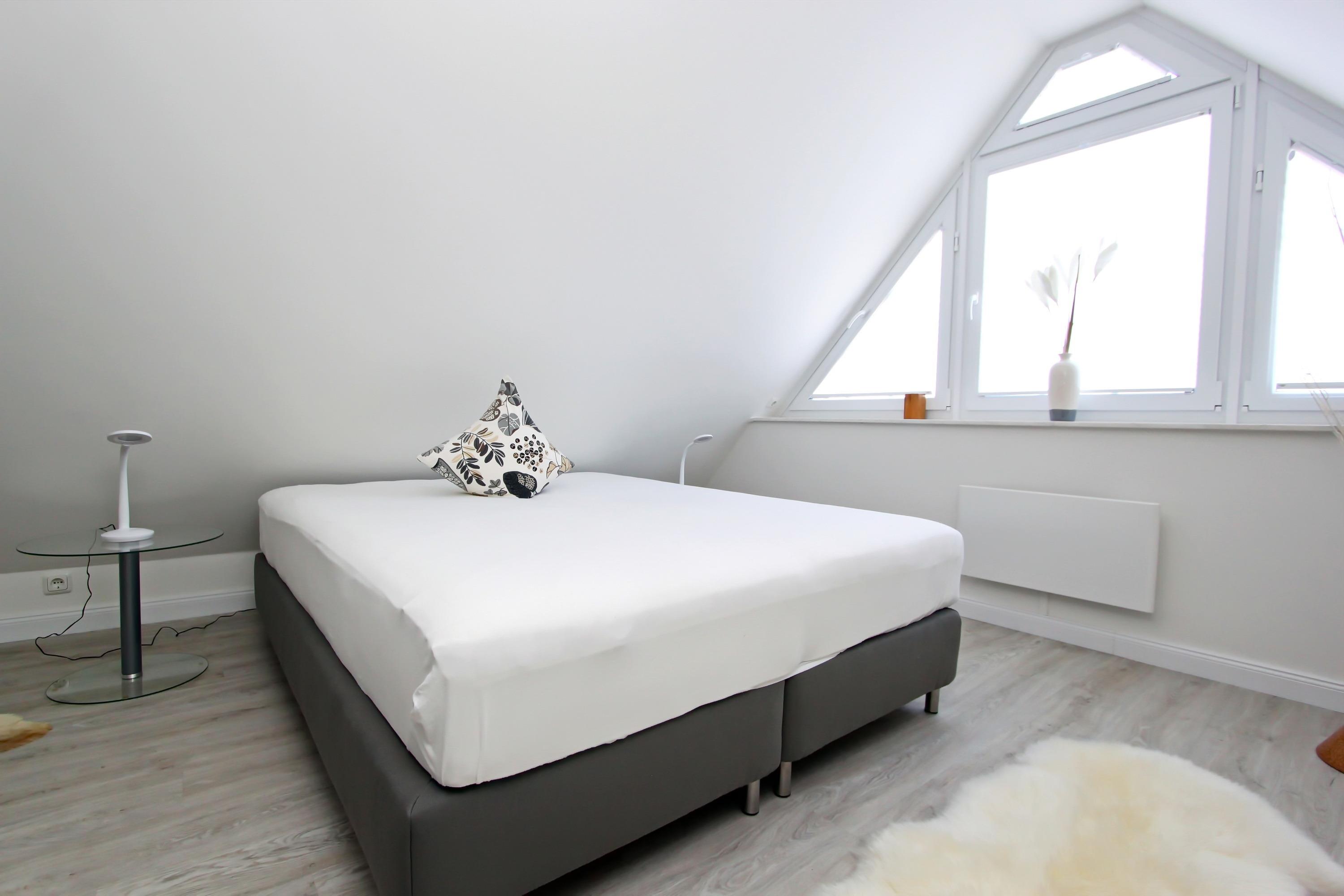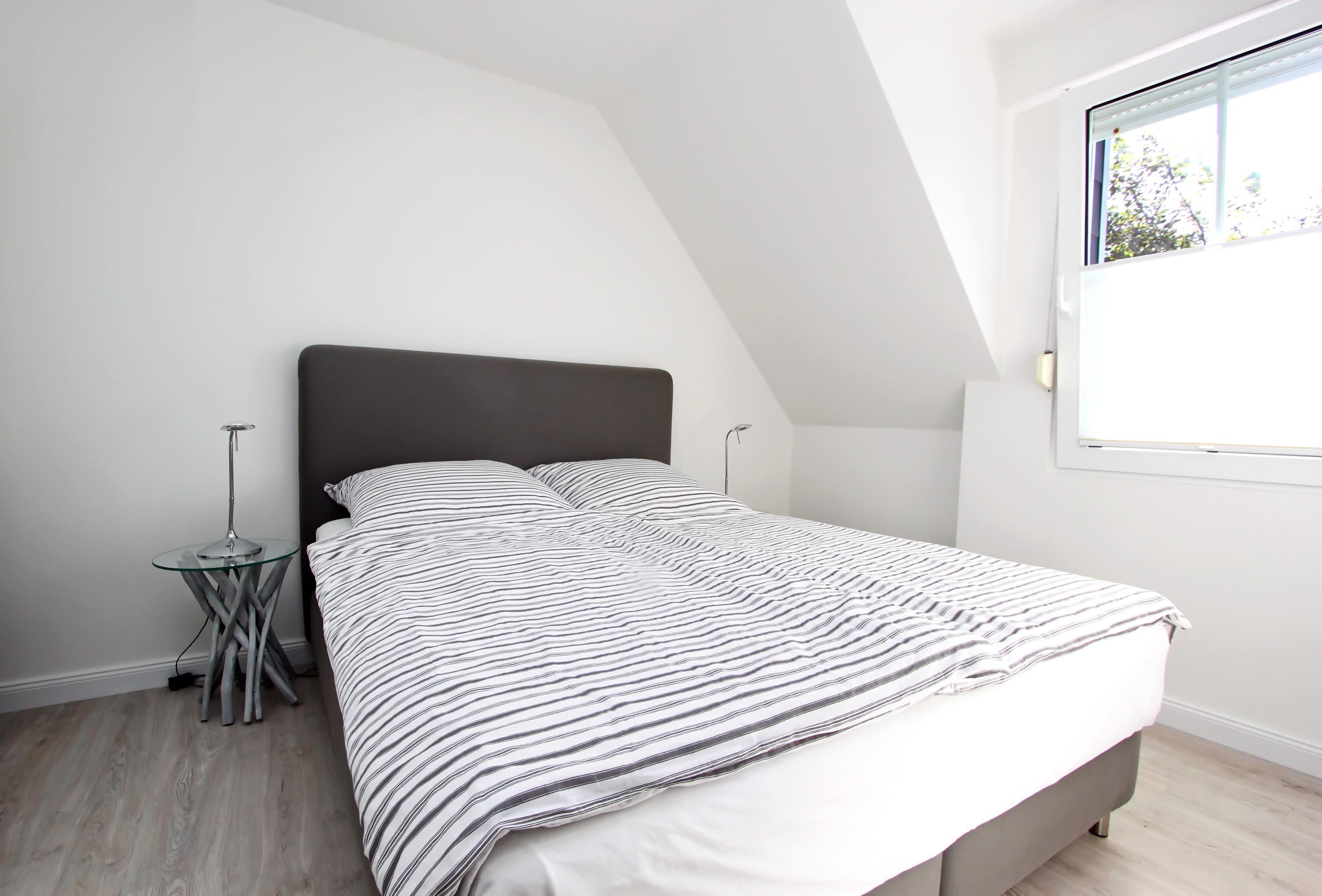 Das separate Schlafzimmer verfügt über ein Doppelbett, Nachttische, Flatscreen-TV und einem großen Kleiderschrank, der ausreichend Stauraum bietet. Flur mit kleinem Schreibtisch und Garderobe. Duschbad/WC mit ebenerdiger Dusche. Über eine Treppe gelangen Sie ins Dachgeschoss. Dort ist ein weiteres Schlafzimmer mit einem Doppelbett, Nachttische, Flatscreen-TV, Einbauspiegelschrank, kl. Schaukelstuhl, Tisch und viel Stauraum in den kleinen Sideboards entlang der Wand. Das Appartement ist komplett mit hochwertigen Vinyl Boden ausgelegt. Bei Anreise sind die Betten bezogen, auch Handtücher sind inklusive.