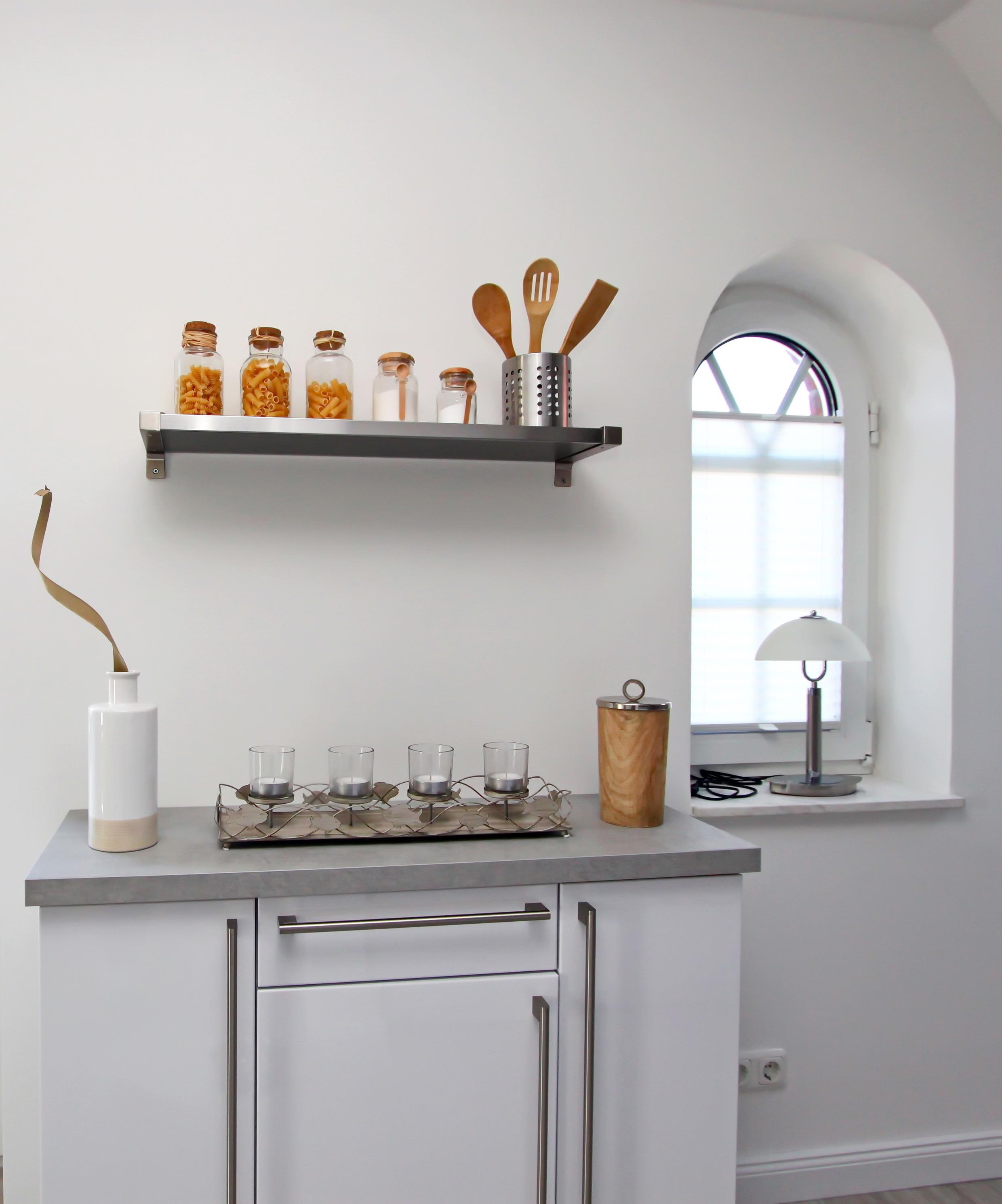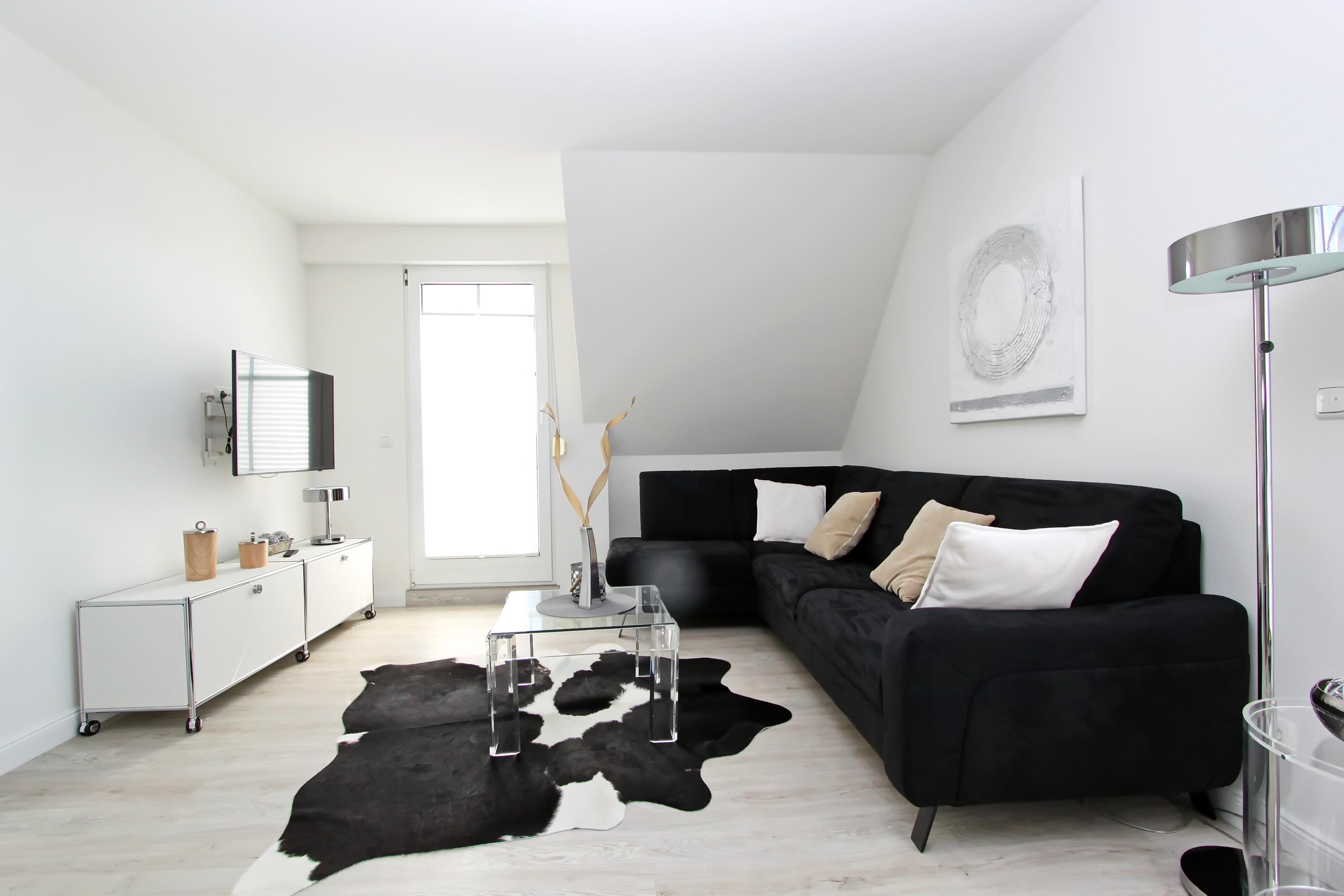 Im Wohnraum befindet sich ein großes Sofa, Couchtisch, Sideboard, Flatscreen-TV, eine Blue Tooth Music Box, Esstisch für 4 Personen, Zugang zum möblierten Süd- und Westbalkon sowie die offene Einbauküche, in der Sie sich selbst verpflegen können. Sie ist mit einem Cerankochfeld, Backofen, Geschirrspüler, Kühlschrank mit Gefrierfach, etc. vollausgestattet.