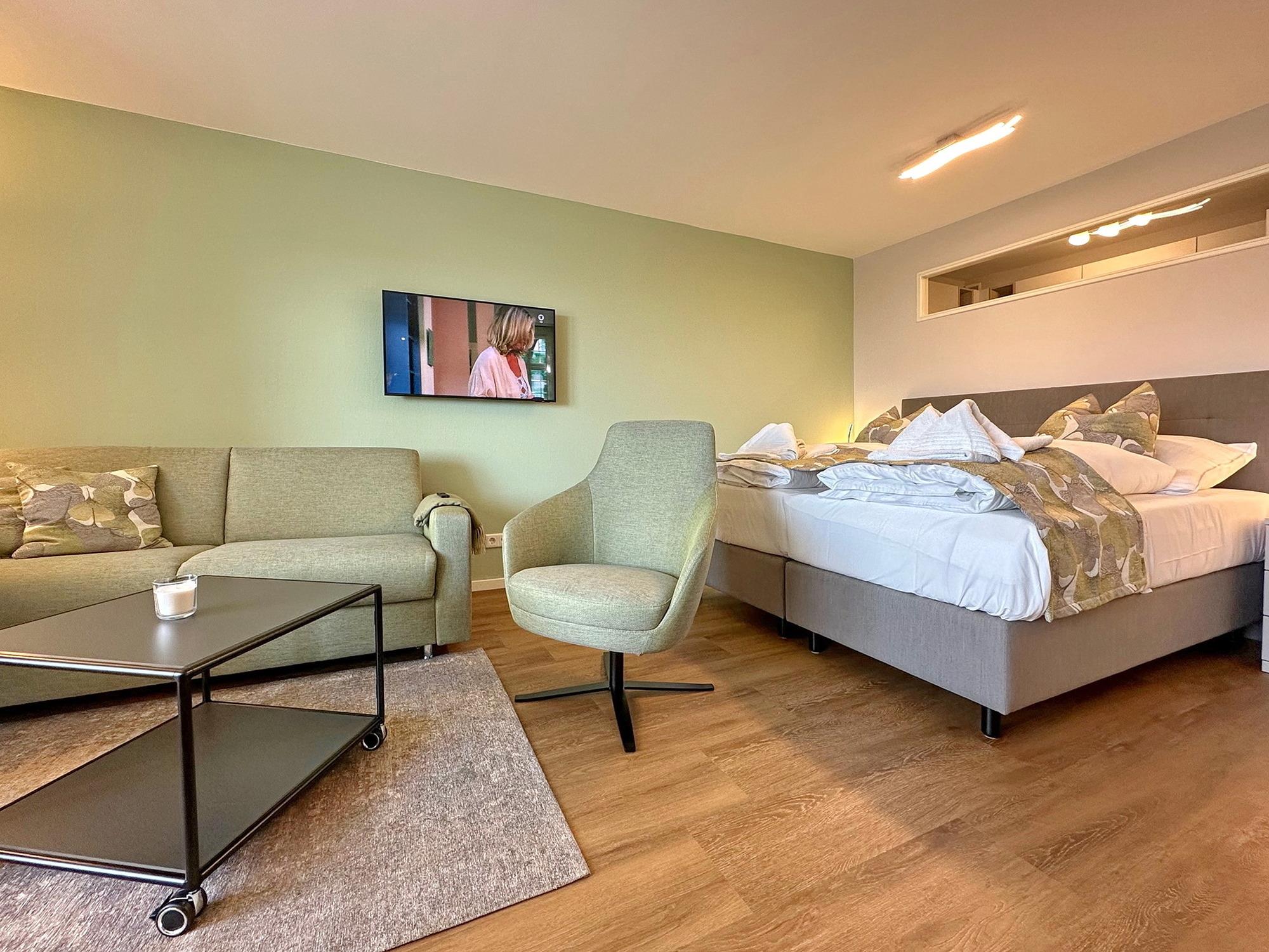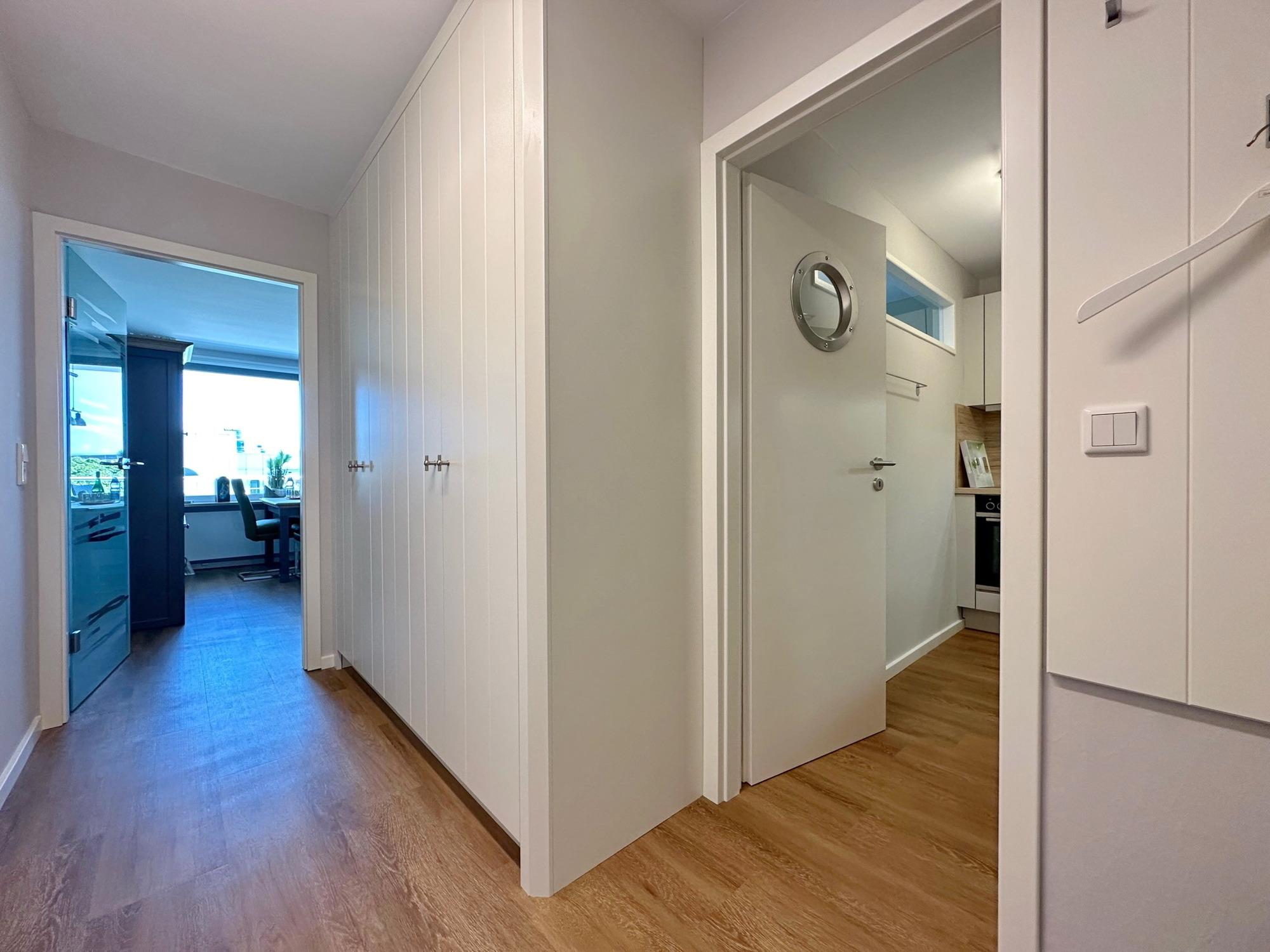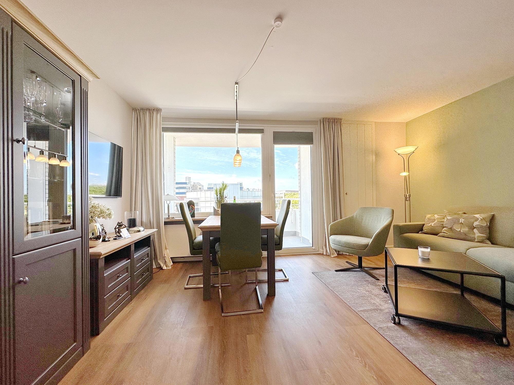 Hochwertige 1-Zimmer-Wohnung im 2. OG mit Westbalkon und Blick zur Nordsee. Max. Belegung mit 2 Personen. Ca. 43,5 m². Schöner Wohn-/Schlafraum mit Boxspring-Doppelbett (Einzelmatratzen, 90x200), Essplatz am Fenster, Couchgarnitur und Sessel sowie 2 Fernsehern, Einbauschrank für Koffer und Co.. W-Lan (ohne Gewähr). Hübsche, separate Küche mit Geschirrspüler und Cerankochfeld. Badezimmer mit Dusche und Waschmaschine. Flur mit Einbaukleiderschränken und Garderobe. Bettwäsche und Handtücher sind zur Anreise aufgezogen. Pkw-Stellplatz/Garage kann kostenpflichtig gebucht werden. Tierhaltung und Rauchen sind in diesem Objekt nicht gestattet.