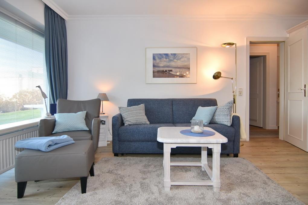 Gepflegte 2-Zimmer-Ferienwohnung, ca. 55m², in zentraler Lage, nur 200m bis zum Strand. Wohnzimmer mit Südterrasse u. Strandkorb (elektr. Markise), Sitzecke mit Schlafcouch, Flatscreen, DVD-Player, Ipod-Dockingstation, Internet (ohne Gewähr), Stereoanlage, Essplatz für max. 3 Personen, Küchenzeile mit Nespresso-Maschine, Mikrowelle, Geschirrspüler und Ceranherd. Separates Schlafzimmer mit Doppelbett und Einbauschrank, Duschbad/WC. Design-Boden in Holzoptik. Tiefgaragenstellplatz-Nr. 5, Waschküche befindet sich im Haus (Münzautomaten). Rauchen und Tierhaltung ist nicht gestattet.