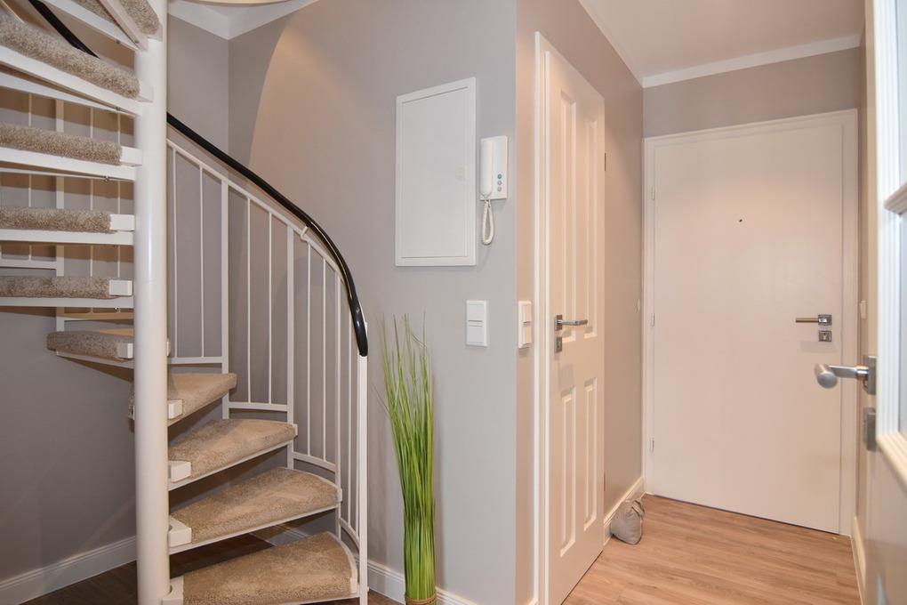 Schöne 2-Zimmer-Wohnung in Innenstadtlage auf 2 Etagen. Ca. 50qm, 3. Etage (Fahrstuhl vorhanden). Wohnzimmer mit Couch mit Schlaffunktion (140x200 cm), 2 Sessel, Essplatz, TV und Musikanlage, WLAN (ohne Gewähr), offene Küche mit Geschirrspüler, Backofen und Mikrowelle, Westbalkon mit Balkonmöbeln. Auf der Ebene befindet sich ein kleines Duschbad/WC. Im offenen Dachgeschoß befindet sich ein Schlafzimmer mit Box-Springbett (160x200 cm ), Kleiderschrank und Flat-TV sowie ein weiteres Duschbad/WC. Die Etage ist über eine Wendeltreppe erreichbar. Duplex-Garagenstellplatz (Bedienungsanleitung dringend beachten, Nutzung auf eigene Gefahr, nicht für SUV/Kombi geeignet, max. Maße/Gewichte: 500 cm Länge, 180 cm Breite, 150 cm Höhe, max. 2.000 kg Gewicht, max. 500 kg Radlast). Nichtraucher-Appartement. Tierhaltung ist nicht gestattet. Bettwäsche und Handtücher sind zur Anreise aufgezogen.