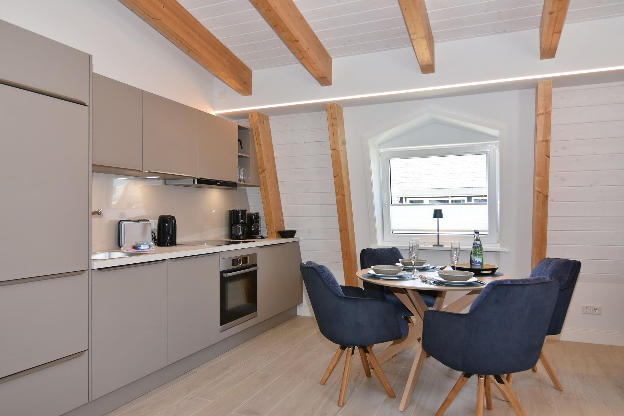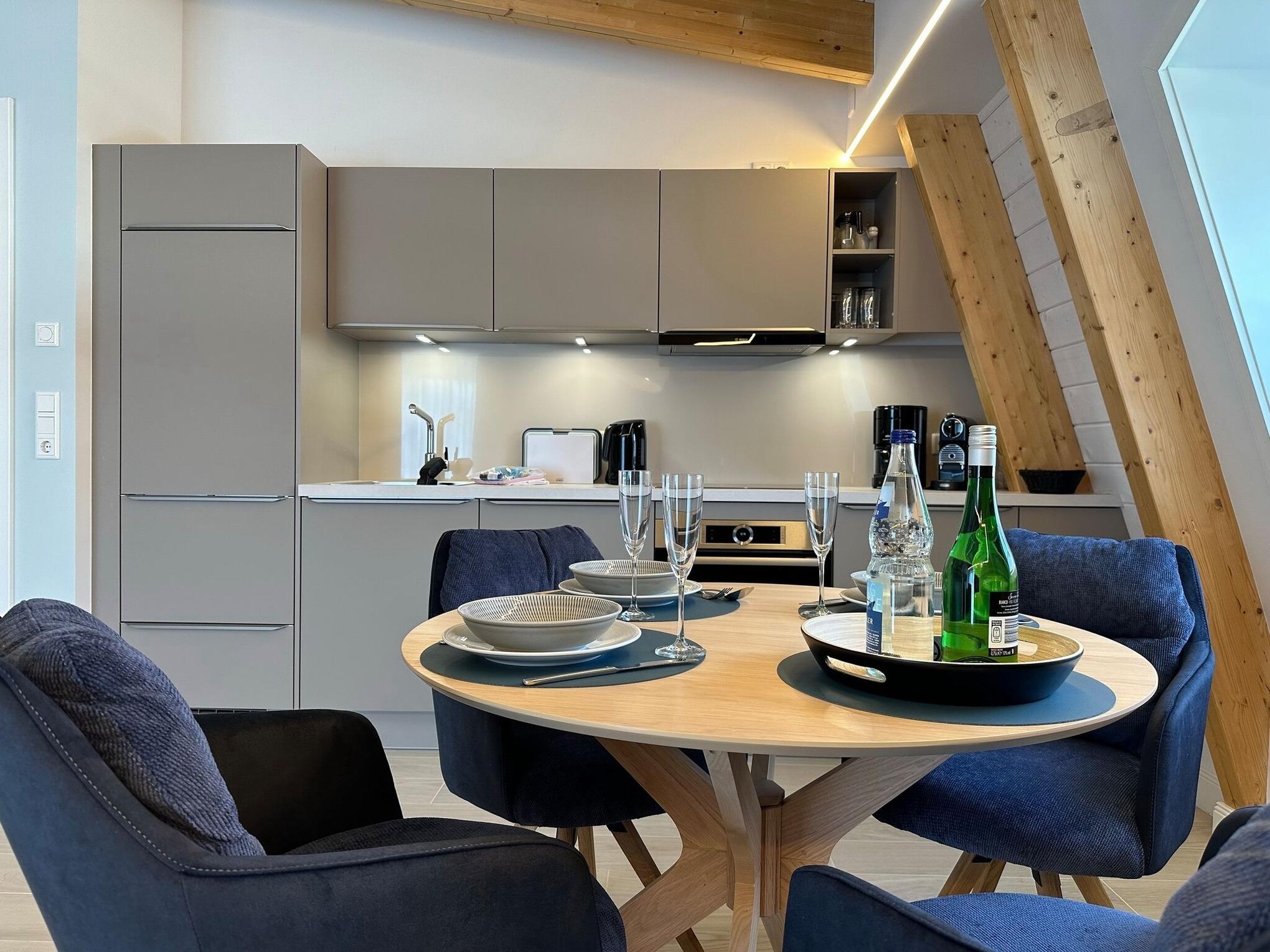 Die hochwertige 2-Zimmer-Wohnung im 2. OG mit ca. 59 qm ist für maximal 2 Personen ausgestattet. Vom Flur mit Garderobe gelangen Sie in das Wohnzimmer mit offener Küche und möbliertem Ostbalkon. Die hochwertige Küche bietet neben Induktionsherd auch Geschirrspüler, Kühlschrank mit Gefrierfach und Backofen mit integrierter Mikrowelle. Die Wohnung bietet Ihnen ein Schlafzimmer und ein Duschbad /WC mit Haar- und Handtuchtrockner. Das Schlafzimmer ist mit einem Boxspringbett (180x200) der Marke FBF, Flat-TV und Einbauschrank ausgestattet. Bis auf das Schlafzimmer sind die Räume mit großformatigen Fliesen versehen.