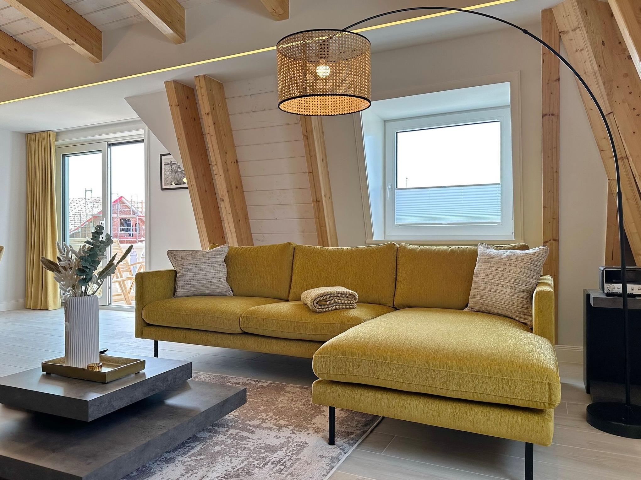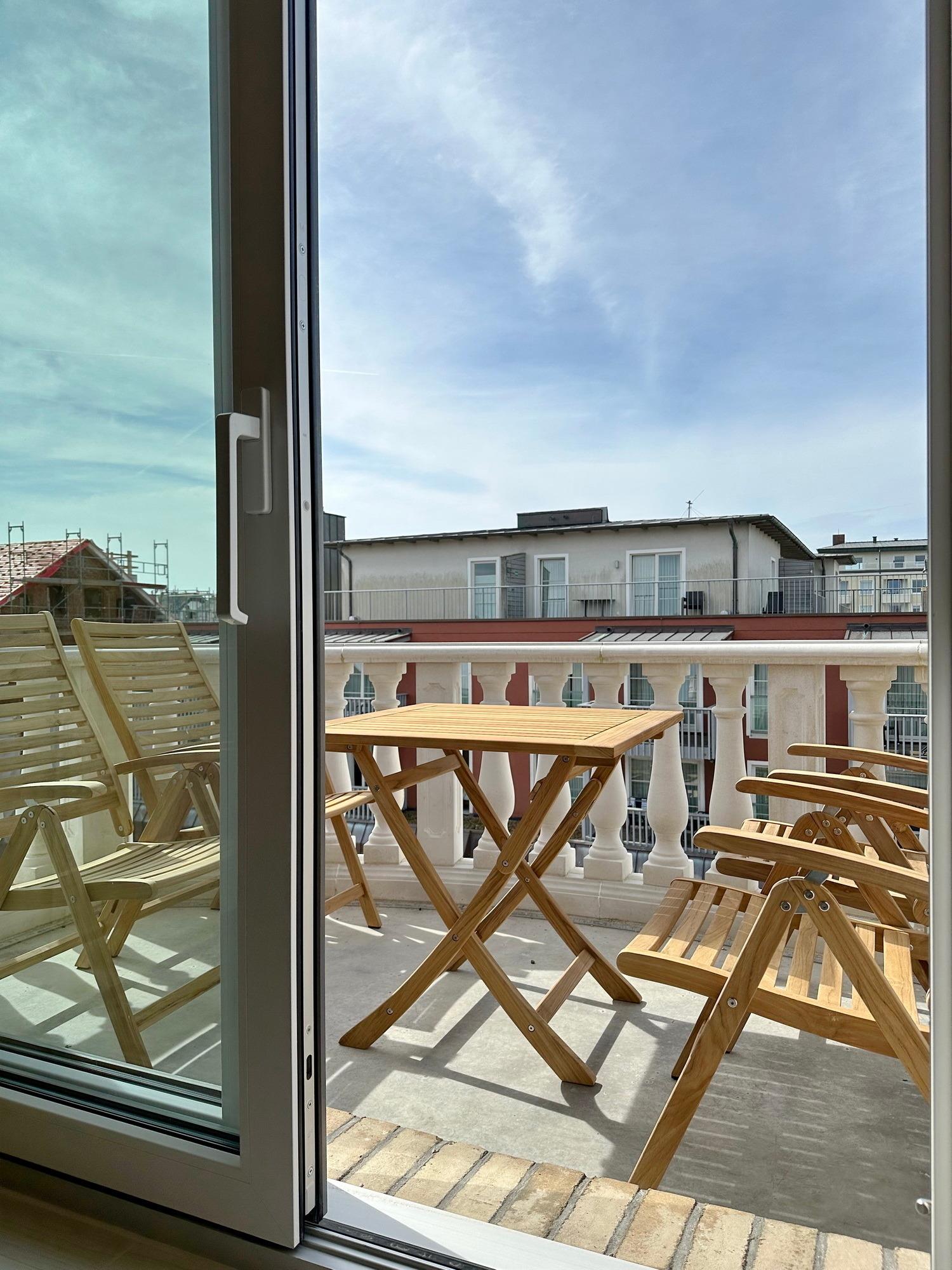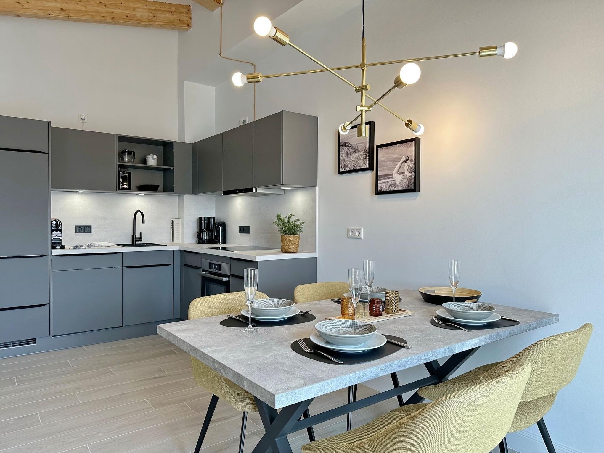 Die hochwertige 3-Zimmer-Wohnung im 3. OG mit ca. 79 qm ist für maximal 4 Personen. Vom geräumigen Flur mit Garderobe gelangen Sie in das Wohnzimmer mit offener Küche und möblierten Westbalkon. Die hochwertige Küche bietet neben Induktionsherd auch Geschirrspüler, Kühlschrank mit Gefrierfach und Backofen mit integrierter Mikrowelle. Beide Schlafräume bieten mit Boxspringbetten (160x200) der Marke FBF hochwertigen Schlafkomfort und verfügen über Einbauschrank und TV (1 Kinderbett im beigen Schlafzimmer zubuchbar). Die Wohnung verfügt über 2 moderne Duschbäder mit Haar- und Handtuchtrockner. Die Wohnung ist mit großformatigen Fliesen ausgelegt und verfügt über Fußbodenheizung. Lediglich die Schlafräume sind mit Teppichware versehen. Internet (ohne Gewähr) und Smart-TV sind vorhanden.