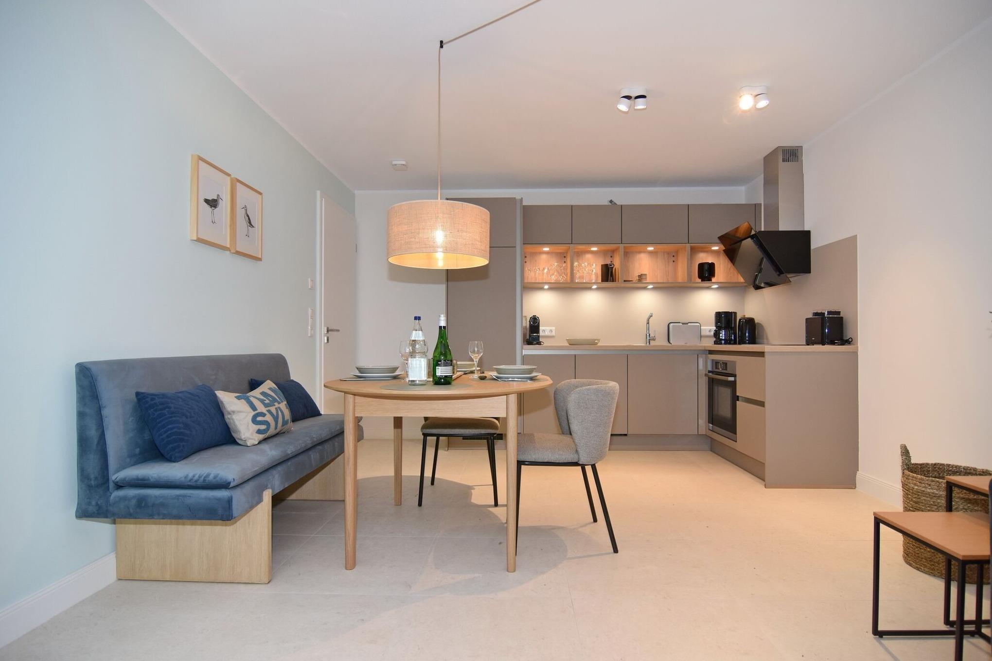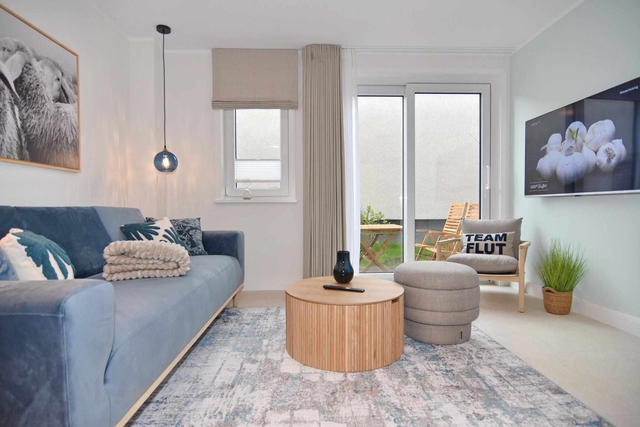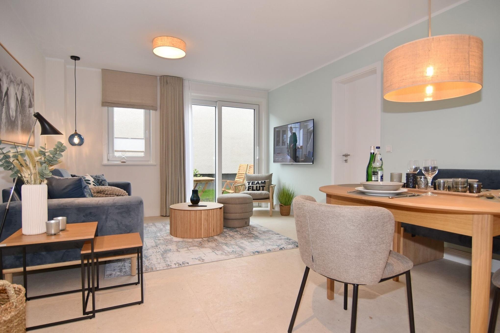 Die hochwertige 3-Zimmer-Erdgeschosswohnung mit ca. 60 qm ist für maximal 3 Personen ausgestattet. Vom geräumigen Flur mit Garderobe gelangen Sie in das Wohnzimmer mit offener Küche und möblierter Südterrasse. Die hochwertige Küche bietet neben Induktionsherd auch Geschirrspüler, Kühlschrank mit Gefrierfach und Backofen mit integrierter Mikrowelle. Die Wohnung bietet Ihnen zwei Schlafräume und ein Duschbad /WC mit Haar- und Handtuchtrockner. Das große Schlafzimmer ist mit einem Boxspringbett (200x200) der Marke FBF, Flat-TV und Einbauschrank ausgestattet (1 Kinderbett zubuchbar), das kleine Schlafzimmer hat ein vom Tischler eingebautes Einzelbett (90x200) und einen kleinen Einbauschrank.