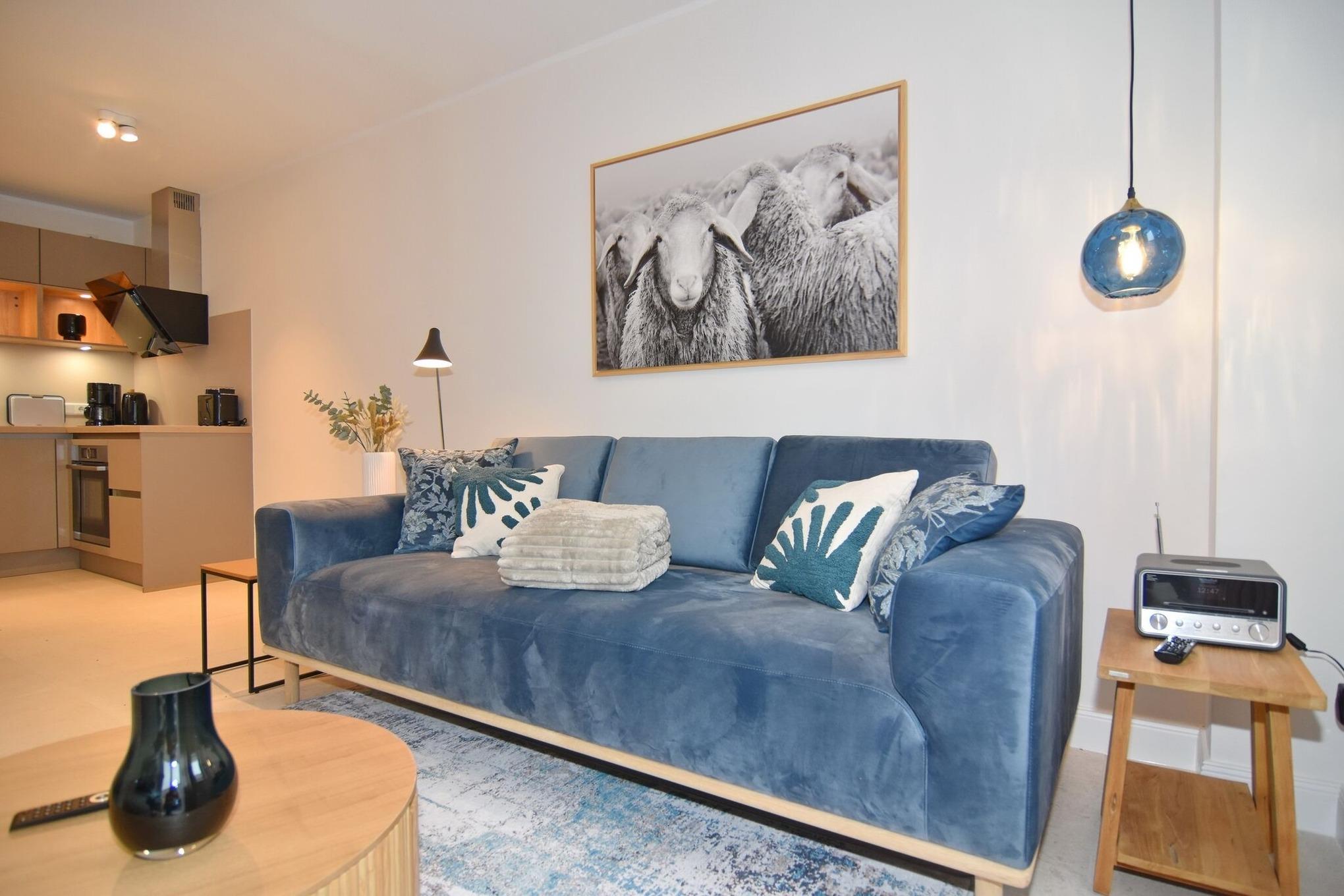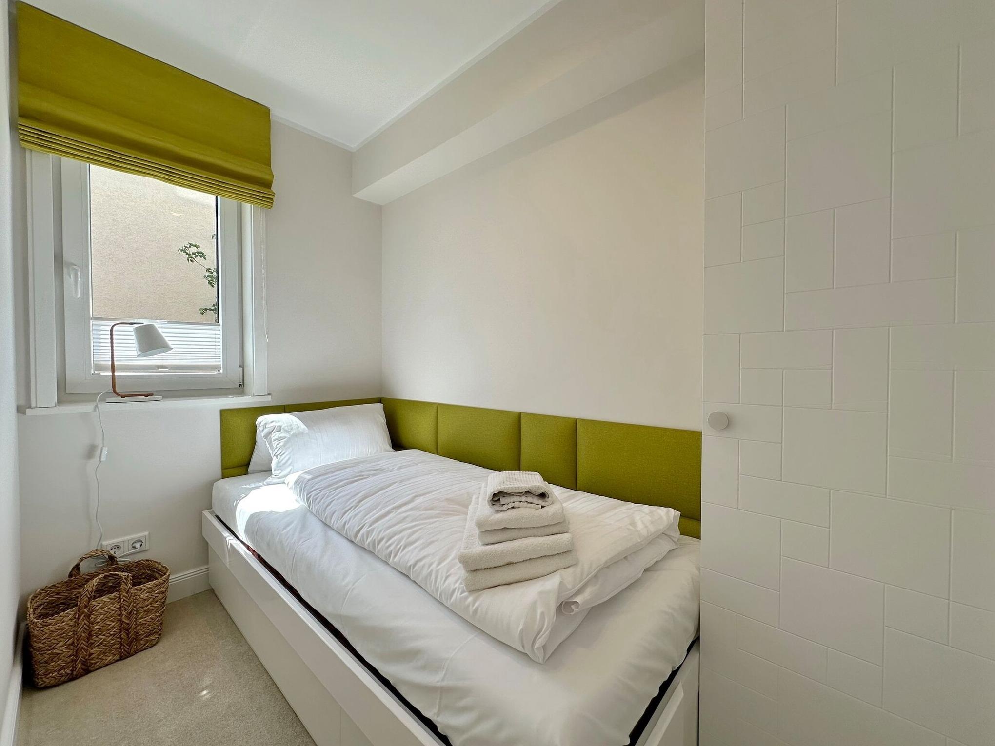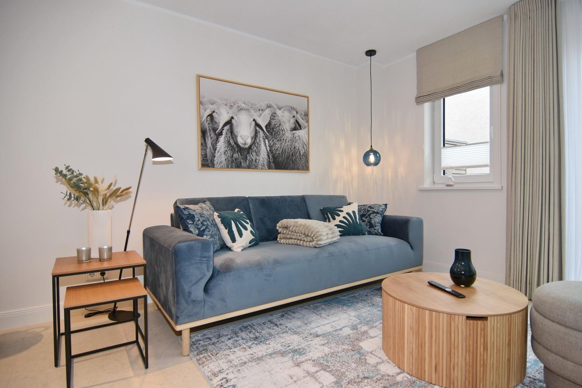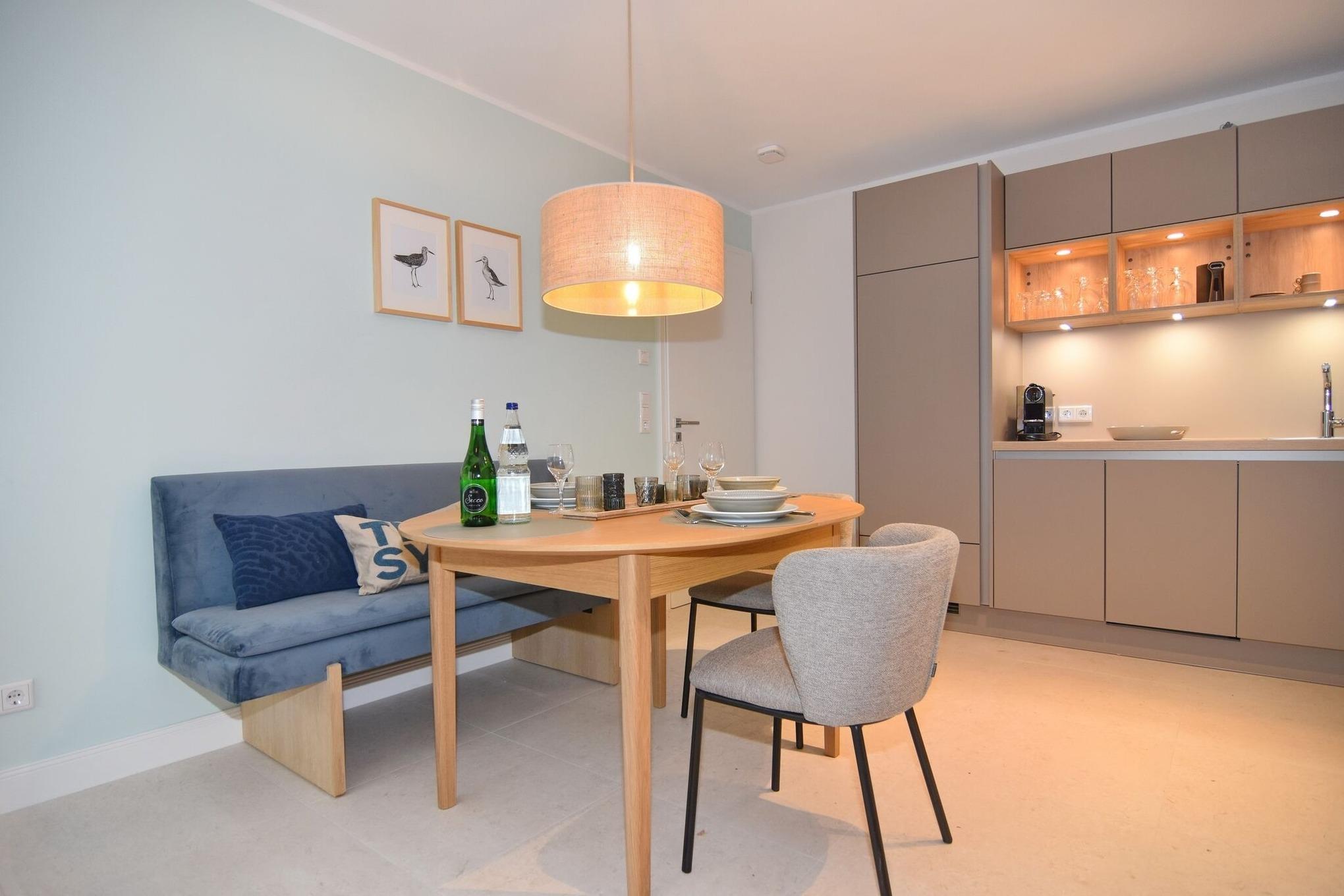 Die hochwertige 3-Zimmer-Erdgeschosswohnung mit ca. 60 qm ist für maximal 3 Personen ausgestattet. Vom geräumigen Flur mit Garderobe gelangen Sie in das Wohnzimmer mit offener Küche und möblierter Südterrasse. Die hochwertige Küche bietet neben Induktionsherd auch Geschirrspüler, Kühlschrank mit Gefrierfach und Backofen mit integrierter Mikrowelle. Die Wohnung bietet Ihnen zwei Schlafräume und ein Duschbad /WC mit Haar- und Handtuchtrockner. Das große Schlafzimmer ist mit einem Boxspringbett (200x200) der Marke FBF, Flat-TV und Einbauschrank ausgestattet (1 Kinderbett zubuchbar), das kleine Schlafzimmer hat ein vom Tischler eingebautes Einzelbett (90x200) und einen kleinen Einbauschrank.