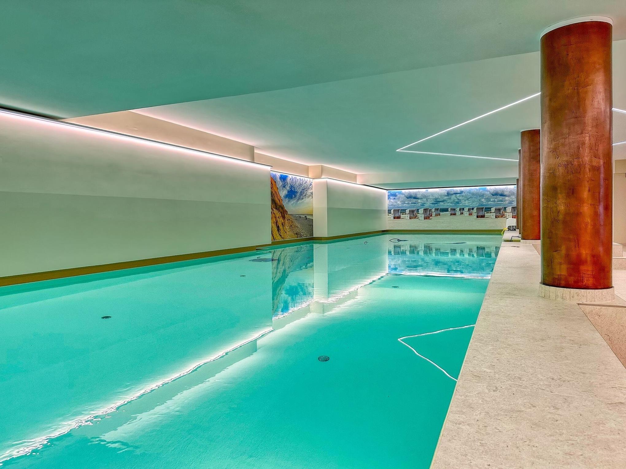 Im Haus befindet sich ein großzügiger Wellnessbereich mit Schwimmbad, finnischer Sauna und Ruheraum sowie eine Waschküche mit Gemeinschaftswaschmaschine/Trockner. Das Schwimmbad ist mit einer Größe von 20 x 5m das Größte unserer Anlagen. In der gesamten Anlage ist das Rauchen und Halten von Hunden untersagt. Bettwäsche und Handtücher sind zur Anreise aufgezogen. Ein Tiefgaragenstellplatz kann kostenpflichtig dazu gebucht werden. Eine Ladestation für E-Autos befindet sich am Haus und kann kostenpflichtig genutzt werden. Ihre Fahrräder können Sie in der Tiefgarage auf einen dafür vorgesehenen Abstellplatz stellen (ist nicht zusätzlich gesichert).