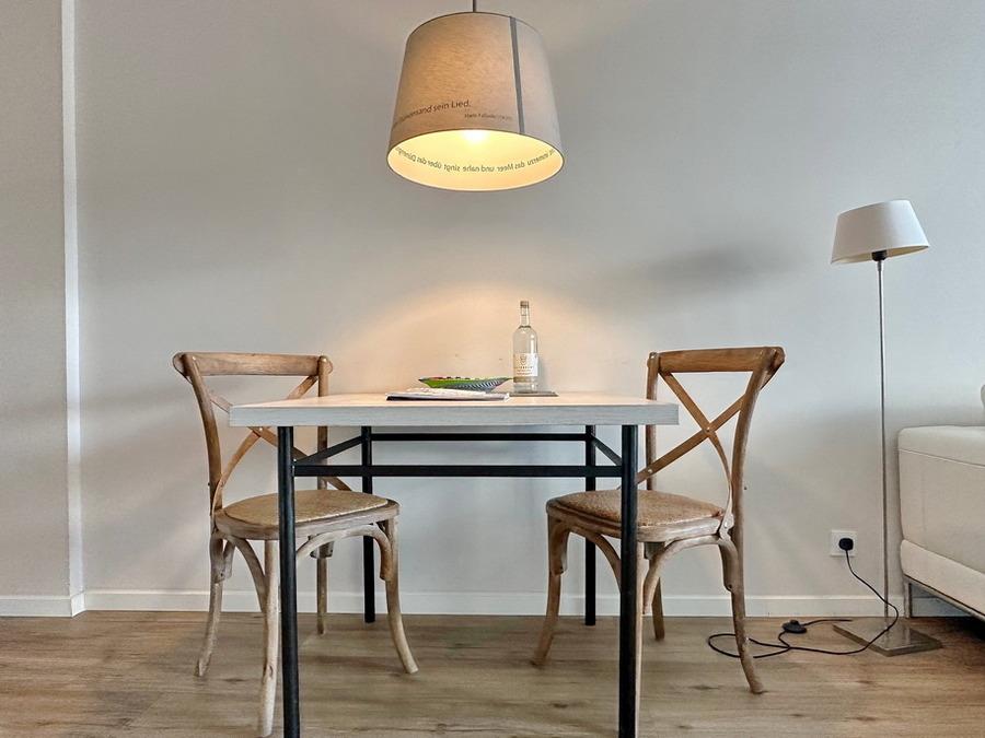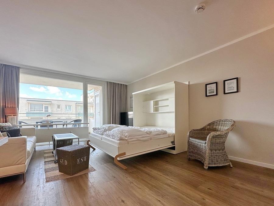 Hübsche 1,5-Zimmer-City-Wohnung mit Südbalkon im 4. OG für max. 3 Personen im Haus "Eydum". Die Wohnung (ca. 48 m²) besteht aus einem kombinierten Wohn- und Schlafzimmer mit Doppelschrankbett (160*200 cm), 2-Sitzer-Couchgarnitur, Essplatz, Flat-TV, W-LAN (ohne Gewähr) und offener Küche mit Geschirrspüler, Backofen und 4-Platten-Cerankochfeld. Im Flur befinden sich die Garderobe sowie ein 5-teiliger Einbau-Kleiderschrank. Das kleine Schlafzimmer mit Einzelbett (90*200 cm) ist zum Laubengang ausgerichtet. Das Duschbad/WC mit Waschtisch ist innenliegend. Rauchen und Tierhaltung sind im Objekt nicht gestattet. 1 Pkw-Stellplatz/Garage kann kostenpflichtig gebucht werden (begrenztes Kontigent). Bettwäsche und Handtücher sind zur Anreise aufgezogen!