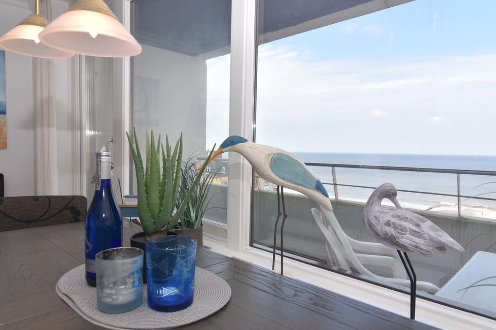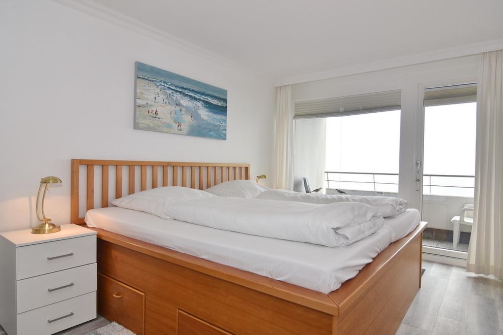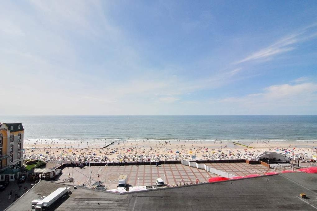 2-Zimmer-Ferienwohnung im 6. OG zur Seeseite im Haus am Meer, ca. 68 qm, Nichtraucher-Whg.! Wohnraum mit Doppelschlafcouch, Sitzecke, Eßecke, TV, Radio, Westbalkon mit Balkonmöbeln, Schlafzimmer mit exclusiven Einbauten, hohes Doppelbett mit Meeresblick und Balkon, begehbarer Kleiderschrank, 2 Bäder mit Dusche/WC, separate Küche mit Geschirrspüler und Microwelle. W-LAN ( ohne Gewähr ). PKW-Stellplatz/Garage kann kostenpflichtig gebucht werden. Bettwäsche und Handtücher sind zur Anreise aufgezogen. Tierhaltung ist nicht gestattet! Beginnend vom 15.10.2025 bis 5.4.2026 (Ostern) findet die Fassandensanierung der Landseite (Osten) sowie des Südgiebels statt. Mit Baulärm ist in dieser Zeit zu rechnen.