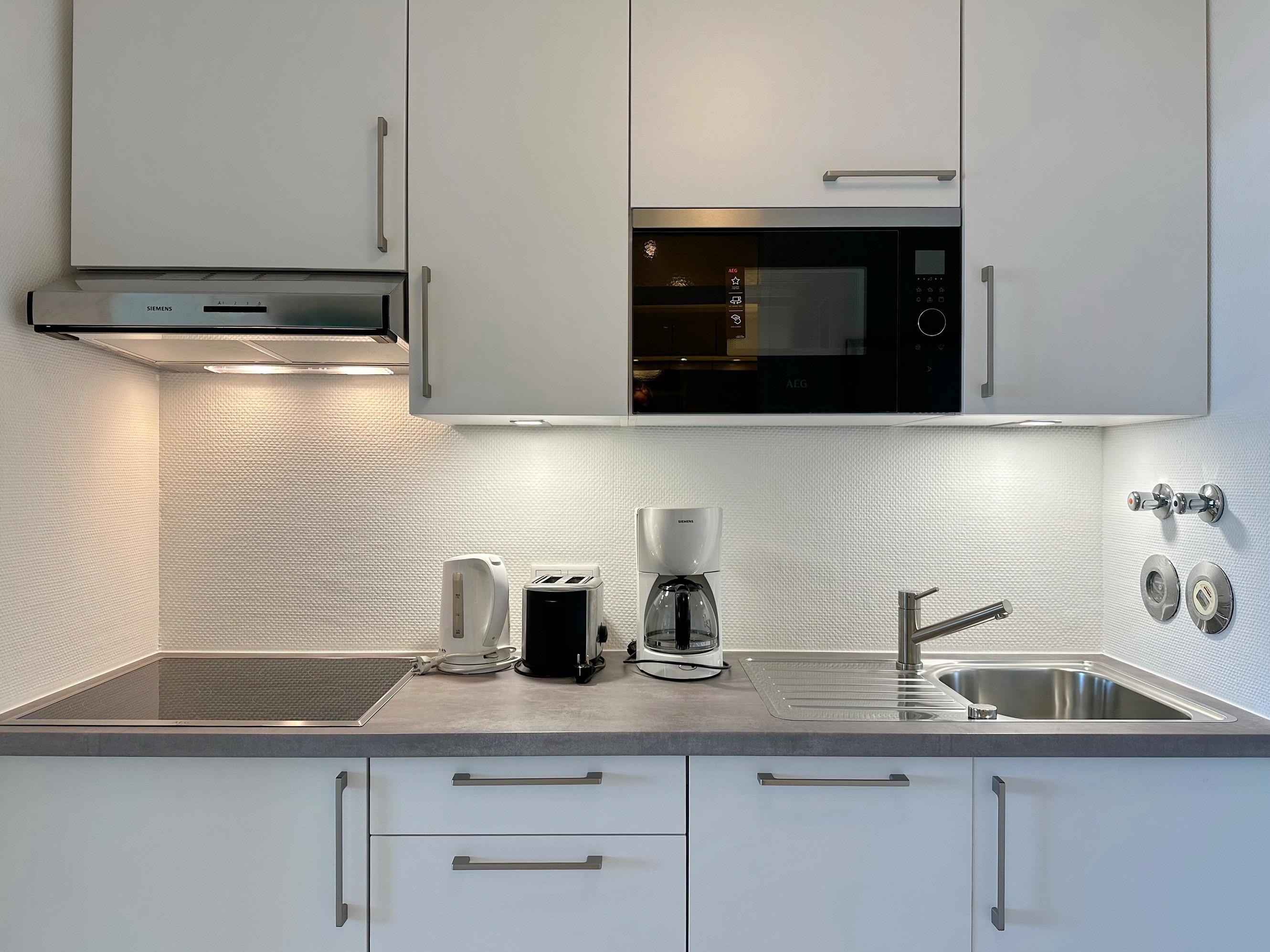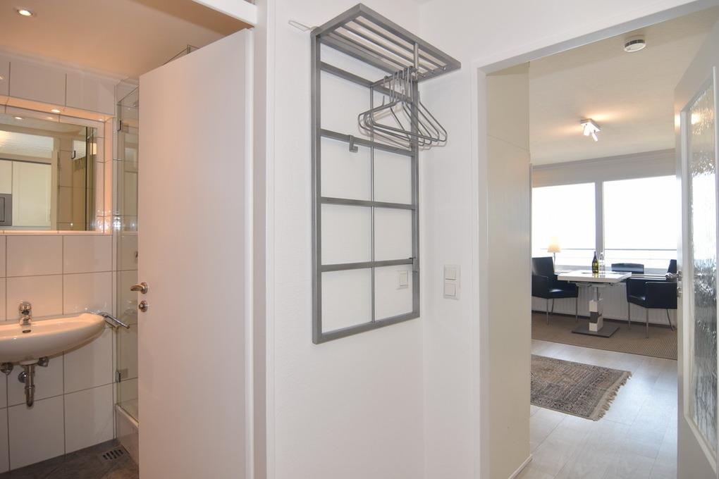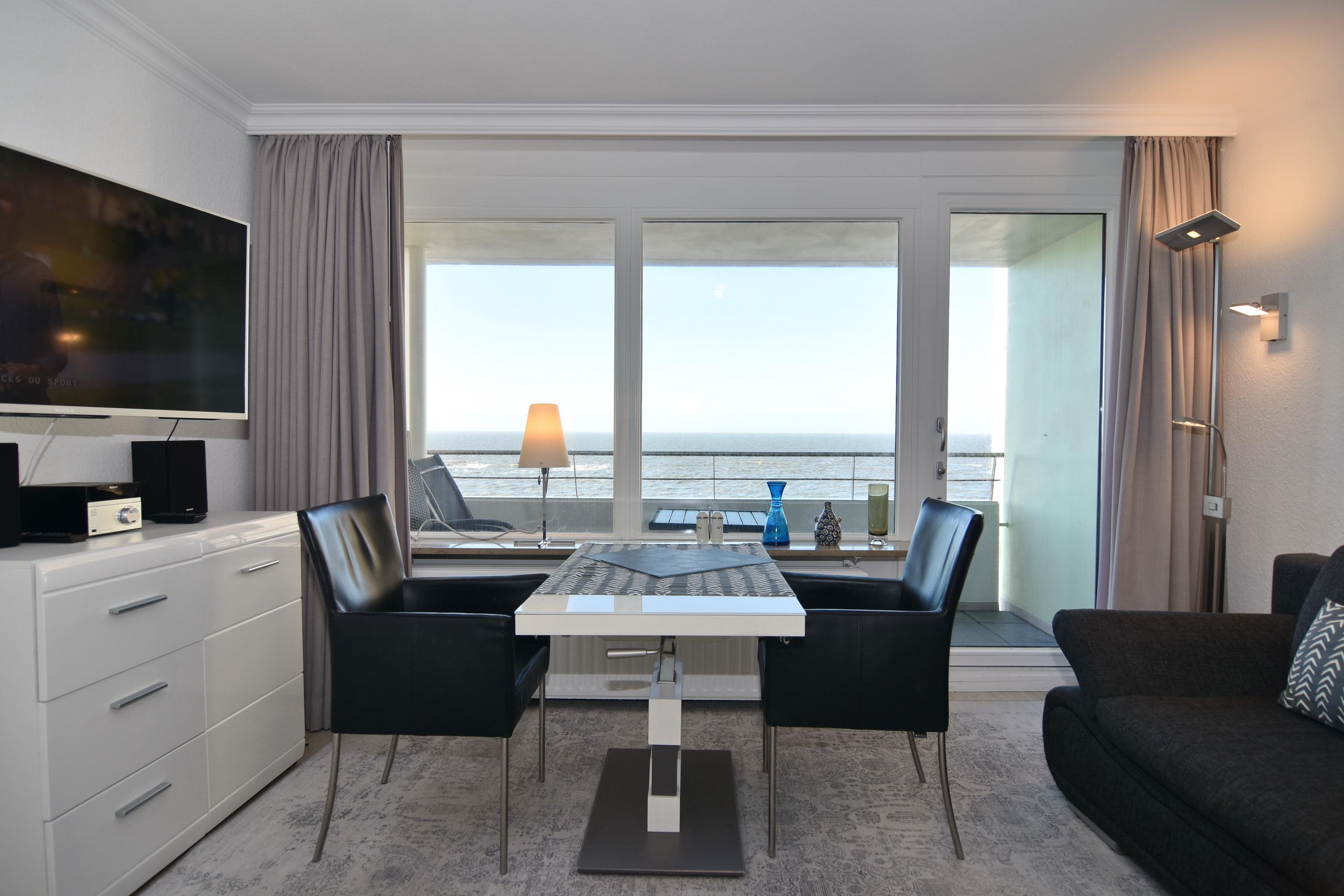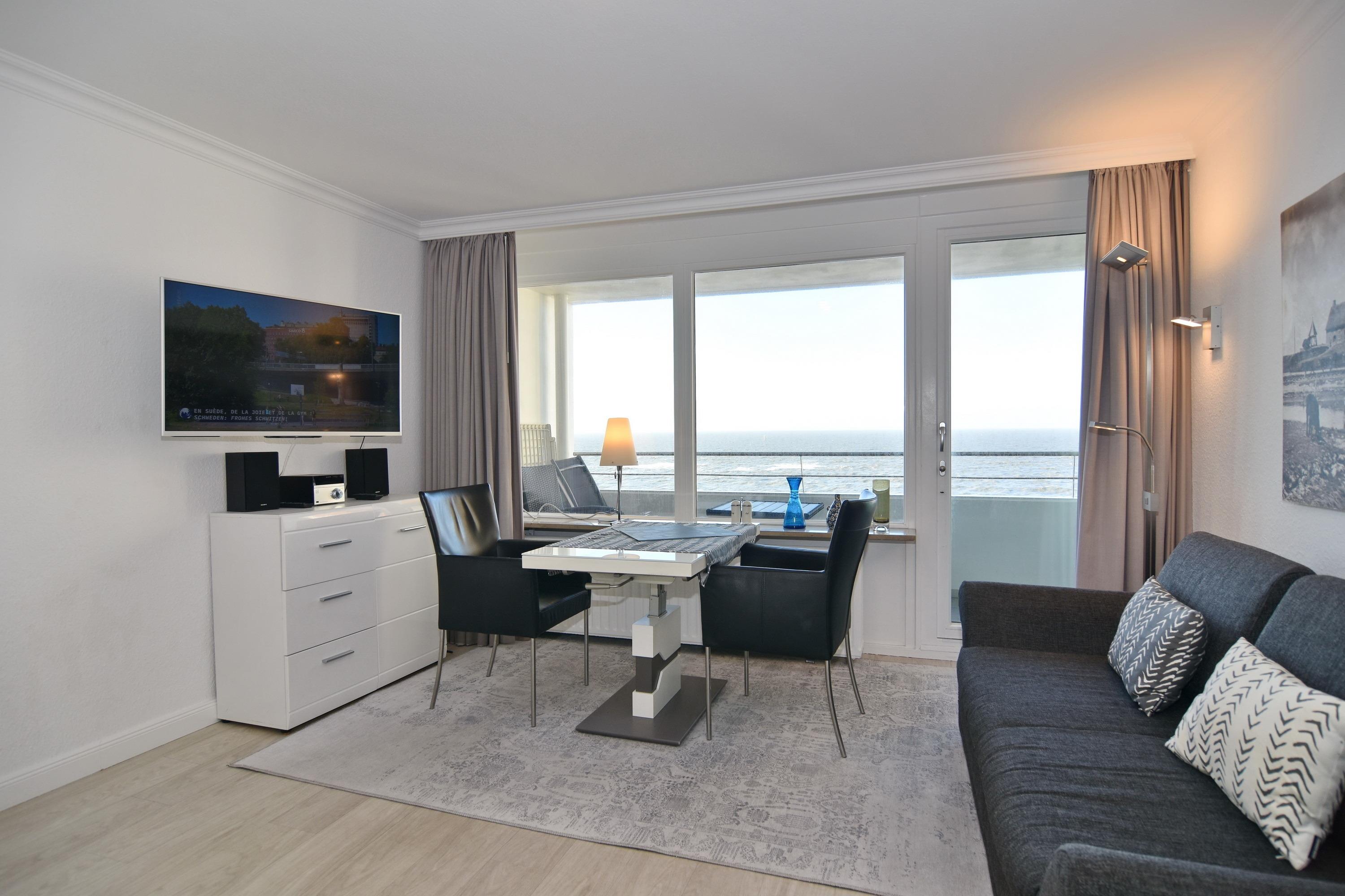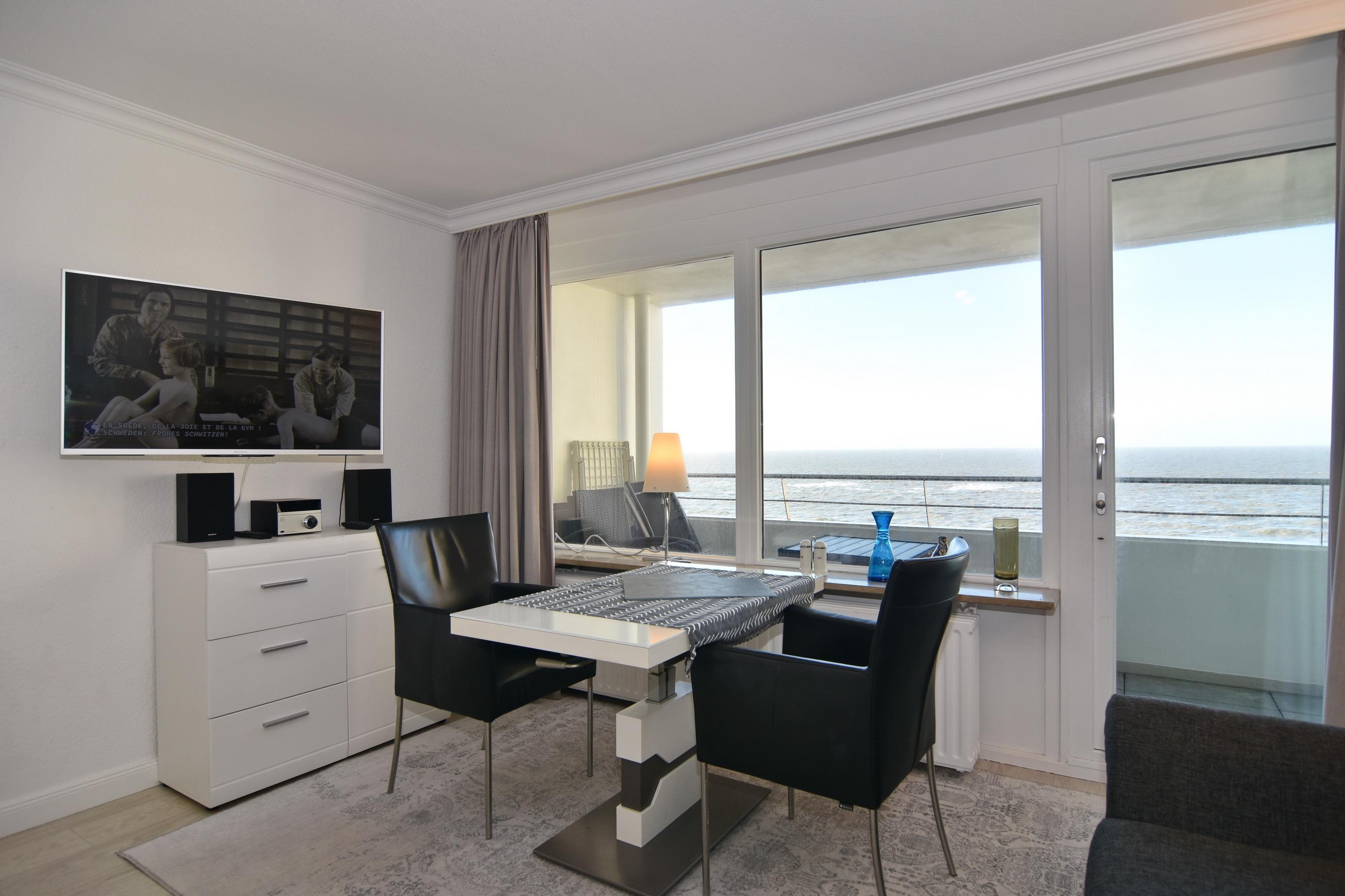 1-Zimmer-Ferienwohnung. ca. 34 m², 6.OG, Haus am Meer. Nichtraucher-Whg.! Wohn-/ Schlafraum mit Doppelschrankbett (2 Matratzen), Eßtisch am Fenster mit Blick auf das Meer, Zweisitzercouch, Flat-TV, Radio, Telefon, W-LAN (ohne Gewähr), Westbalkon mit Meeresblick und Balkonmöbeln, Küchenzeile im Flur m.Geschirrspüler u. Mikrowelle, Duschbad/WC. Tierhaltung ist nicht gestattet.[nbsp][nbsp]Das App. ist mit Design-Fußboden ausgelegt. Bettwäsche und Handtücher sind zur Anreise aufgezogen. Ein PKW-Stellplatz kann kostenpflichtig zugebucht werden.Beginnend vom 15.10.2025 bis 5.4.2026 (Ostern) findet die Fassandensanierung der Landseite (Osten) sowie des Südgiebels statt. Mit Baulärm ist in dieser Zeit zu rechnen.