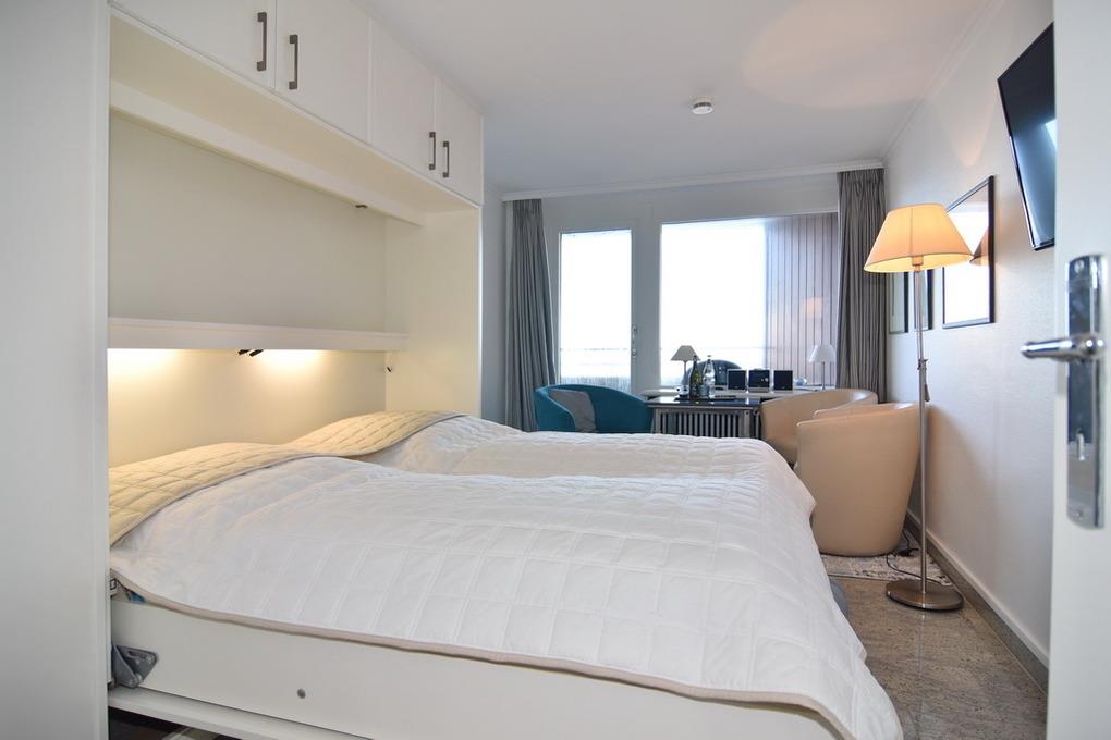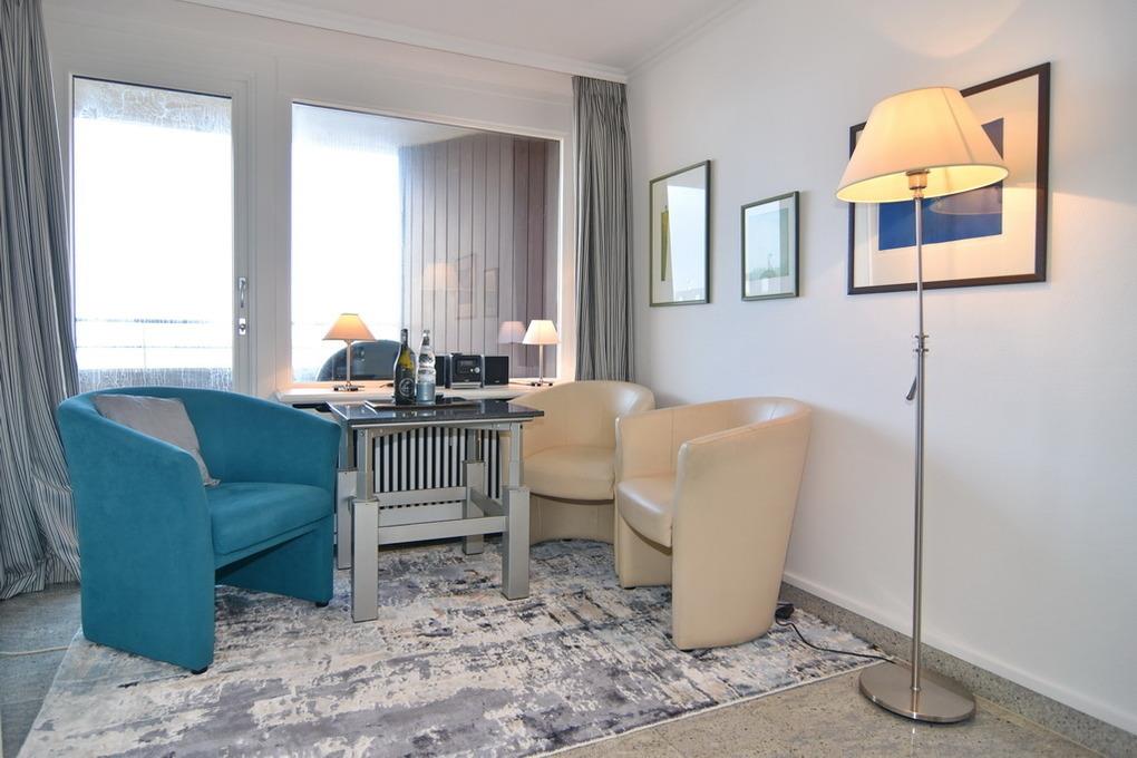 Modernes 1 Zimmer-Ferienwohnung, "Nichtraucher",3 OG.zur Seeseite,ca. 25m²,Haus am Meer. Wohn-/Schlafraum mit Einzelschrankbetten , 2 Sessel und Couchtisch( Höhenverstellbar), Flat-TV, Radio m.CD, Westbalkon mit Meeesblick u. Balkonmöbeln, Küchenzeile im Flurbereich mit Mikrowelle, Duschbad/WC. W-LAN ( ohne Gewähr ). Das App ist komplett gefliest. Tierhaltung ist nicht gestattet. Bettwäsche und Handtücher sind zur Anreise aufgezogen. Ein PKW-Stellplatz kann kostenpflichtig zugebucht werden. Beginnend vom 15.10.2025 bis 5.4.2026 (Ostern) findet die Fassandensanierung der Landseite (Osten) sowie des Südgiebels statt. Mit Baulärm ist in dieser Zeit zu rechnen.