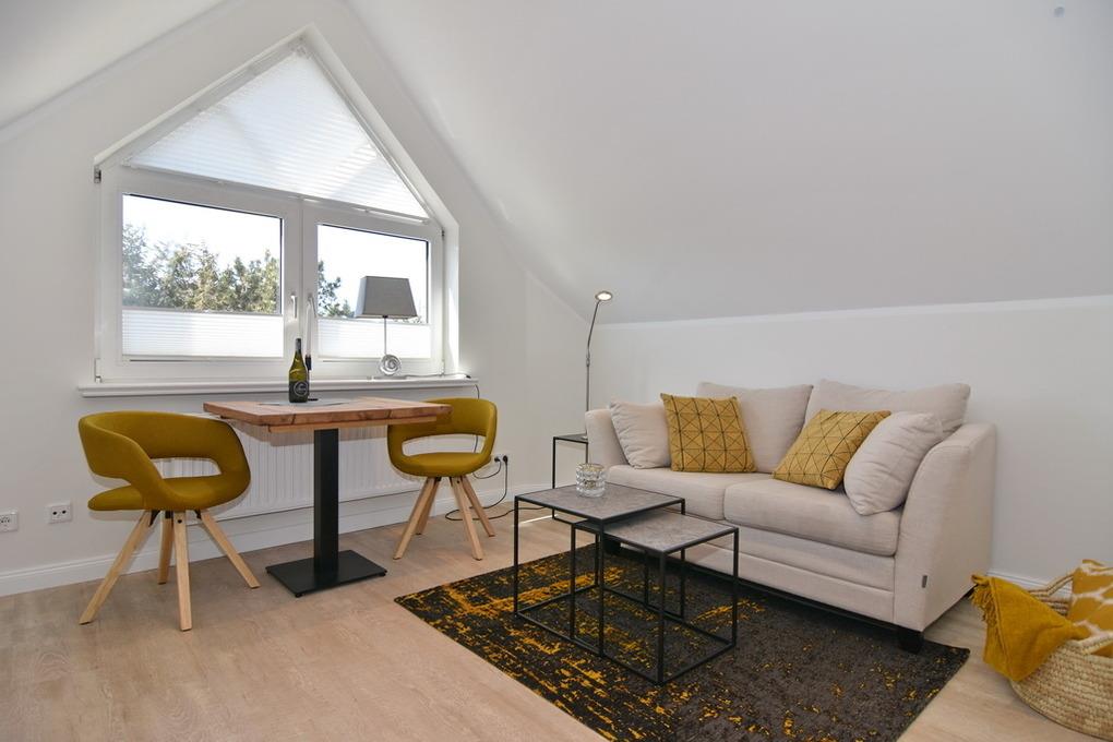 Wunderschönes 2-Zimmer-Apartment im Dachgeschoß mit moderner Ausstattung im Haus "Luv". Ca. 35 m², Nichtraucher. Schönes Wohnzimmer mit moderner Kochzeile, Essplatz, bequeme 2-Sitzer-Couch, Flat-TV, Radio, W-LAN (ohne Gewähr). Duschbad/WC, separater Schlafraum mit Box-Spring-Doppelbett (2x90x200) und Einbauschrank. Kostenlose Nutzung des Schwimmbades und der Sauna. Münzwaschmaschine und -trockner. Parken ist an der Straße möglich. Tierhaltung nicht gestattet. Bettwäsche und Handtücher sind zur Anreise aufgezogen!