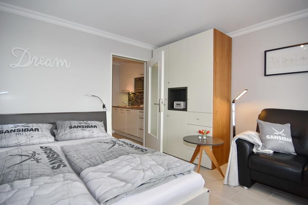 Attraktive 1-Zimmer-Ferienwohnung im 5. OG des Haus "Metropol". (Nichtraucher) Wohn-/ Schlafraum mit Doppelbett (2 Matratzen á 80 cm), Essplatz am Fenster, 2-Sitzer-Couch, Flat-TV, Radio, DVD und Blu Ray Player. W-Lan (ohne Gewähr). Moderne Küchenzeile mit Mikrowelle und Geschirrspüler im Flurbereich, Duschbad/WC. Ostbalkon mit Blick über Westerland. Tierhaltung ist nicht gestattet. Das Appartement ist mit Parkett ausgelegt. Bettwäsche und Handtücher sind zur Anreise aufgezogen. Ein PKW-Stellplatz kann kostenpflichtig zugebucht werden.