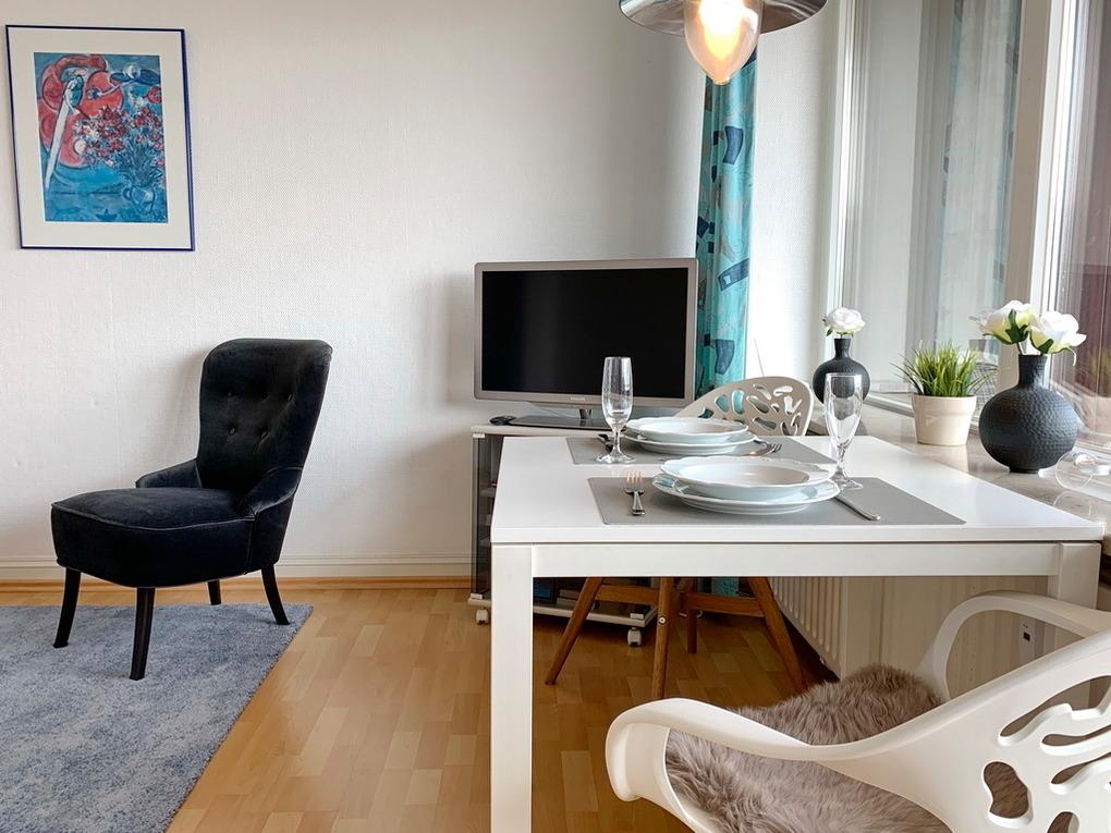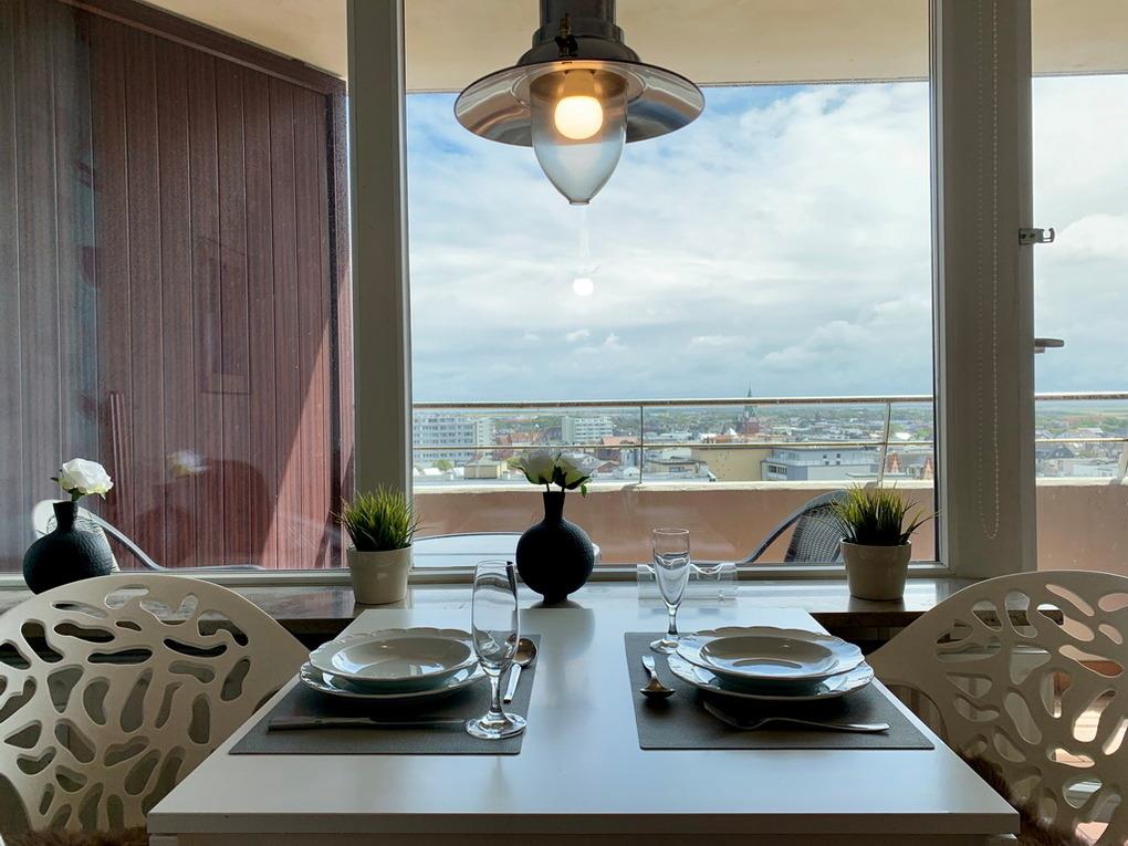 Moderne Ausstattung und abgestimmte Dekoration dürften Sie schon jetzt in Urlaubsstimmung versetzen. Die schöne 1-Zimmer-Ferienwohnung liegt im 7.OG des Haus "Metropol" und hat einen tollen Blick über die Insel. Das Meer liegt nur einen Katzensprung entfernt. Die Nichtraucher-Wohnung teilt sich in ein Wohn-/Schlafzimmer mit Einzelschrankbetten, Sitzecke, Eßplatz am Fenster, Flat-TV, W-Lan (ohne Gewähr), Ostbalkon mit Balkonmöbeln und Blick über die Insel, einen Küchen-/Flurbereich mit Küchenzeile mit Backofen und einem weißen Duschbad/WC. Das Apartment ist mit Laminat ausgelegt. Tierhaltung ist hier nicht gestattet. Bettwäsche und Handtücher sind zur Anreise aufgezogen. Ein PKW-Stellplatz kann kostenpflichtig zugebucht werden.