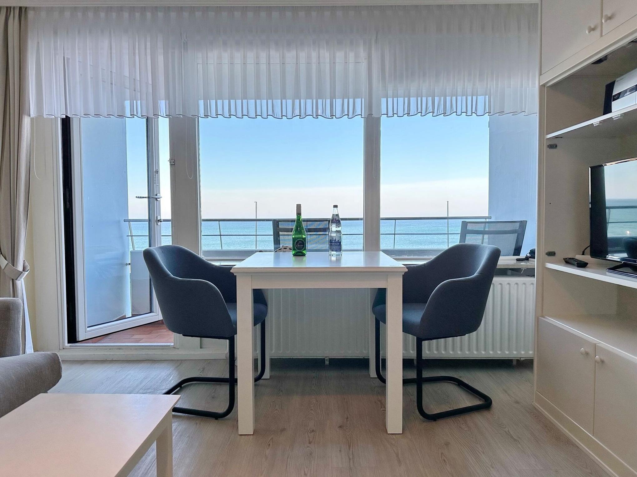 Sie wohnen in einer schicken 1-Zimmer-Ferienwohnung mit ca. 34 qm im 1.OG vom Haus Metropol. Die Wohnung ist für 2 Personen komplett ausgestattet und verfügt über einen Wohn-/Schlafraum mit Doppelschrankbett (2x80x200), das von beiden Seiten aus begehbar ist, hat eine 2er-Couch und einen Essplatz am Fenster. Die Küchenzeile im Flurbereich ist mit 2-Plattenherd, Geschirrspüler und Mikrowelle ausgestattet. Das Duschbad mit WC und Fön. Zudem hat die Wohnung einen Fernseher mit Radiofunktion und WLAN (ohne Gewähr). Der möblierte Westbalkon mit Blick auf das Meer und die Promenade läd ein zum Verweilen. Tierhaltung und Rauchen sind nicht gestattet. Bettwäsche und Handtücher sind zur Anreise aufgezogen. Ein PKW-Stellplatz kann kostenpflichtig zugebucht werden.