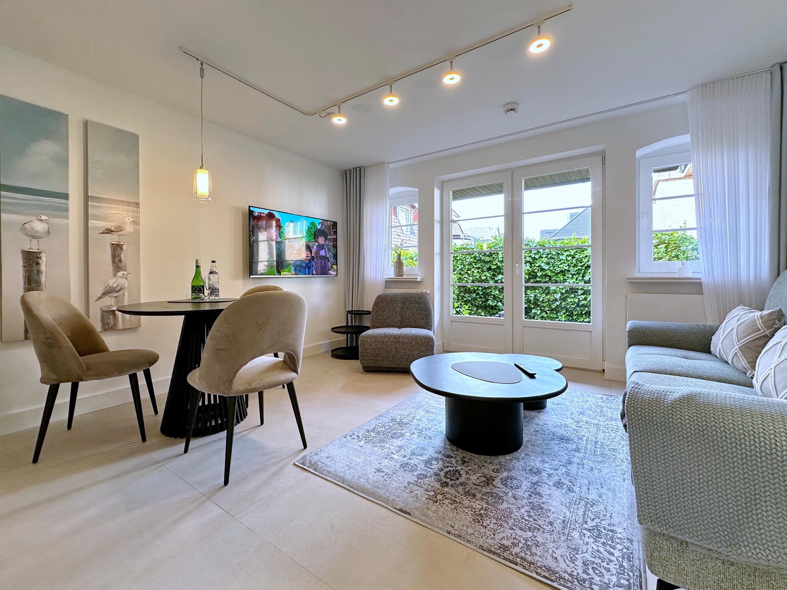 Die Wohnanlage "Olympia" bietet eine zentrale Lage in kurzer Entfernung zur Promenade, dem Badestrand und dem Meer. Auch die Fußgängerzone ist nur wenige Gehminuten entfernt. Die 2-Zimmer-Wohnung wurde im Jahr 2025 renoviert und ist für 2 Personen geeignet. Sie hat eine Größe von ca. 43 m² und besteht aus einem Wohn- und Esszimmer mit Couchecke, Essplatz und integrierter Küche. Die Küche ist mit einem Induktionskochfeld, einem Geschirrspüler und einer Mikrowelle mit Grillfunktion ausgestattet. Vom Wohnzimmer aus gelangt man auf die geschützte und möblierte Südterrasse. Im Schlafzimmer befindet sich ein Box-Spring-Doppelbett, Einbauschränke und ein weiterer Flat-TV. Das moderne Duschbad verfügt über ein Fenster. Im Dielenbereich befinden sich Einbauschränke und eine Garderobe für Jacken und andere Dinge. WLAN steht zur Verfügung, jedoch ohne Gewähr. Das Mitbringen von Haustieren und das Rauchen sind nicht gestattet. Bei Anreise sind Bettwäsche und Handtücher bereits aufgezogen. Die Wohnanlage verfügt über einen Schwimmbad- und Saunabereich sowie einen zusätzlichen Wellnessbereich mit finnischer Sauna, Dampfsauna und Ruhebereich. Fahrzeuge können gegen Gebühr und vorheriger Anmeldung in der Tiefgarage abgestellt werden. Eine Waschmaschine und ein Trockner stehen kostenfrei zur Verfügung. Für Fahrräder gibt es einen Abstellbereich in der Garage.