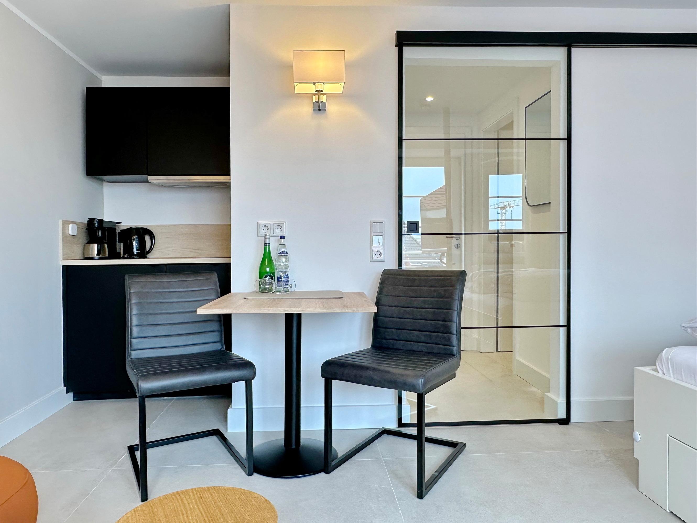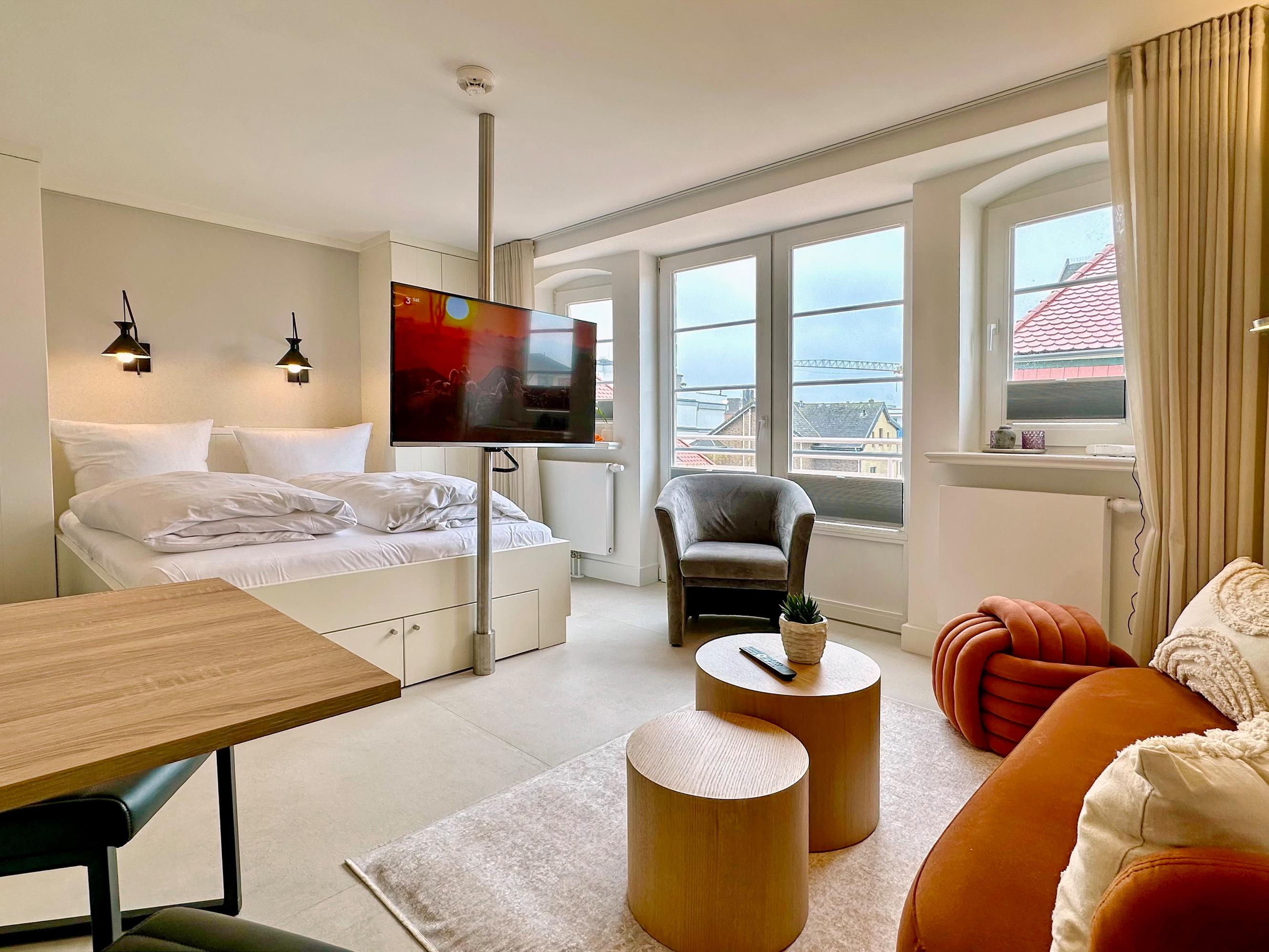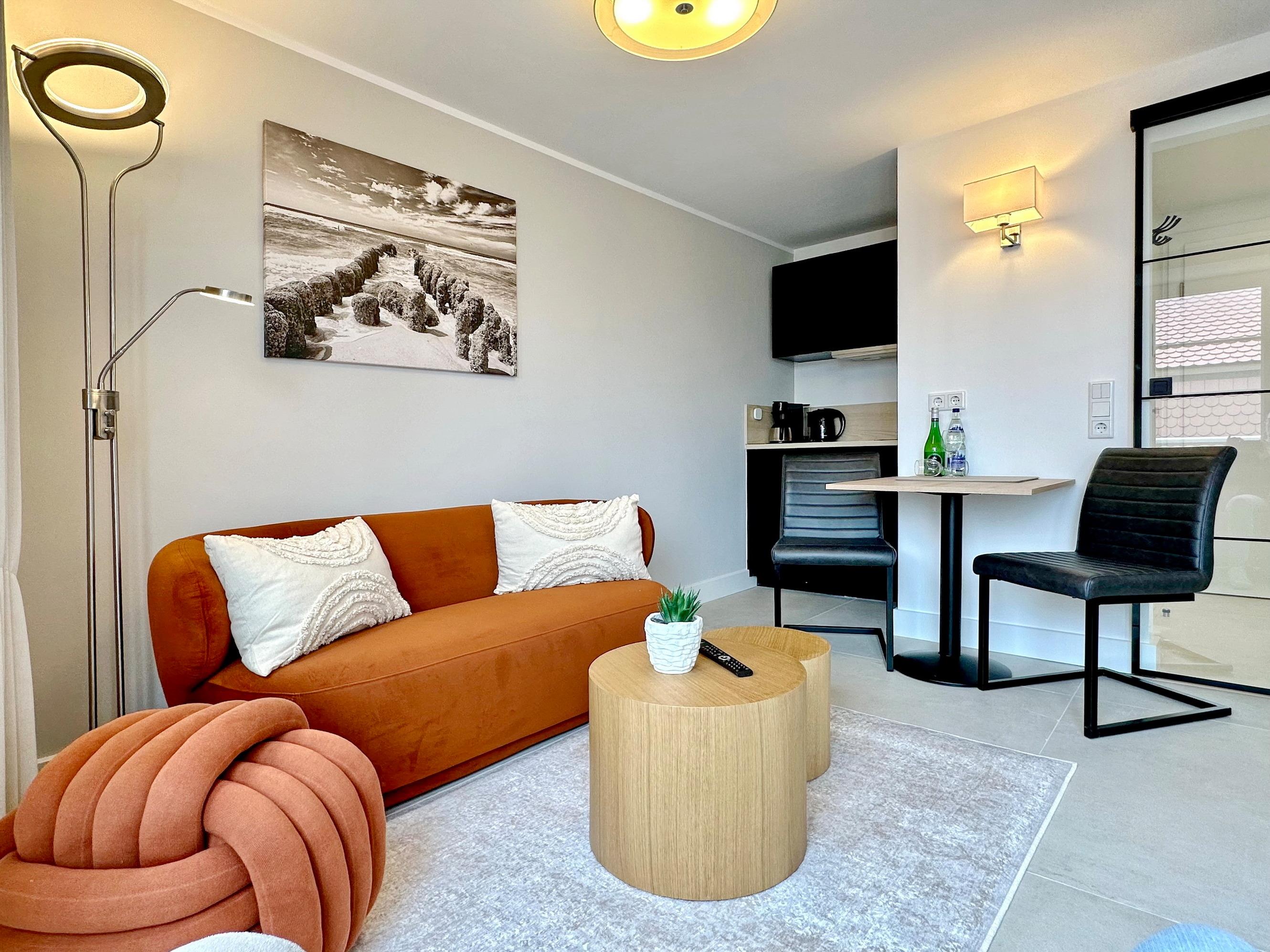 Die Wohnanlage "Olympia" bietet eine zentrale Lage in kurzer Entfernung zur Promenade, dem Badestrand und dem Meer. Auch die Fußgängerzone ist nur wenige Gehminuten entfernt. Die 1-Zimmer-Wohnung liegt im 2. Obergeschoss, wurde im Jahr 2025 von Grund auf renoviert und ist für 2 Personen ideal geeignet. Sie hat eine Größe von ca. 30 m² und besteht aus einem Wohn- und Schlafzimmer mit Doppelbett, Einbauschränken, Couch und Essplatz sowie einer geschützten Südbalkon mit Gartenmöbeln. Das TV-Gerät ist schwenkbar, sodass sowohl vom Bett als von Couch ferngesehen werden kann. Die integrierte Küche ist mit einem Induktionskochfeld, einem Geschirrspüler und einer Mikrowelle mit Grillfunktion ausgestattet. Das moderne Duschbad ist vom Dielenbereich erreichbar. In der Diele befinden sich Einbauschränke und eine Garderobe für Jacken und andere Dinge. WLAN steht zur Verfügung, jedoch ohne Gewähr. Das Mitbringen von Haustieren und das Rauchen sind nicht gestattet. Bei Anreise sind Bettwäsche und Handtücher bereits aufgezogen. Die Wohnanlage verfügt über einen Schwimmbad- und Saunabereich sowie einen zusätzlichen Wellnessbereich mit finnischer Sauna, Dampfsauna und Ruhebereich. Fahrzeuge können gegen Gebühr und vorheriger Anmeldung in der Tiefgarage abgestellt werden. Waschmaschinen und ein Trockner stehen kostenfrei zur Verfügung. Für Fahrräder gibt es einen Abstellbereich in der Garage.