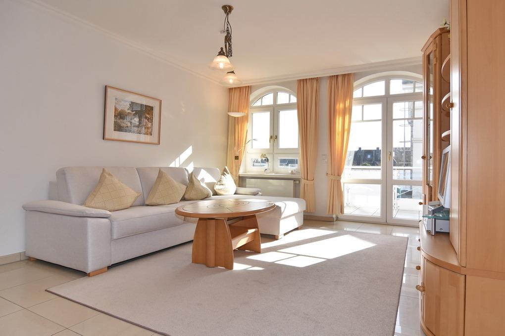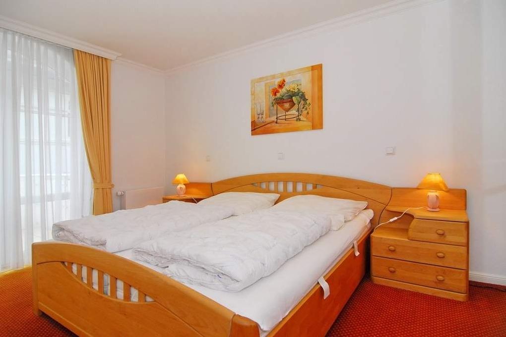 Schöne 2-Zimmer-Ferienwohnung im Haus " Residenz Bismarck", ca. 60 m² im 1.OG. Wohnraum mit Couchecke und Esstisch, Kabel-TV, Radio, Südbalkon mit Balkonmöbeln, offene Küche mit Geschirrspüler, Mikrowelle und Backofen, Schlafzimmer mit Doppelbett und Zugang zum Balkon, großes Bad mit Dusche und Wanne, Flur mit Garderobe. App. ist außer im Schlafzimmer gefliest. Garagenstellplatz Nr. 11. Tierhaltung ist verboten. Fahrradkeller und Waschküche vorhanden. Im Haus befinden sich ein Schwimmbad und eine Sauna. Bettwäsche und Handtücher sind zur Anreise aufgezogen.