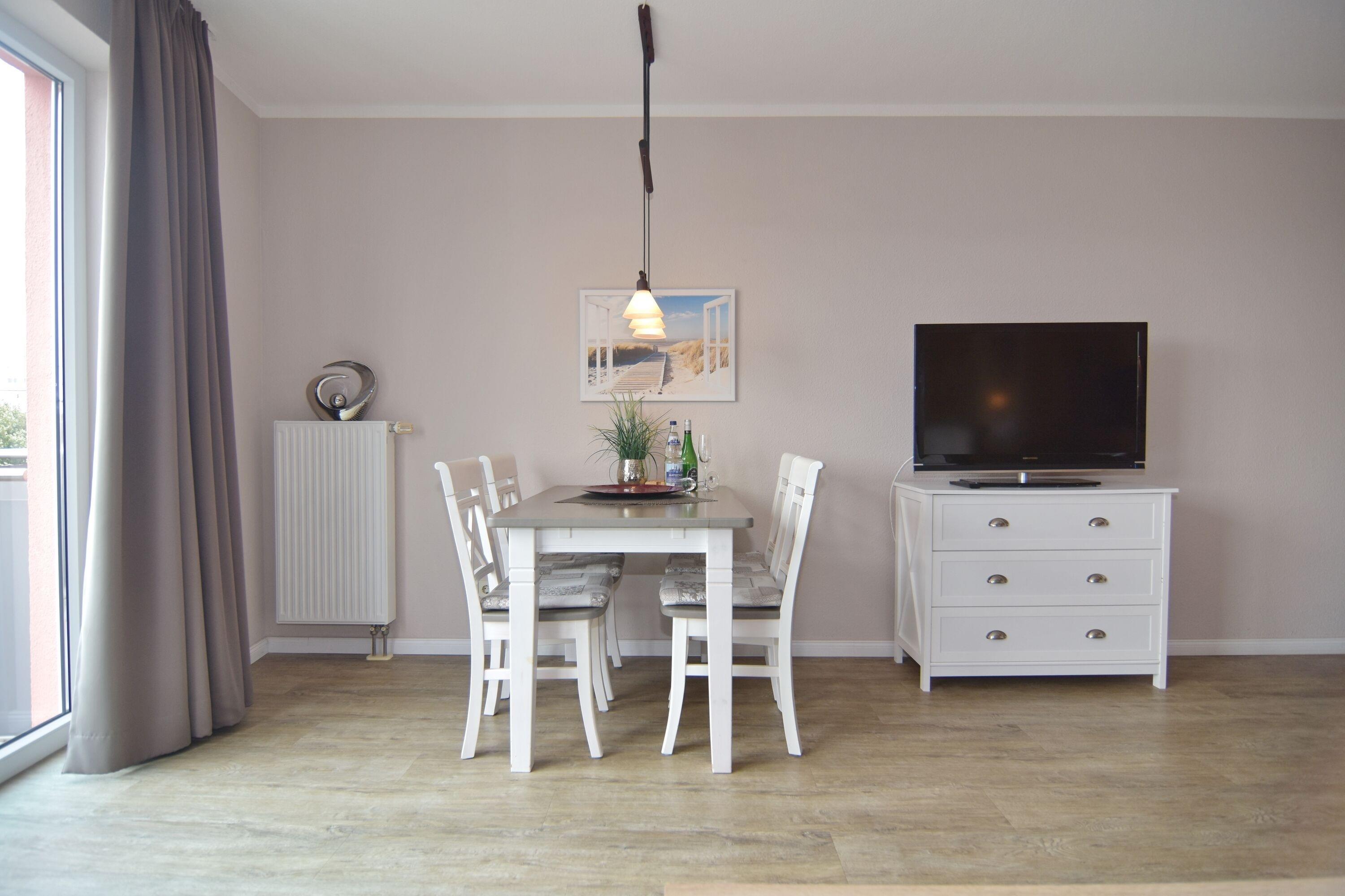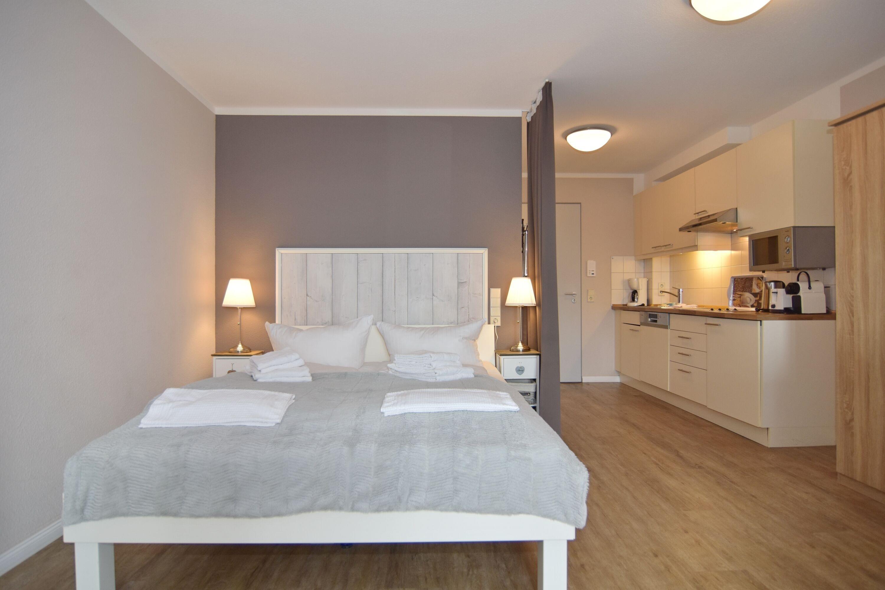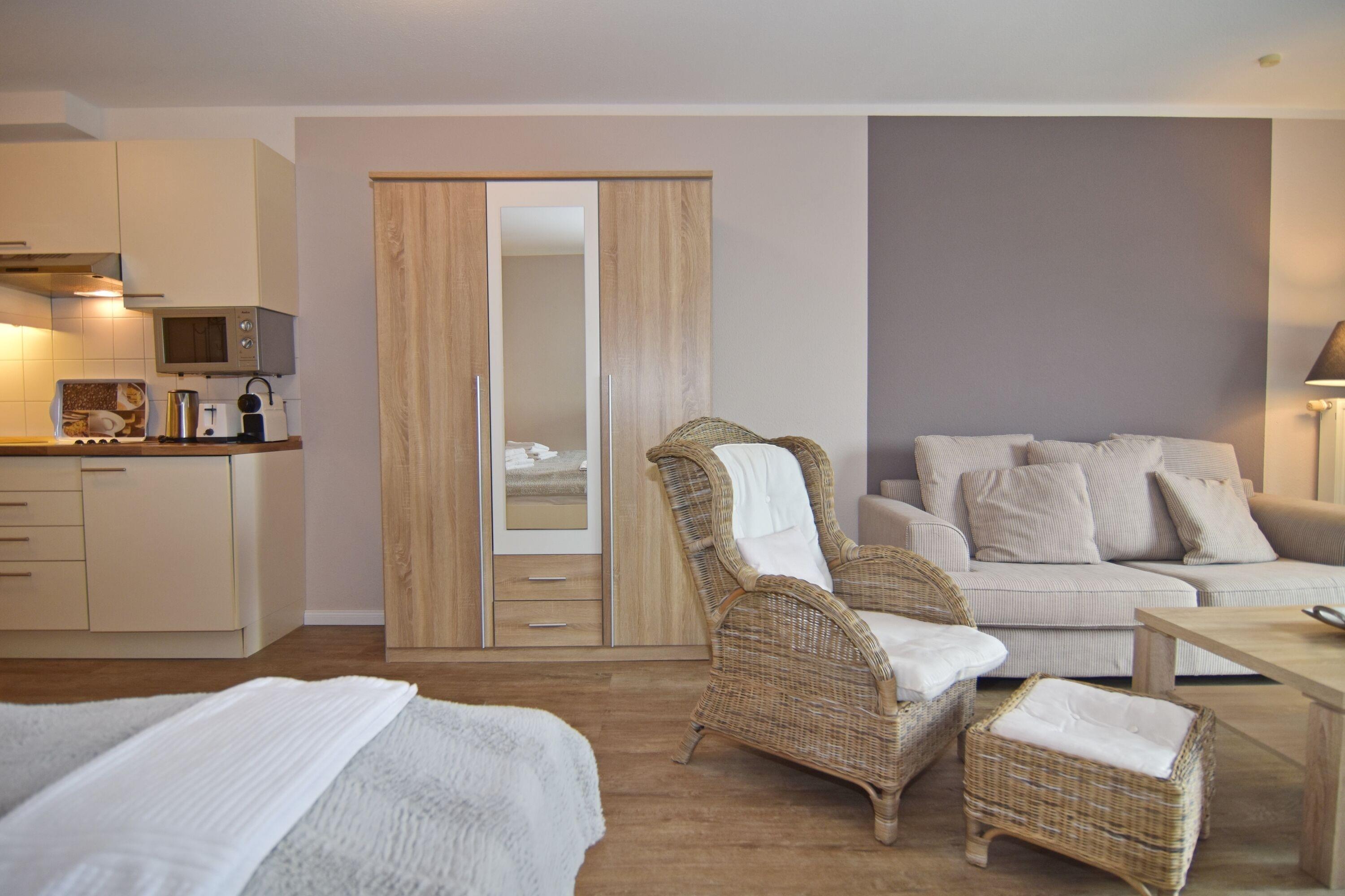 Moderne 1-Zimmer-Ferienwohnung im roten Haus, ca. 36m², 2. OG. Nichtraucher-Whg.! Wohn-/Schlafraum mit Südbalkon, Doppelbett, Essplatz, 2-Sitzer-Couch und Sessel, Kabel-TV, Küchenzeile mit Geschirrspüler und Mikrowelle, Nespressomaschine, Duschbad/WC. Internetanschluß (ohne Gewähr). Waschküche und Fahrradkeller im Nebenhaus "Mauritius". Pkw-Stellplatz kann kostenpflichtig hinzugebucht werden. Bettwäsche und Handtücher sind zur Anreise aufgezogen! Tierhaltung ist nicht gestattet.