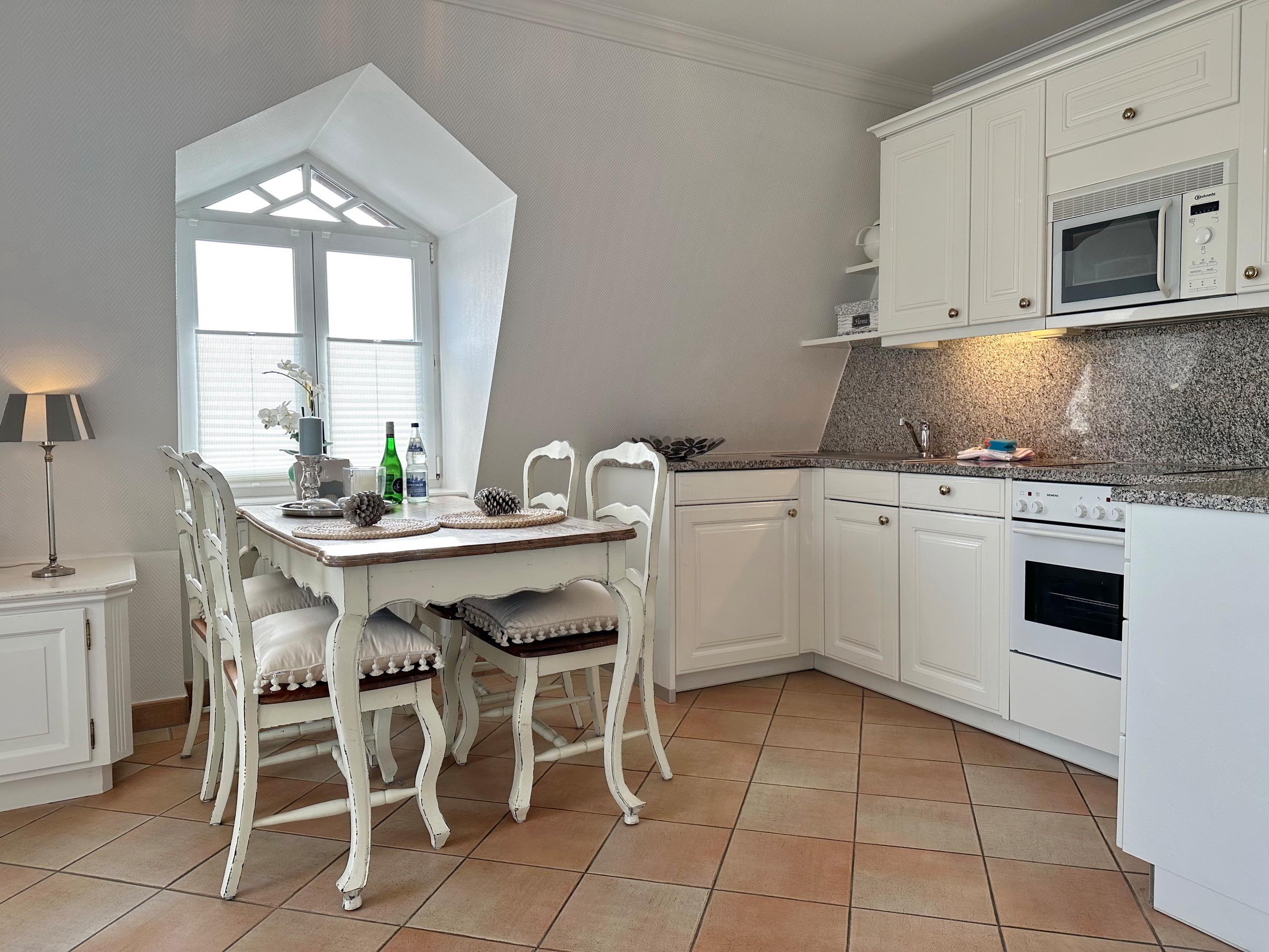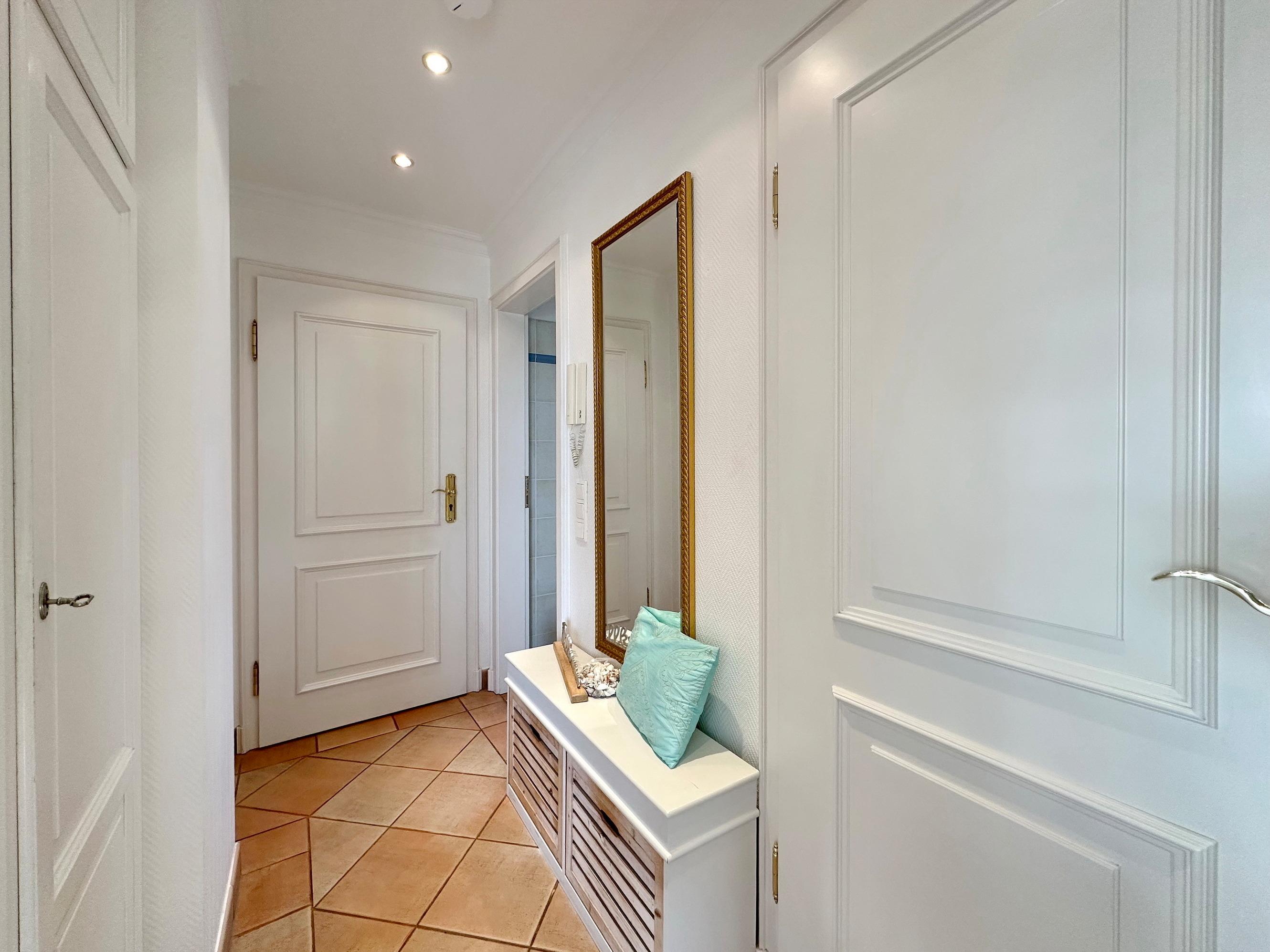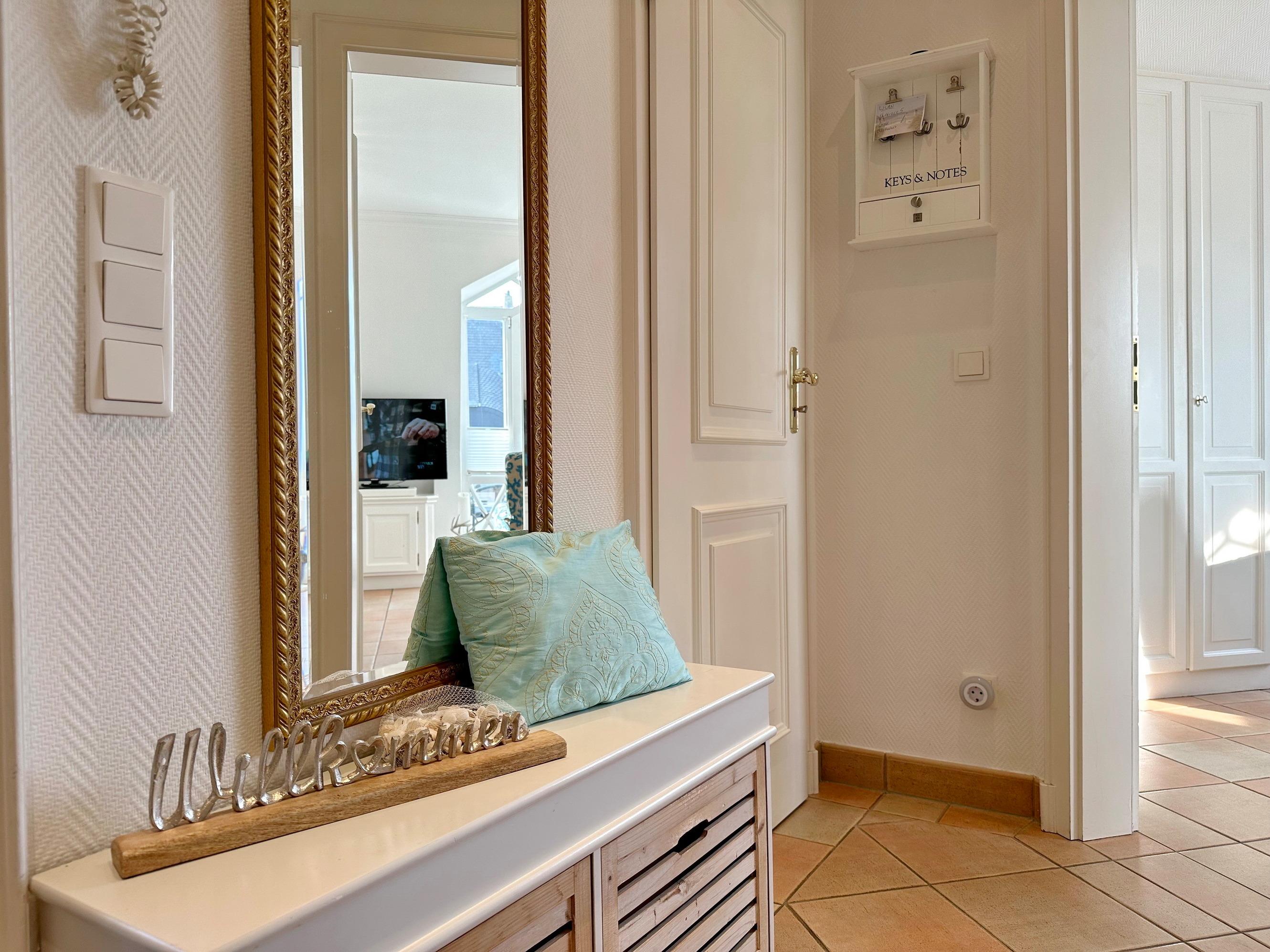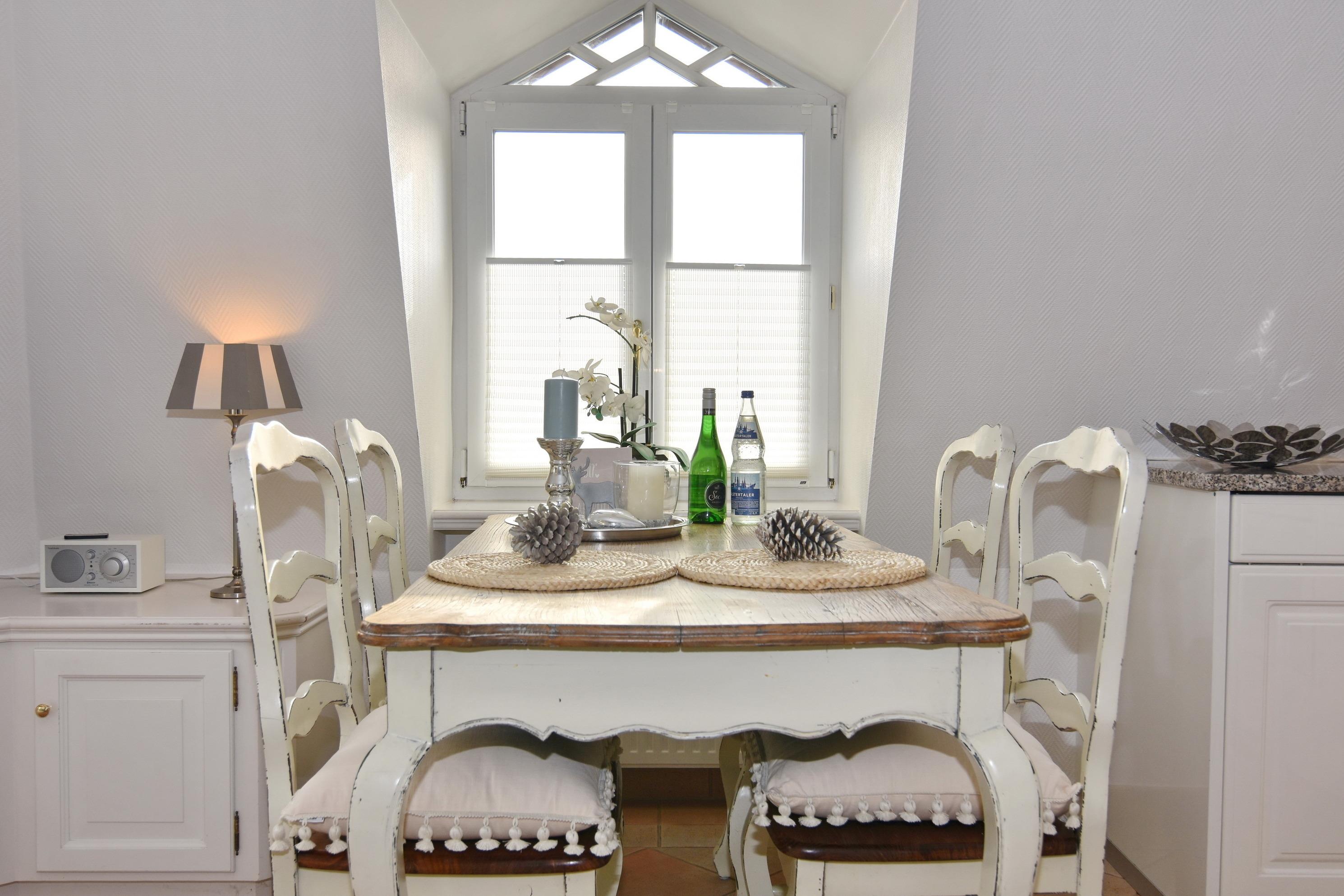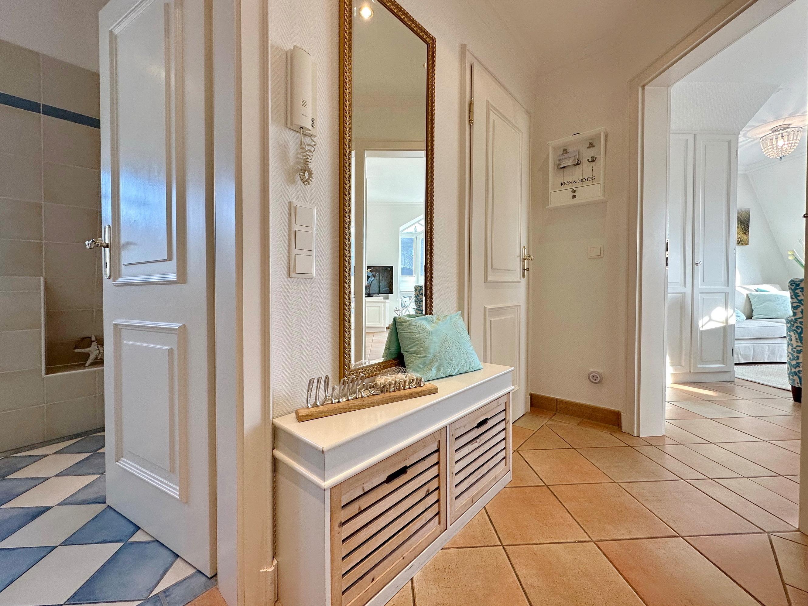 Sie betreten die Wohnung im 1. Obergeschoss und gelangen vom Flur in den Wohnbereich sowie ins Badezimmer mit Wanne und Duschvorrichtung. In einer kleinen Abseite befindet sich ein Wasch-/Trockner. Der Wohnraum bietet Ihnen eine gemütliche Sitzecke bestehend aus Sofa und Sessel, einen Essplatz für 4 Personen und die offene Küche mit Geschirrspüler, Mikrowelle, Backofen, Nespresso-Maschine und kompletter Küchenausstattung. Vom Wohnzimmer gelangen Sie auf den möblierten Südbalkon. Eine Treppe führt Sie in das darüberliegende Schlafzimmer mit Doppelbett (2 Matratzen + 1 Topper 1,60 x 2,00m), Einbauschrank und Flat-TV. Das Schlafzimmer hat eine Tür. Bettwäsche und Handtücher sind zur Anreise aufgezogen.