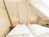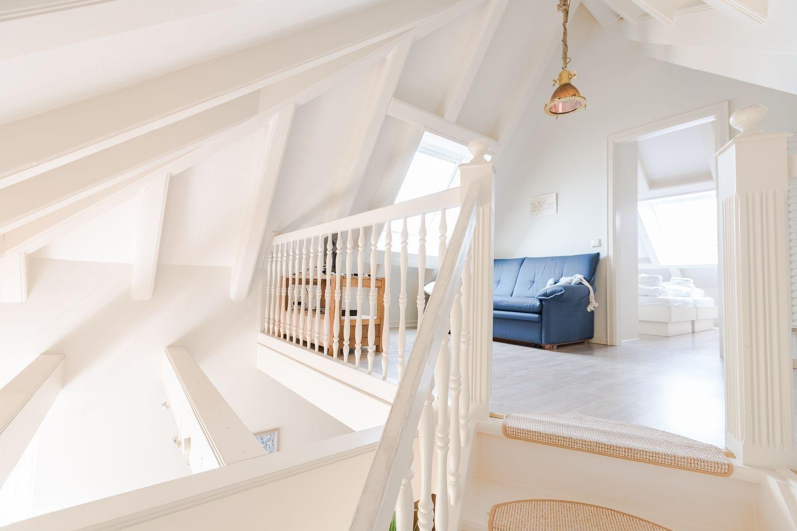 • Eine weiße Friesentreppe führt nach oben auf die kuschelige Galerie, wo ein weiterer Fernseher zur Verfügung steht; hier oben finden Sie auch die beiden Schlafräume (der größere Raum beinhaltet ein Doppelbett, der andere zwei gegenüberstehende Betten).