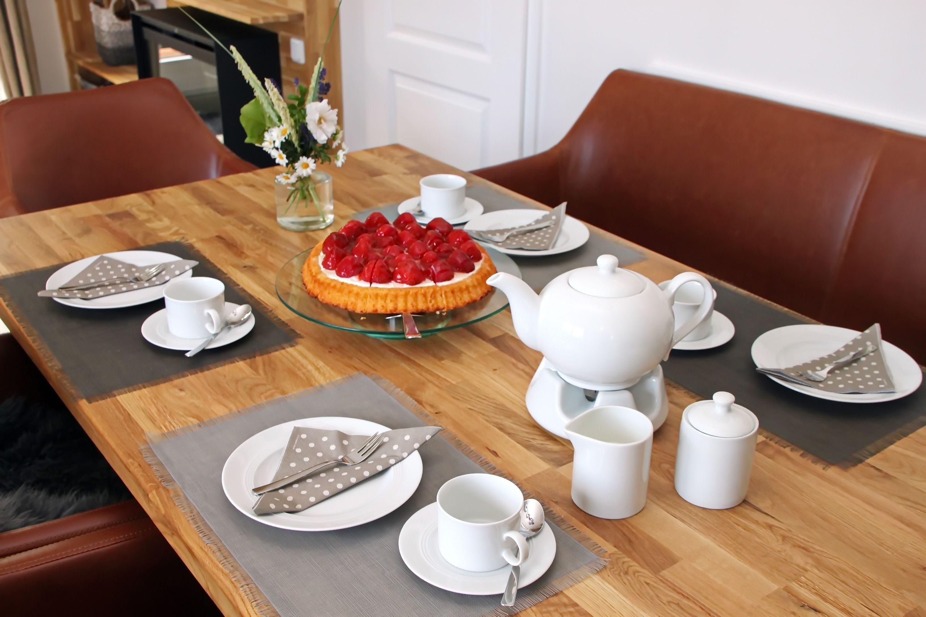 Küchenausstattung: zweier Induktionskochfeld, sowie eine weitere zweier Induktionskochplatte, Backofen mit Mikrowelle, entsprechendes Koch- Back- und Mikrowellenzubehör, Senseopad-und Kaffeemaschine, Handmixer, Pürierstab, Toaster, Raclette, Waffeleisen und Wasserkocher, Spülmaschine und Kühlschrank mit Gefrierfach.
