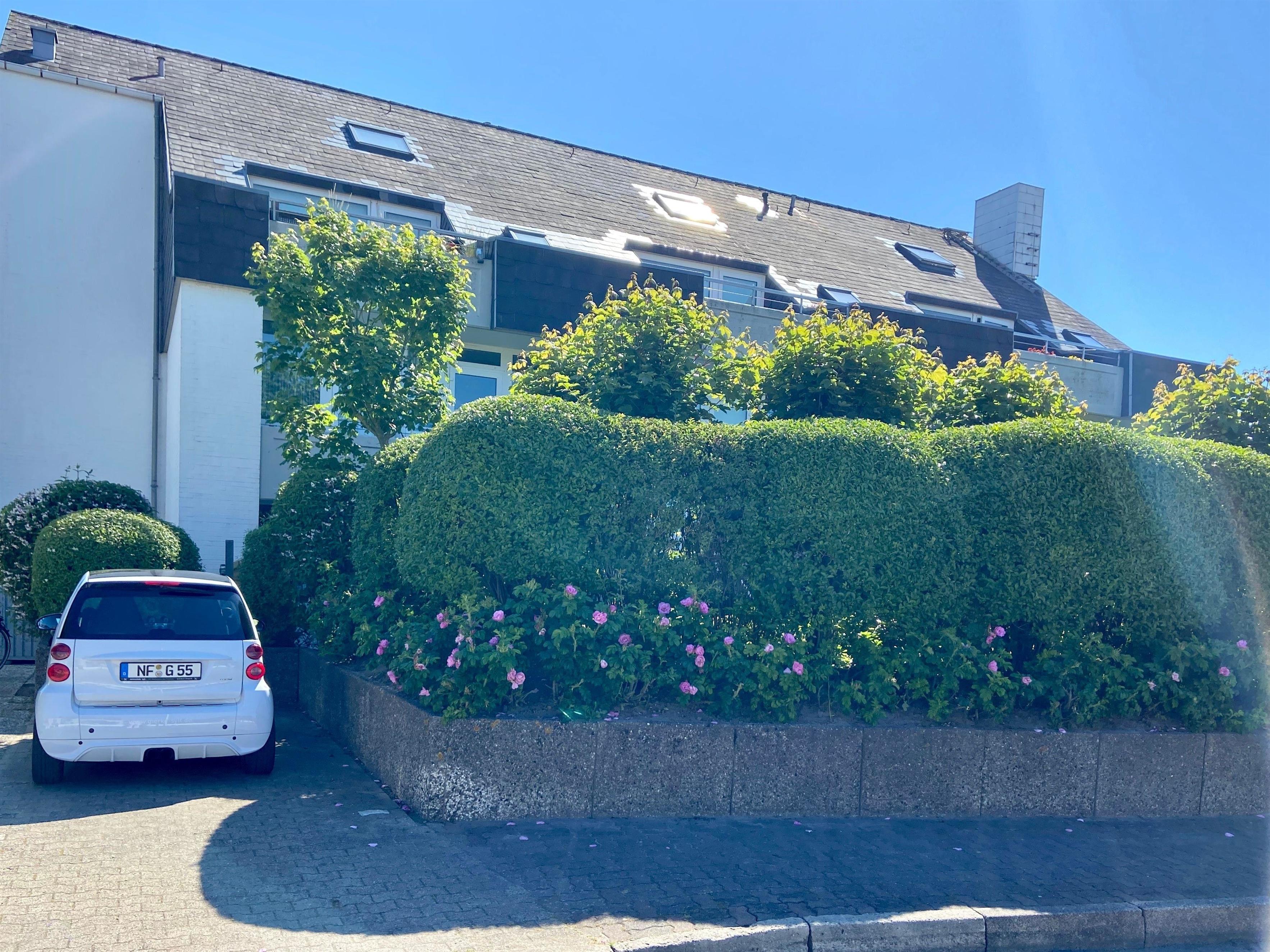 Eine Terrasse mit Gartenmöbeln ist vorhanden. Der PKW-Stellplatz ist direkt am Haus, die Fahrradplätze direkt vor dem Hauseingang.