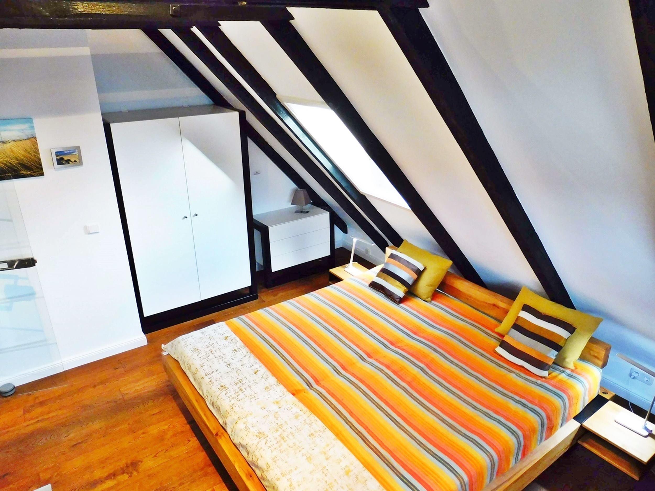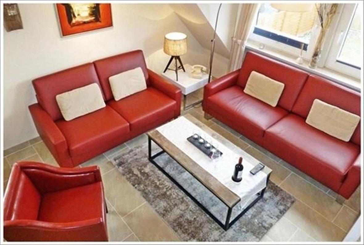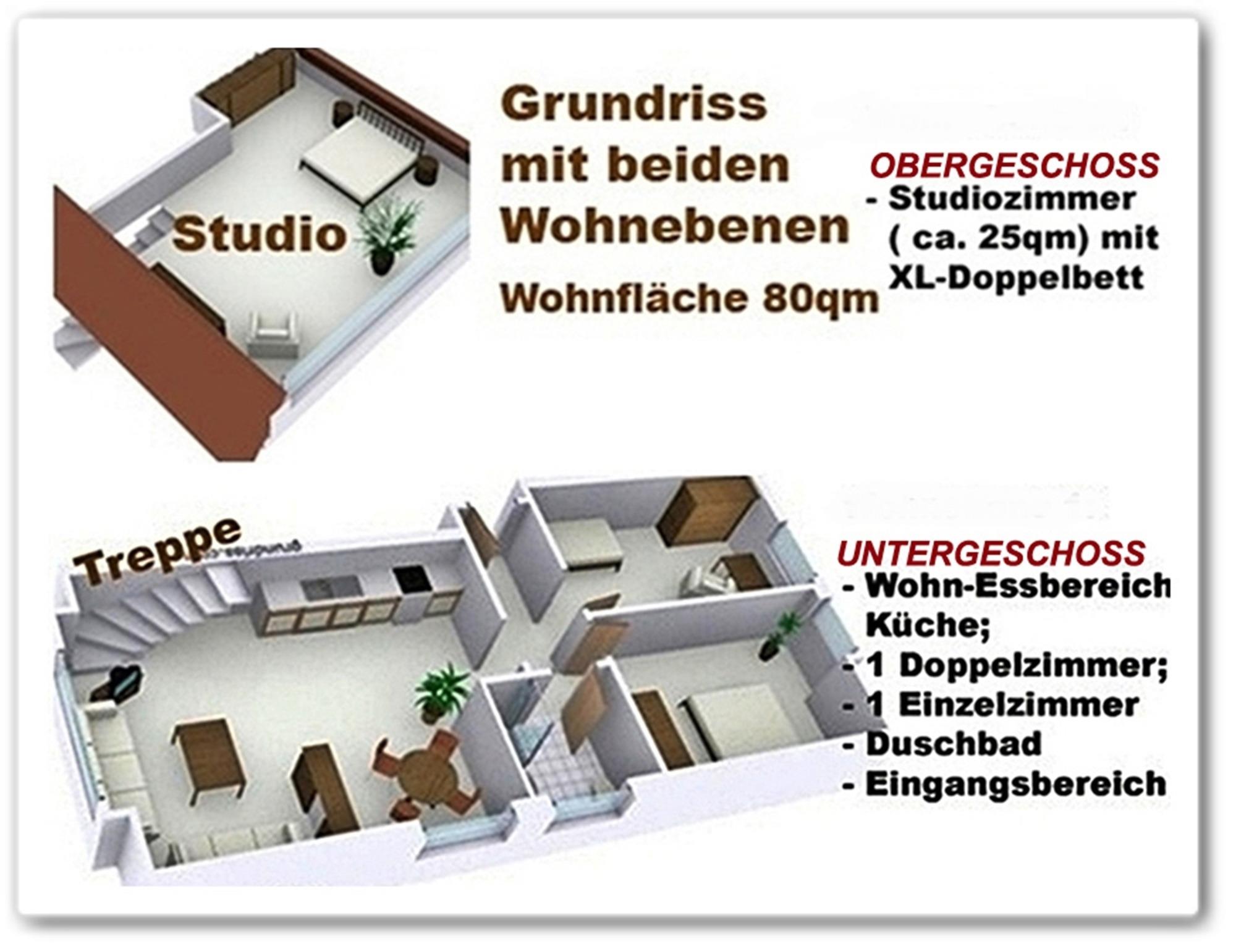 Eine Innentreppe führt in die OBERE ETAGE ins 2. Doppelzimmer ( sog. Studio mit 25 qm) mit XL-Bett, 2. Sitzecke mit TV.