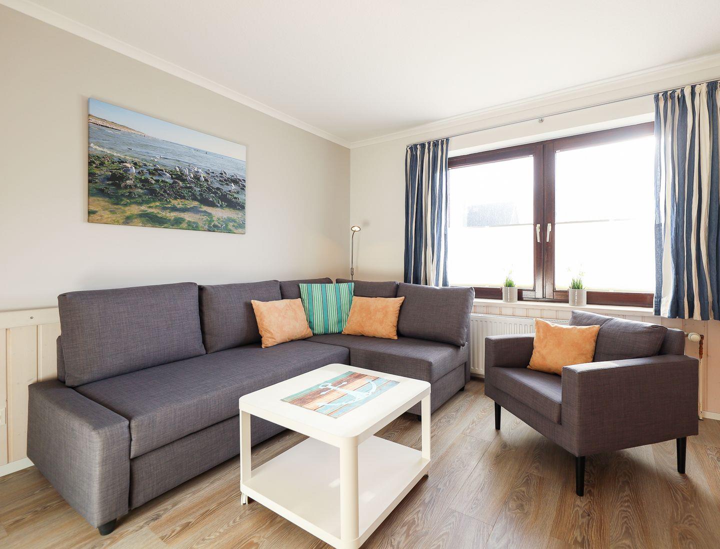 Appartement Ruus präsentiert sich im modernen Bungalow-Stil mit einer kleinen Terrasse nebst Strandkorb.