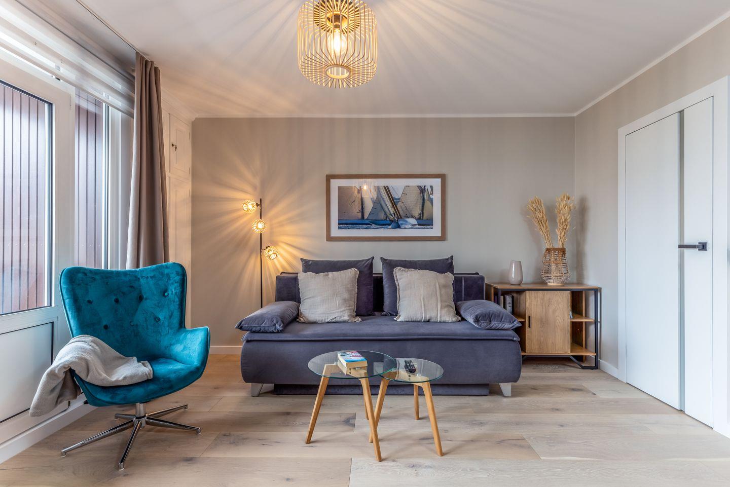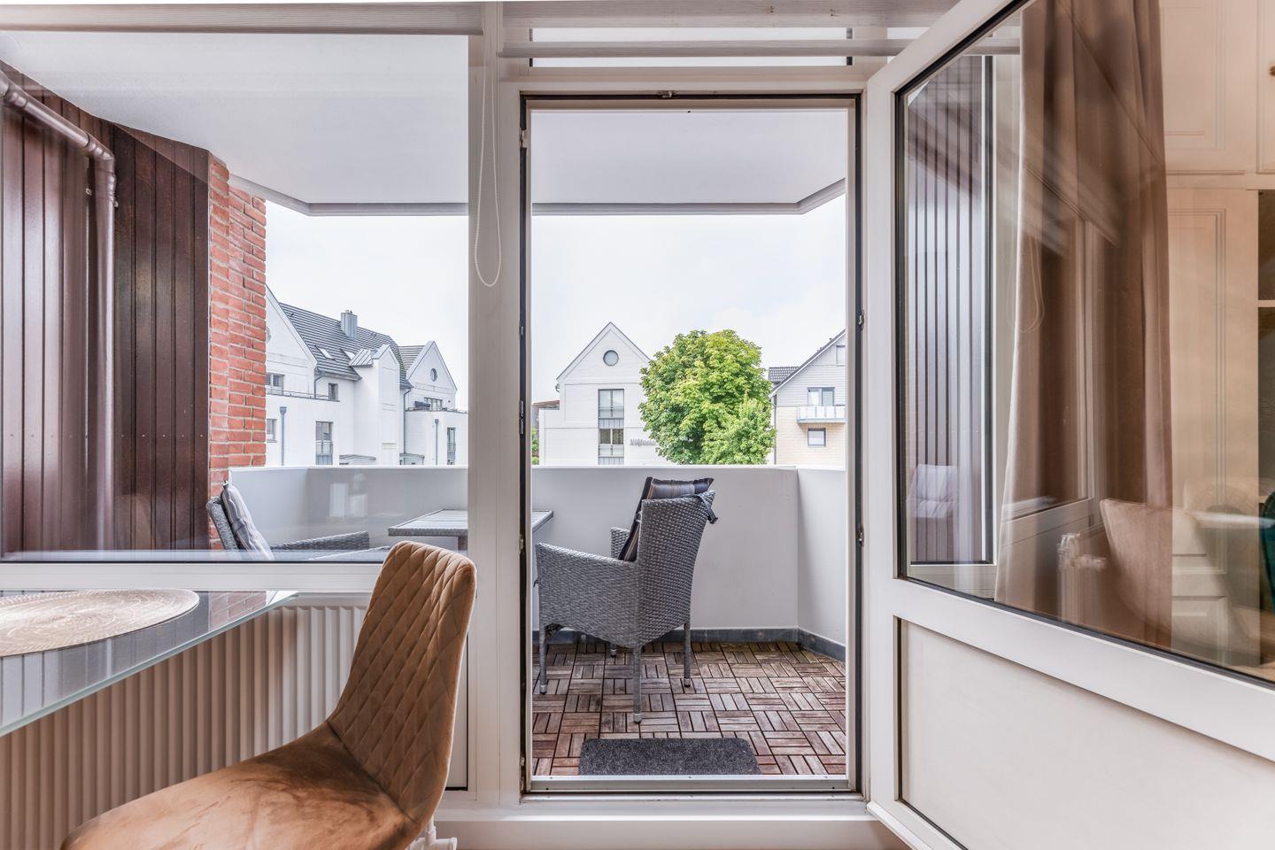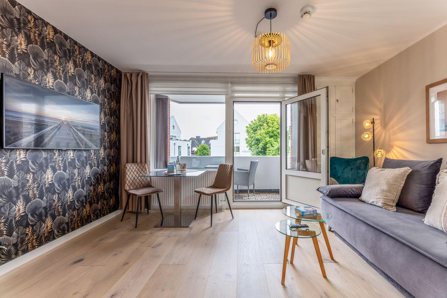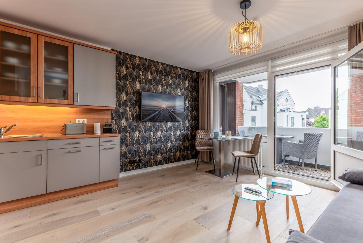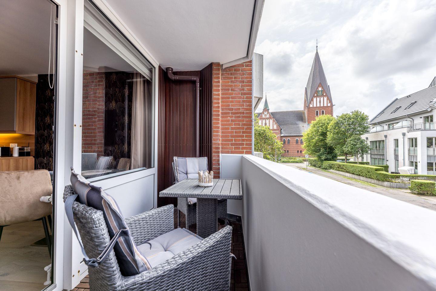 Im Flur bietet ein großer Einbauschrank ordentlich Stauraum und auch das moderne Duschbad lässt nichts vermissen. Vor der Tür wartet dann die Stadt und bereits der Blick vom Balkon Richtung Friedrichstraße macht Lust auf einen kleinen Bummel durch Westerland.