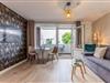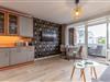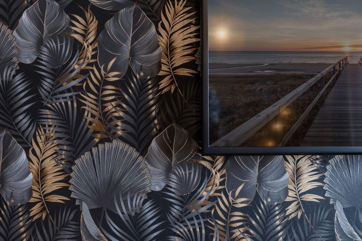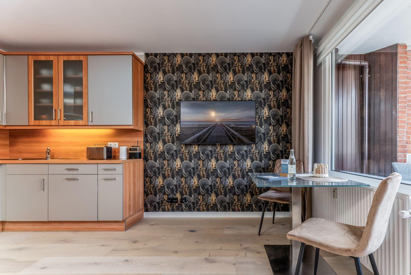 In dem großzügig geschnittenen Schlaf-/Wohn- und Essbereich finden sowohl die gemütliche Schlafcouch als auch der kleine Esstisch und die geräumige Küche bequem ihren Platz. Cooler Blickfang: die gemusterte Tapete, die einen edlen Rahmen zur stylishen Einrichtung bildet.