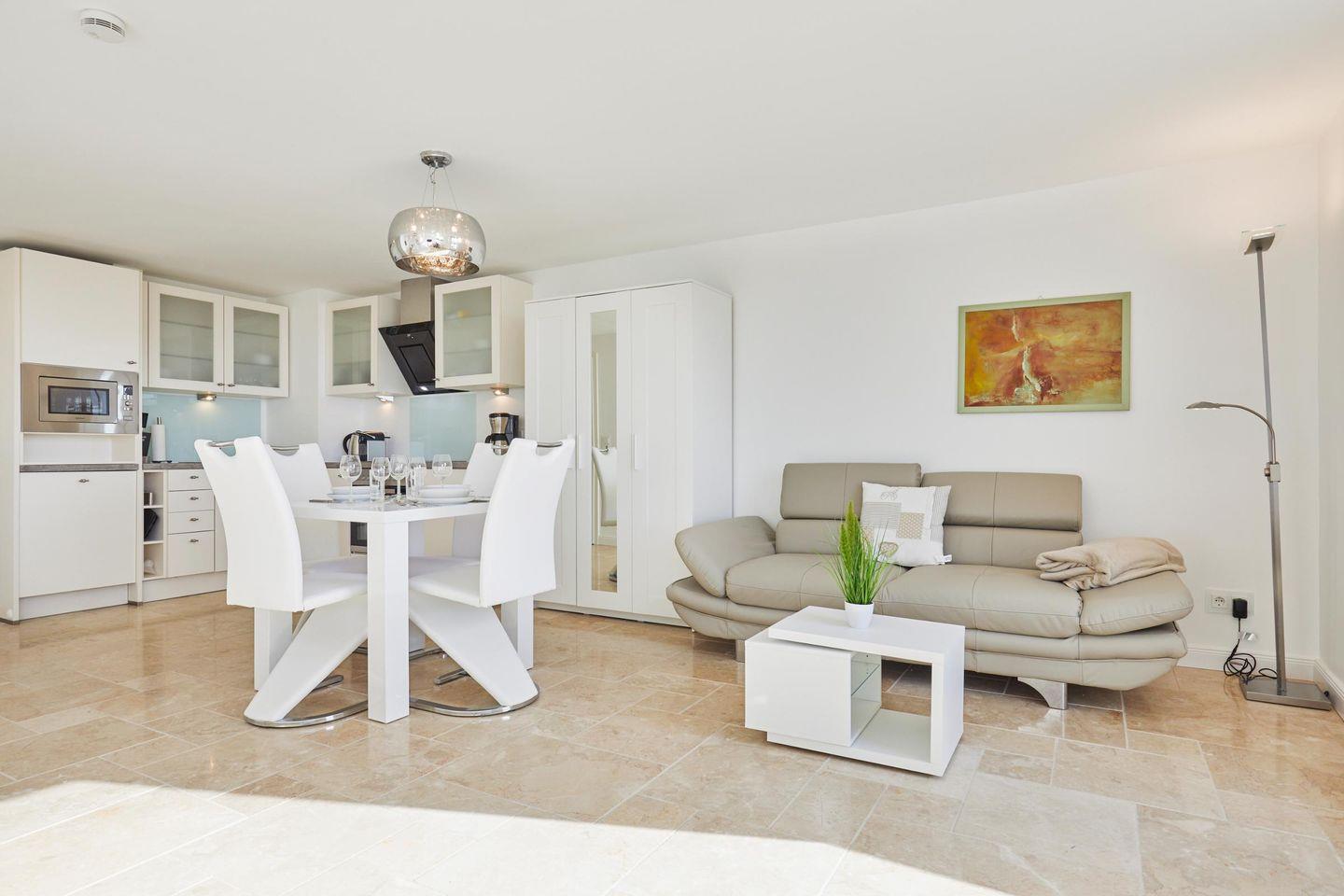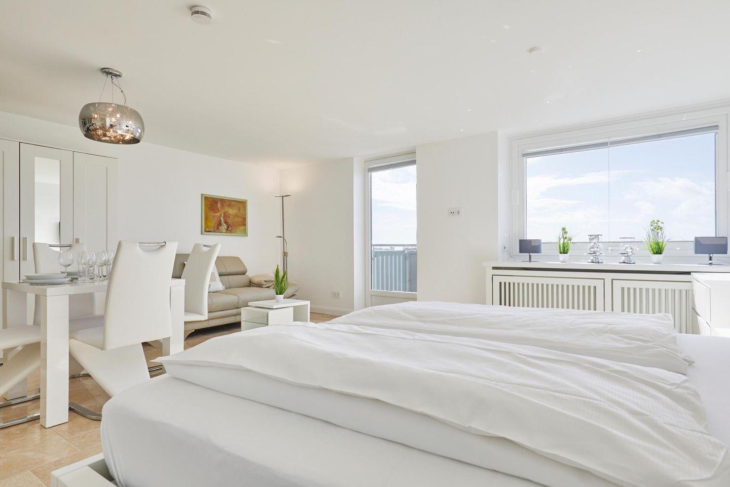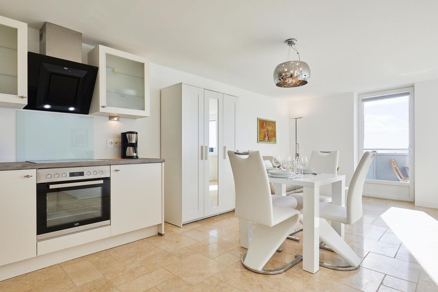 Dieses moderne ca. 37 m² große Einzimmerappartement für bis zu 2 Personen befindet sich im 8. Stock und bietet Ihnen eine Kombination aus hochwertiger Ausstattung und absoluten Komfort. Die offene, moderne Küche samt Geschirrspüler ist voll ausgestattet. Der angrenzende Wohn- und Schlafbereich mit Doppelbett (180x200 cm) und Essecke lädt zur absoluten Entspannung ein. Im Badezimmer erwartet Sie eine großzügige Dusche. Nutzen Sie gerne den sonnigen Westbalkon samt einzigartigem Meerblick. Kostenloses WLAN, ein zugehöriger Tiefgaragenstellplatz (Einfahrtshöhe ca. 190 cm, Breite ca. 280, Länge ca. 710 cm)sowie ein Fahrstuhl sind vorhanden. Haustiere sind erlaubt.