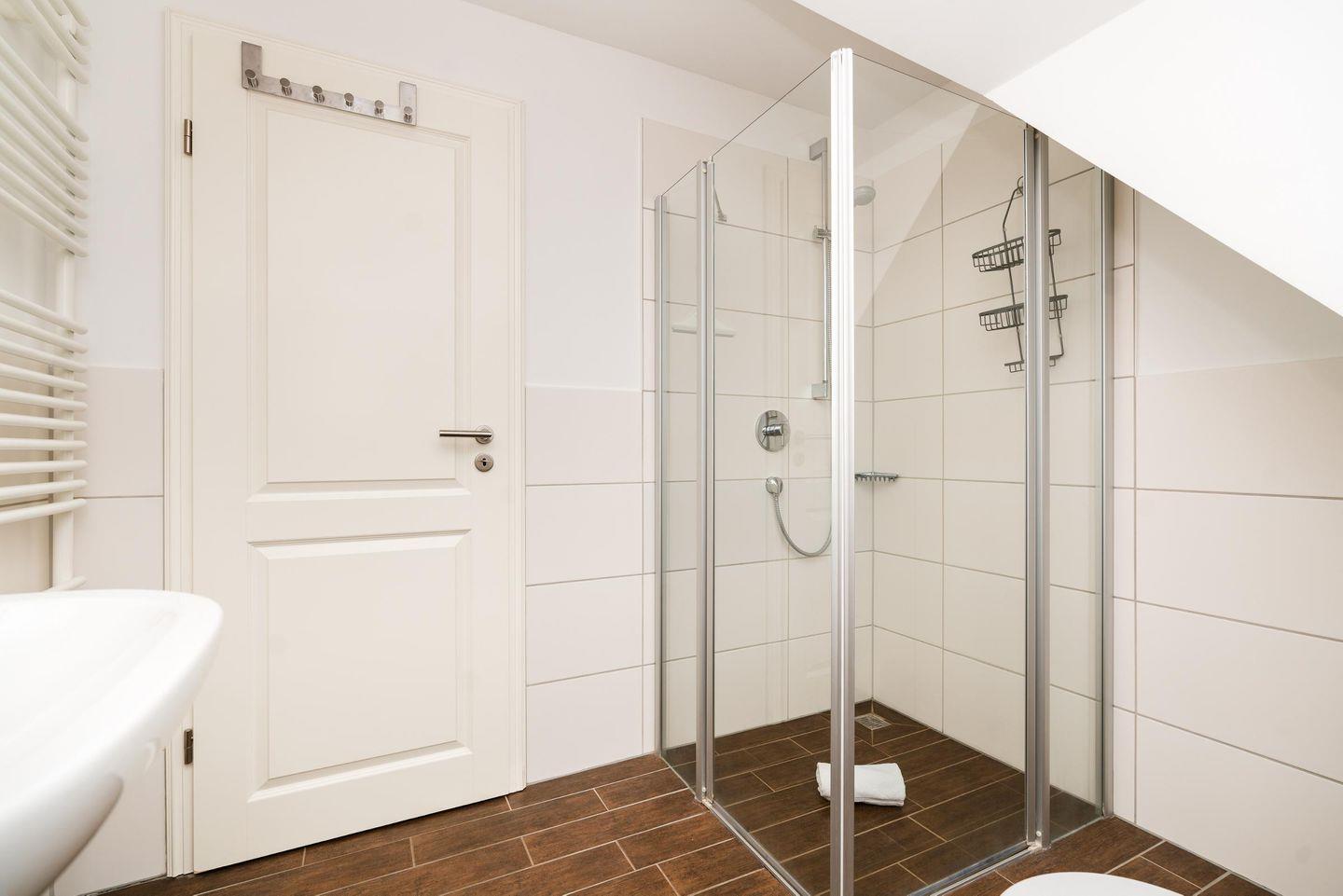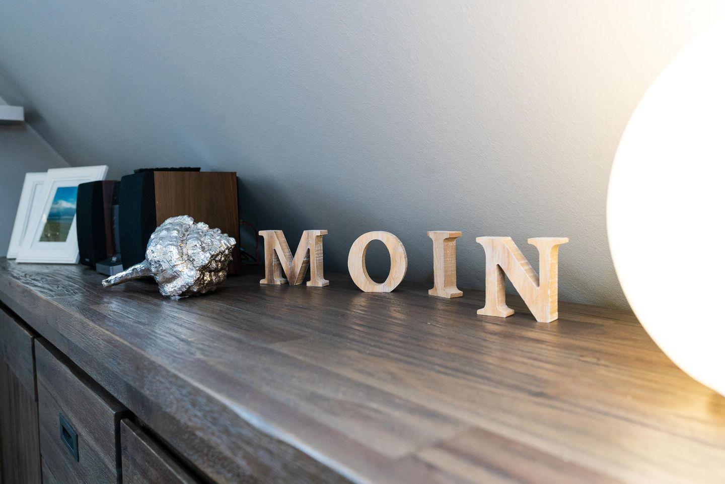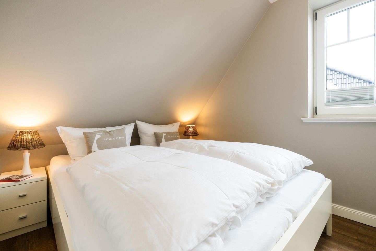 Im ersten Obergeschoss befindet sich der herrlich einladende Wohn- und Essbereich mit Couch und Sesseln, einem Esstisch sowie einer Küchenzeile. Viele hübsche Accessoires und Naturtöne machen "die gute Stube" wunderbar wohnlich. Traumhaft gemütlich ist auch das Schlafzimmer mit Doppelbett und Flatscreen an der Wand. Ein großzügig geschnittenes Duschbad macht das Obergeschoss komplett.