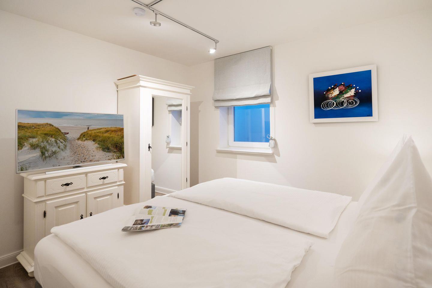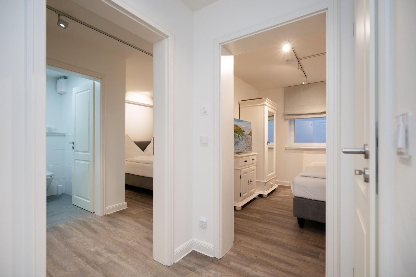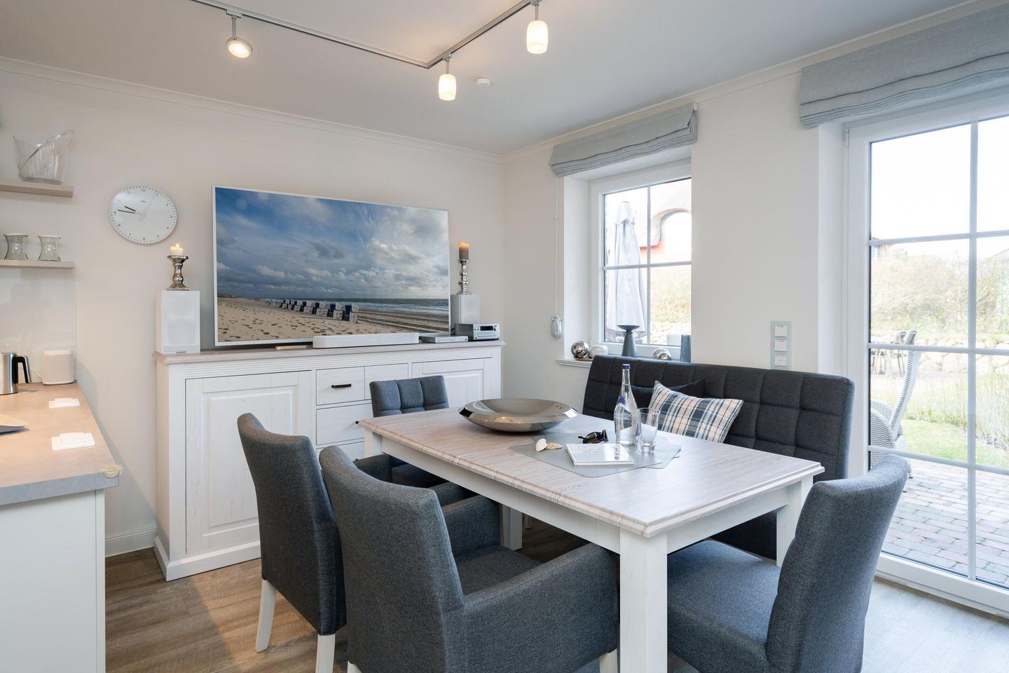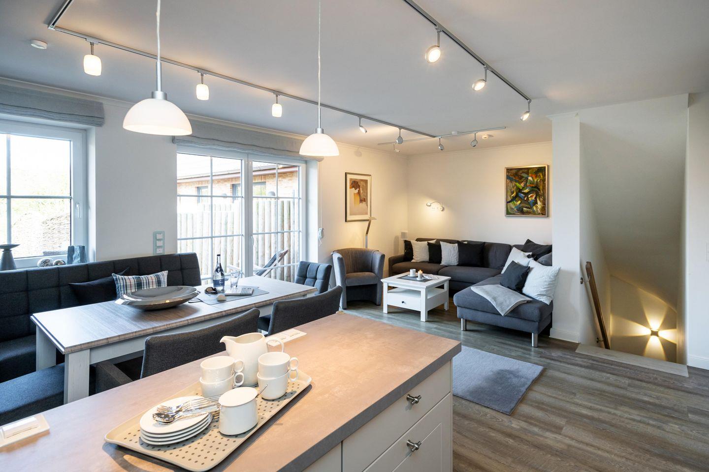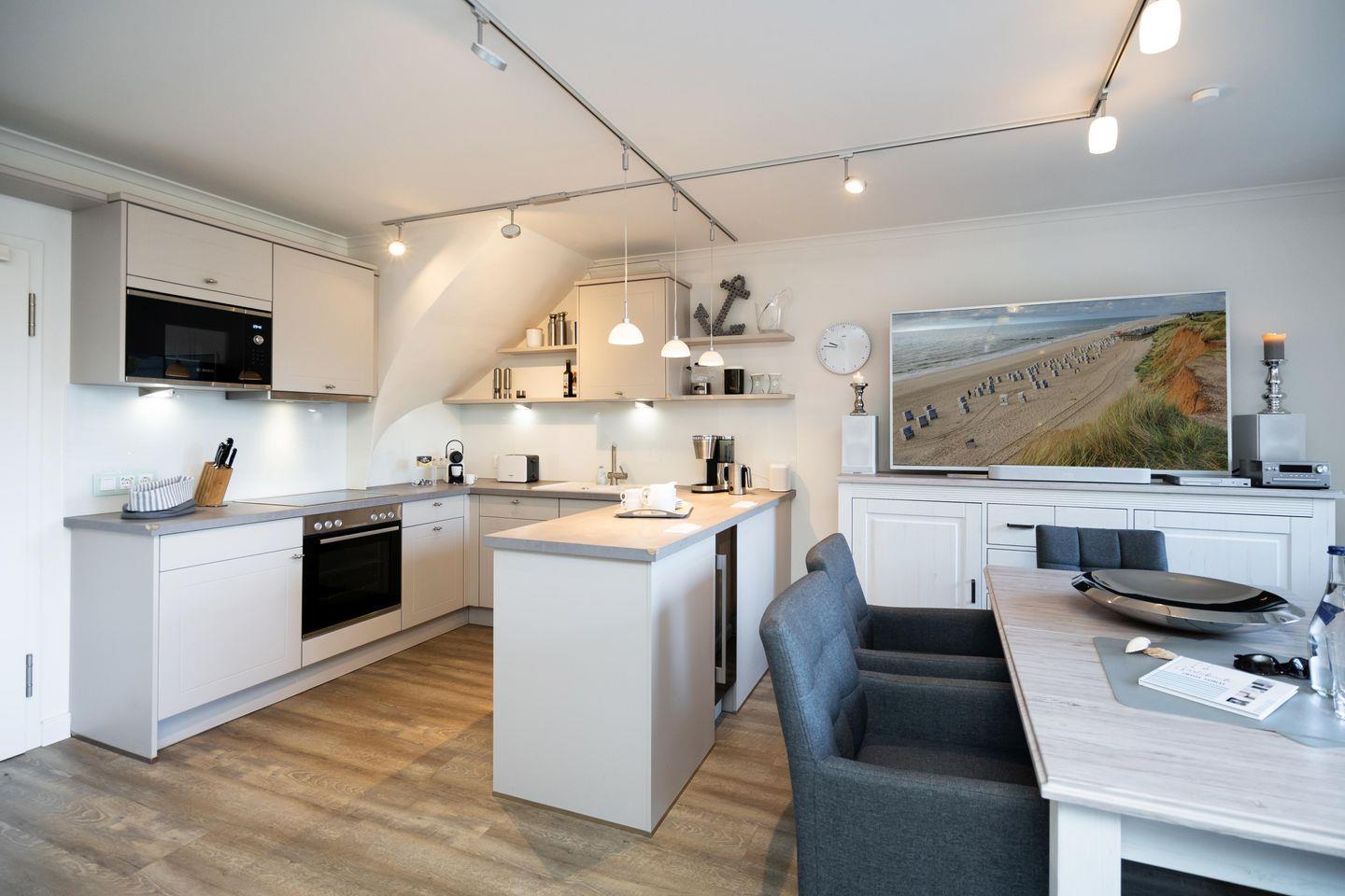 Drei Schlafräume, zwei Bäder und ein großzügiger Wohn- und Essbereich erstrecken sich auf 86,25 qm, garantieren Wohlfühlmomente und sorgen für ein erholsames Urlaubsvergnügen. Im Wohn- und Essbereich befindet sich eine hochwertige Küchenzeile im U-Format, die durch Großzügigkeit und Ausstattung besticht. Hochwertiges Geschirr, edle Töpfe, Kaffee-/Smoothie-Maschinen, Wasserkocher, Toaster, Mixer, Espresso-Maschine, Mikrowelle, Geschirrspüler, Kühl-/Gefrierschrank, Backofen, Getränkekühler und Ceranfeld sind vorhanden. Die drei Schlafräume im Souterrain sind alle mit Ruf-Boxspringbetten ausgestattet, wobei der On Suite Bereich über ein separates Bad inkl. einem Einbauschrank verfügt. Zwei Zimmer teilen sich ein Bad. Die beiden Hauptschlafzimmer sind mit einem Boxspringbett 1,80m x 2,00m ausgestattet, während das dritte Schlafzimmer über 2 Einzelbetten, die zusammengestellt werden können, verfügt.