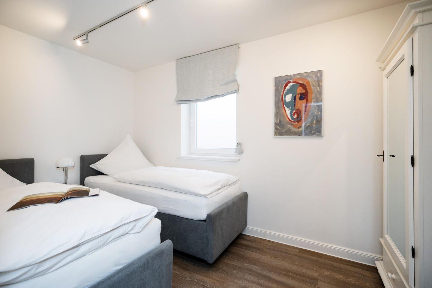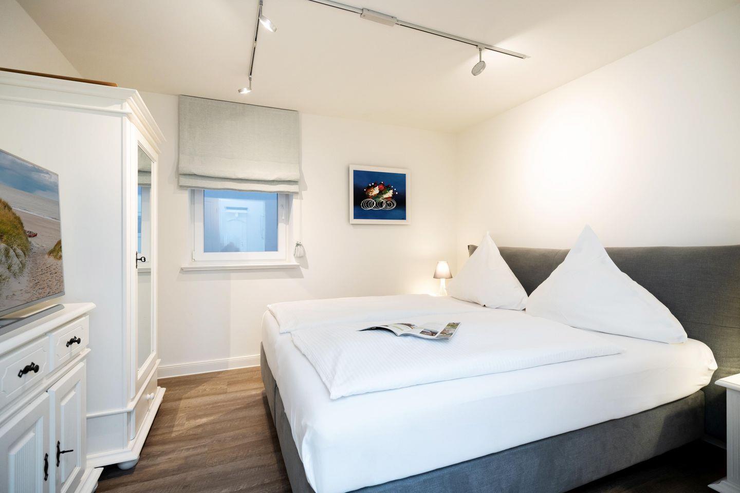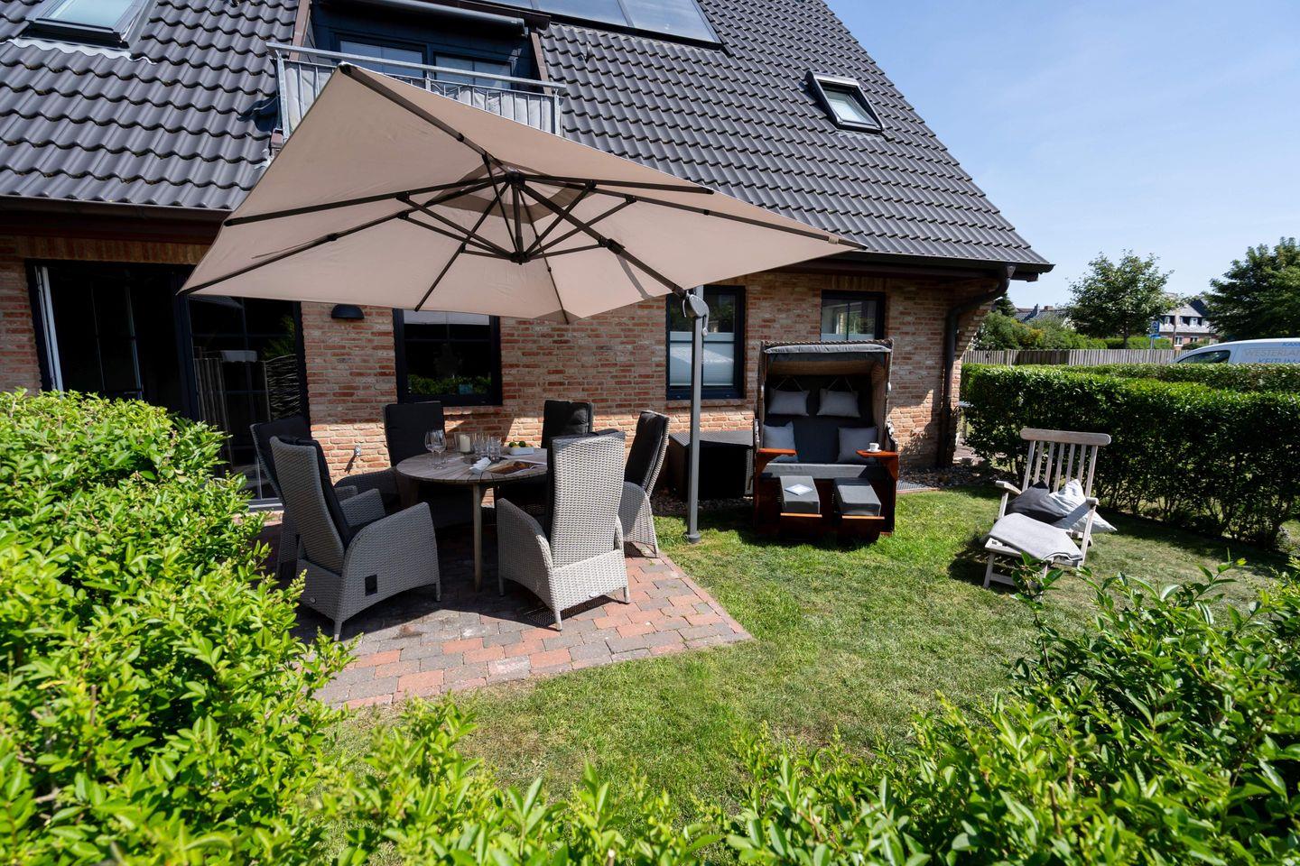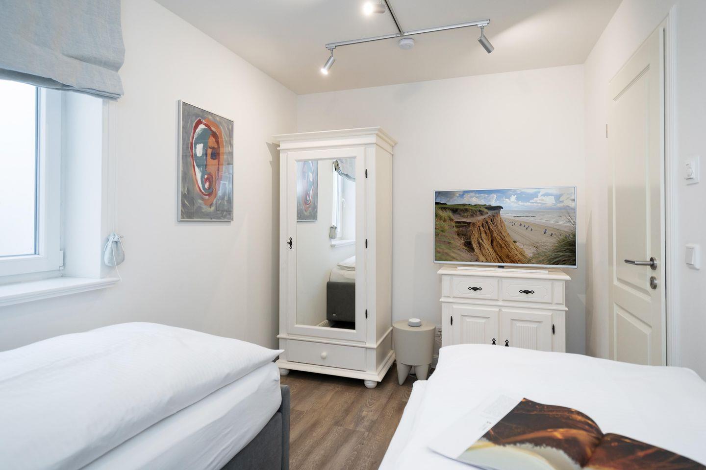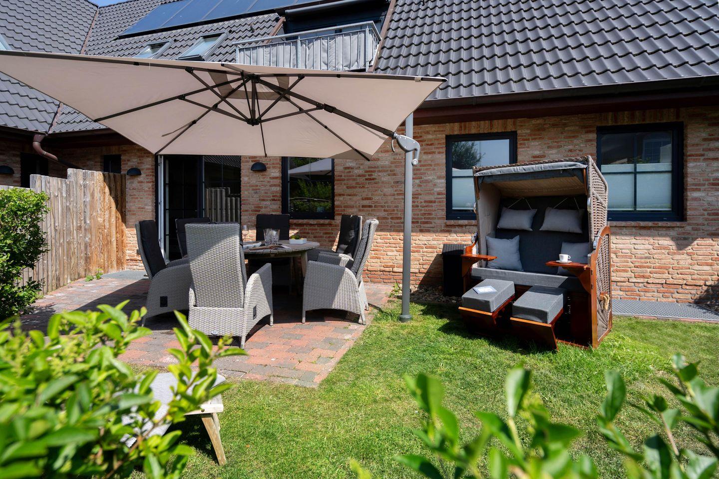 Drei Schlafräume, zwei Bäder und ein großzügiger Wohn- und Essbereich erstrecken sich auf 86,25 qm, garantieren Wohlfühlmomente und sorgen für ein erholsames Urlaubsvergnügen. Im Wohn- und Essbereich befindet sich eine hochwertige Küchenzeile im U-Format, die durch Großzügigkeit und Ausstattung besticht. Hochwertiges Geschirr, edle Töpfe, Kaffee-/Smoothie-Maschinen, Wasserkocher, Toaster, Mixer, Espresso-Maschine, Mikrowelle, Geschirrspüler, Kühl-/Gefrierschrank, Backofen, Getränkekühler und Ceranfeld sind vorhanden. Die drei Schlafräume im Souterrain sind alle mit Ruf-Boxspringbetten ausgestattet, wobei der On Suite Bereich über ein separates Bad inkl. einem Einbauschrank verfügt. Zwei Zimmer teilen sich ein Bad. Die beiden Hauptschlafzimmer sind mit einem Boxspringbett 1,80m x 2,00m ausgestattet, während das dritte Schlafzimmer über 2 Einzelbetten, die zusammengestellt werden können, verfügt.