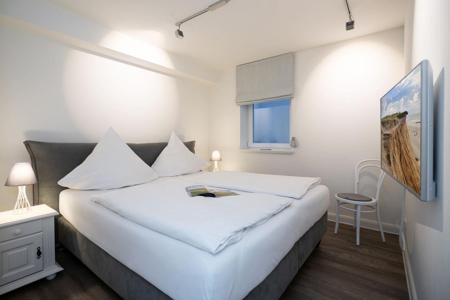 Hochwertiges 5-Sterne App., Baujahr 2018 auf zwei Ebenen in zentraler Lage von Westerland mit PKW-Stellplatz, Garten, Sauna und 6 Schlafmöglichkeiten verteilt auf 3 Doppelschlafzimmer. Sowohl der Strand als auch die Innenstadt sind fußläufig erreichbar.