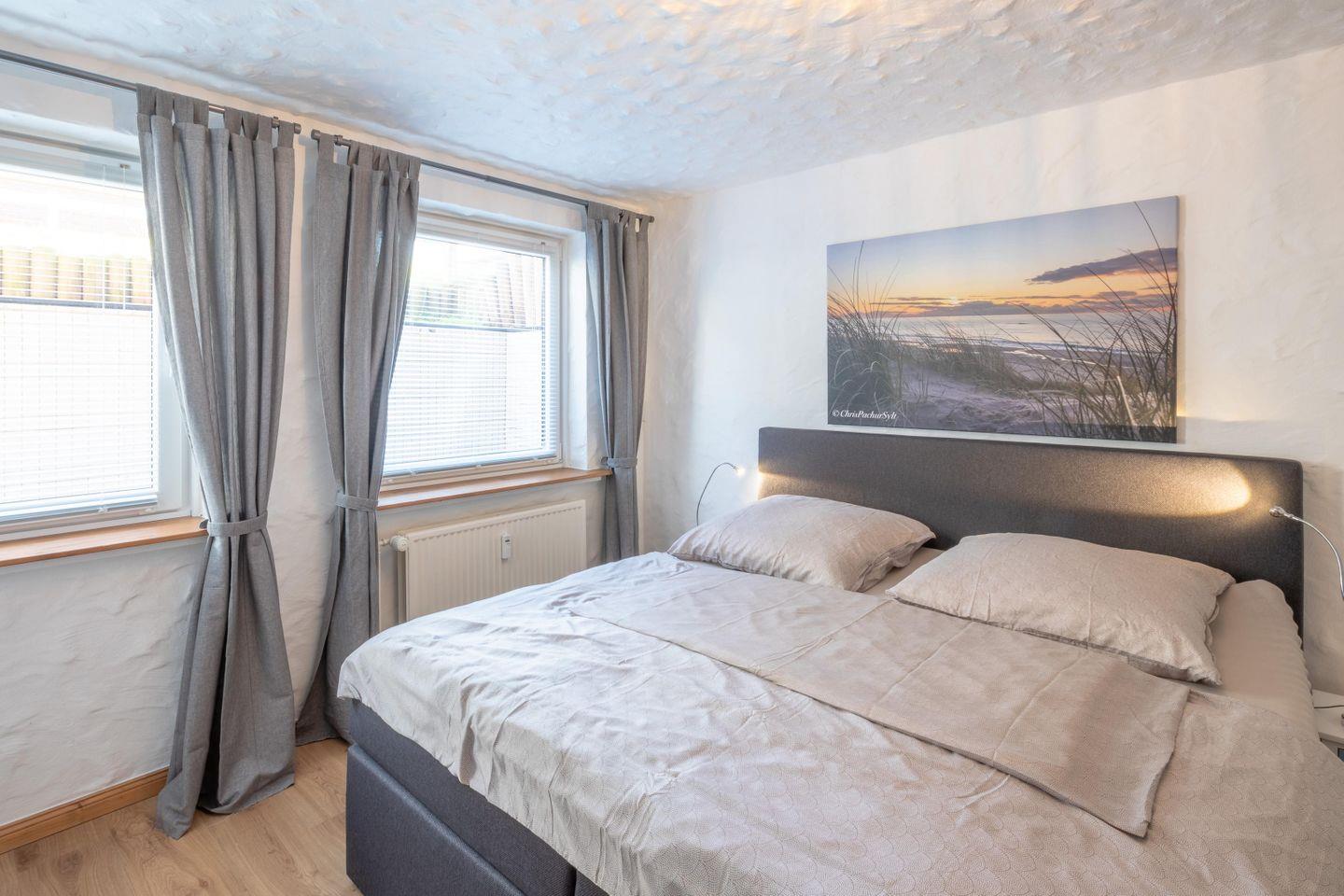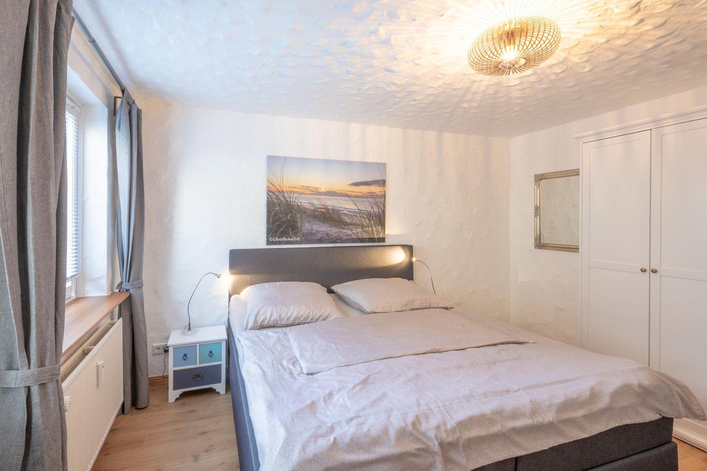 Beide Schlafzimmer sind mit jeweils einen Boxspringbett (180 x 200) ausgestattet. Eine Erstausstattung an Bettwäsche und Handtüchern wird bei dieser Unterkunft obligatorisch hinzugebucht und ist bereits im Endpreis enthalten.