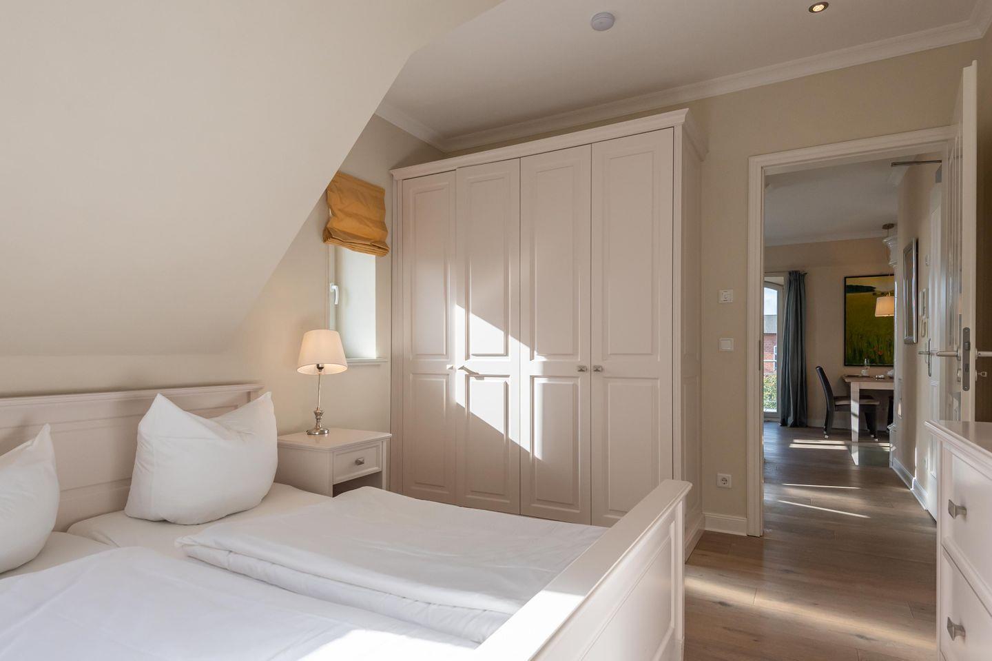 Schlafzimmer: Doppelbettschlafzimmer mit hochwertigen Einbauschränken, TV und Velux-Fenster.