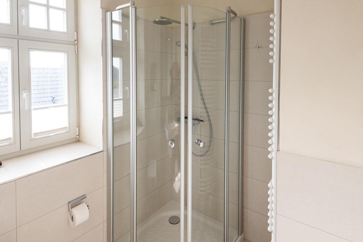 Badezimmer: Modernes Duschbad mit WC und Fenster.