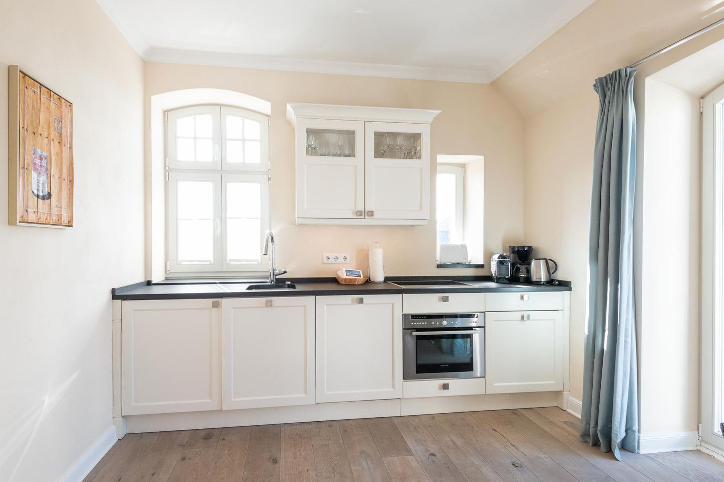 Wohn-/Koch-/Ess-/Schlafbereich: Die helle Küche lässt keine Wünsche offen. In dem modernen Wohnzimmer befindet sich ein herrlicher Kaminofen und ein TV für gemütliche Stunden. Das hochwertige Sofa bietet in Sekundenschnelle eine Schlafstätte für 2 Personen. Zur Sonnenseite ausgerichtet befindet sich der großflächige Süd/ Westbalkon mit edlen Gartenmöbeln und einem Sonnenschirm.