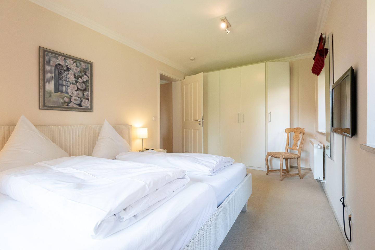 Schlafzimmer: Doppelbettzimmer mit TV, viel Schrankraum, Fenster sowie Ausgang in den Garten.