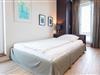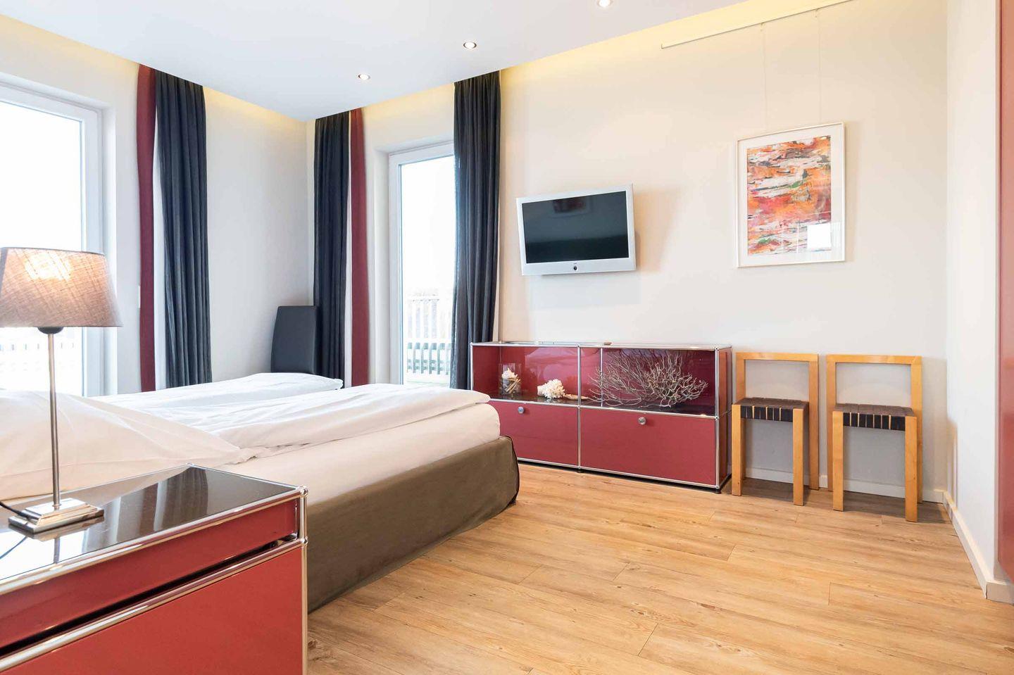 Schlafzimmer 1: Geräumiges Zimmer mit Doppelbett, bezogen mit feinster Wäsche der Firma Flamant. Flachbild-TV und Zugang zur Dachterrasse.