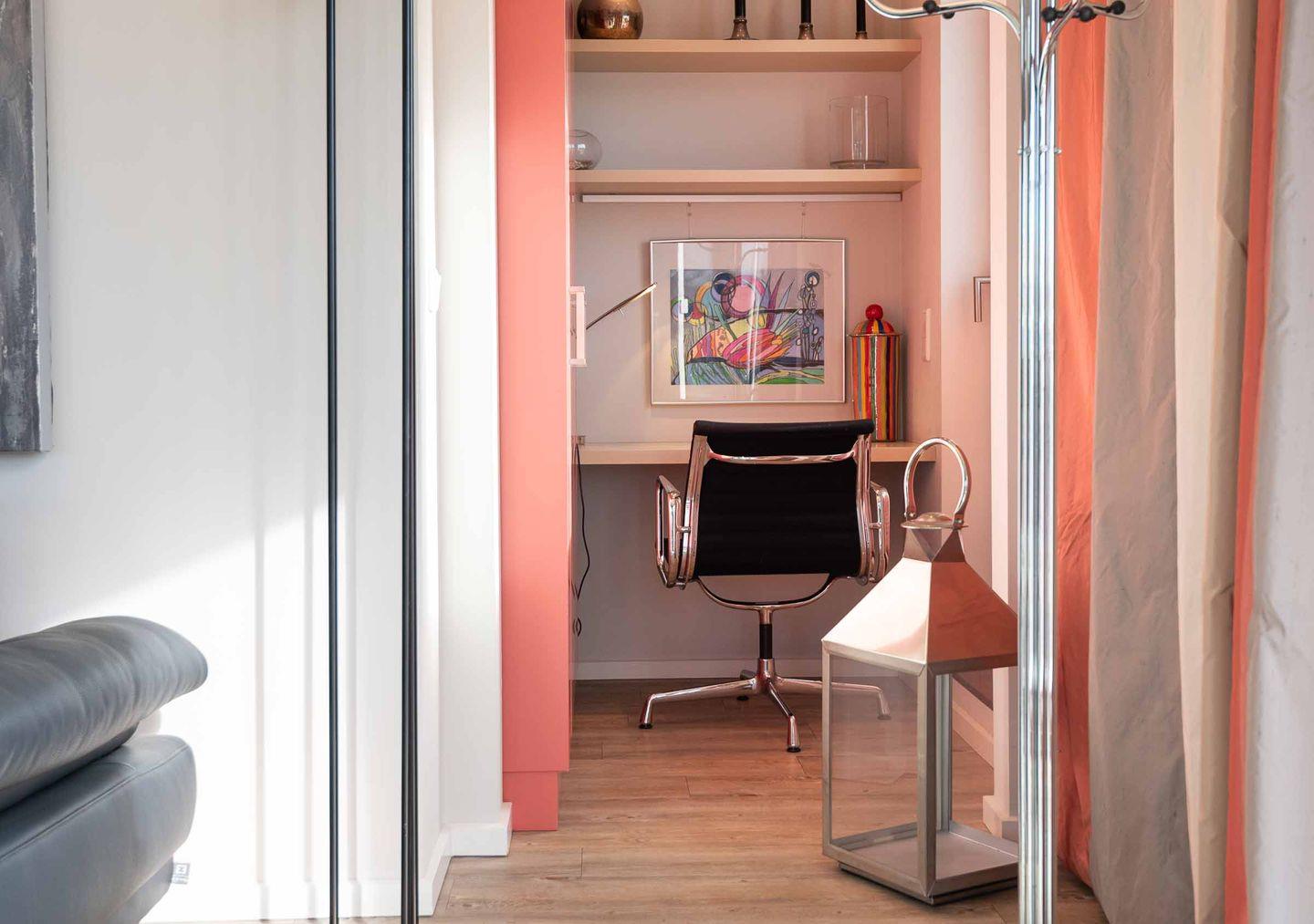 Wohnbereich: Der Wohn- und Essbereich ist mit hochwertigen Möbeln bestückt und wird durch bodentiefe Fenster lichtdurchflutet. Von hier haben Sie direkten Zugang zur Dachterrasse. Ein kleiner Arbeitsraum grenzt an den Wohnbereich an.