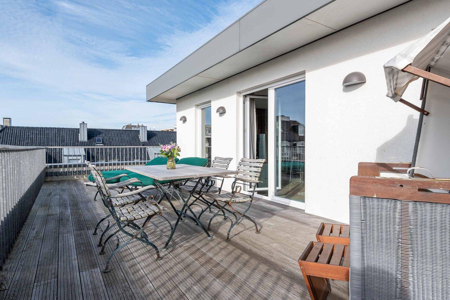Dachterrasse: Große Dachterrasse mit ca. 100 m² Bankiraiboden, edlen Sitz- und Liegemöbeln sowie Saisonstrandkorb (April bis Anfang Oktober).