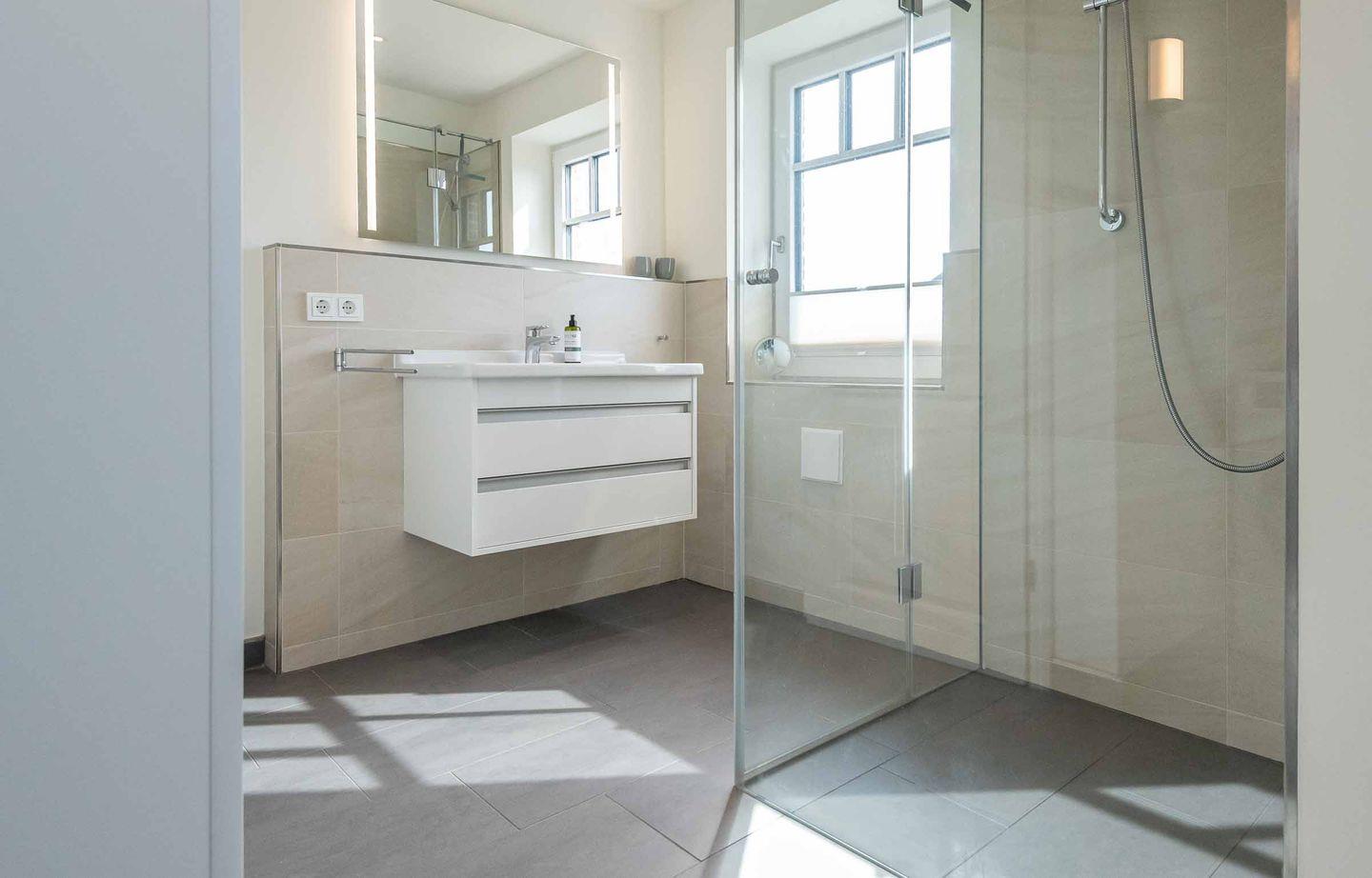 Badezimmer: Modernes Bad mit Dusche, WC und Fenster. Hier befindet sich auch ein Waschtrockner.