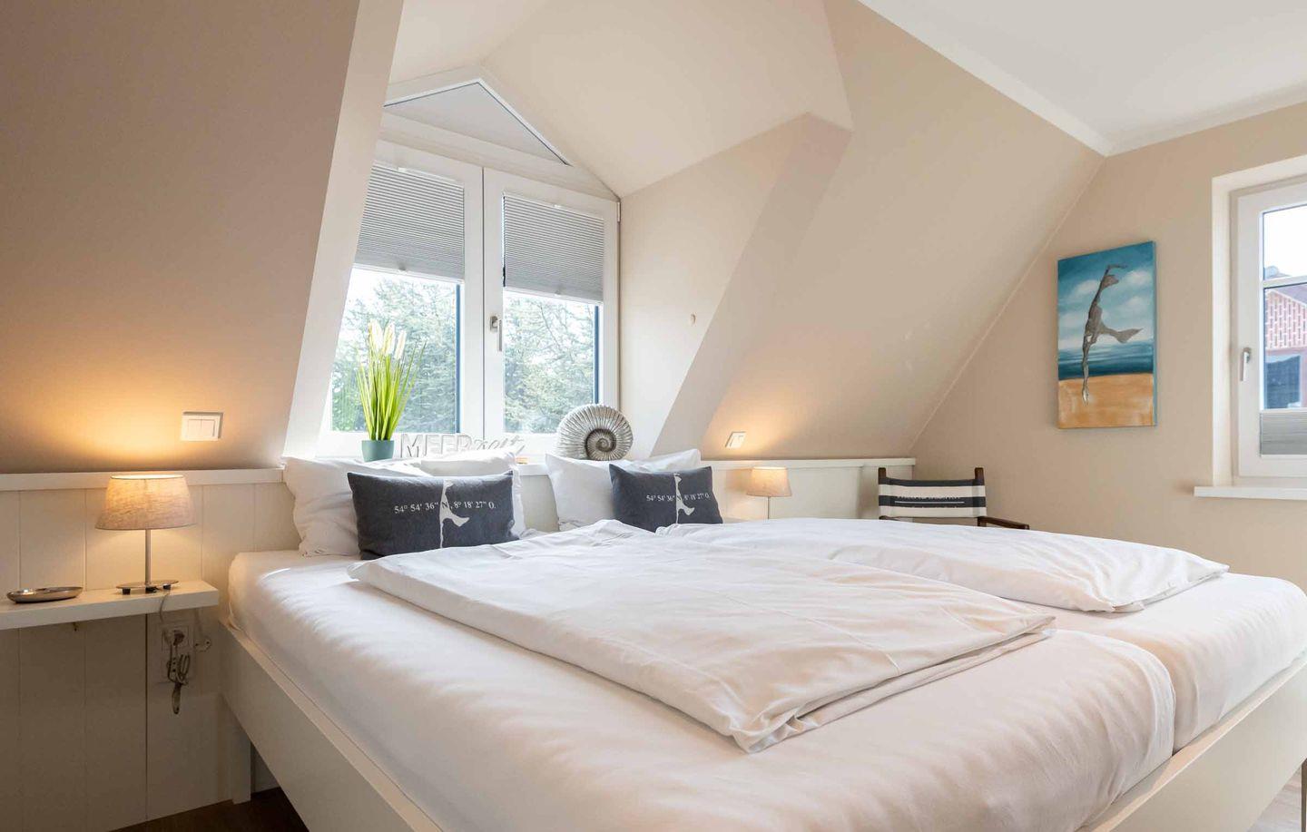 Schlafzimmer 1: Doppelbettschlafzimmer mit großem Fenster und vielen hochwertigen Einbauschränken.