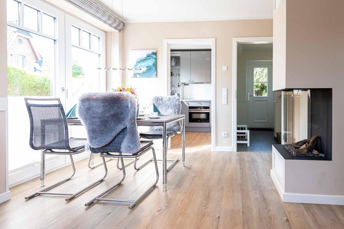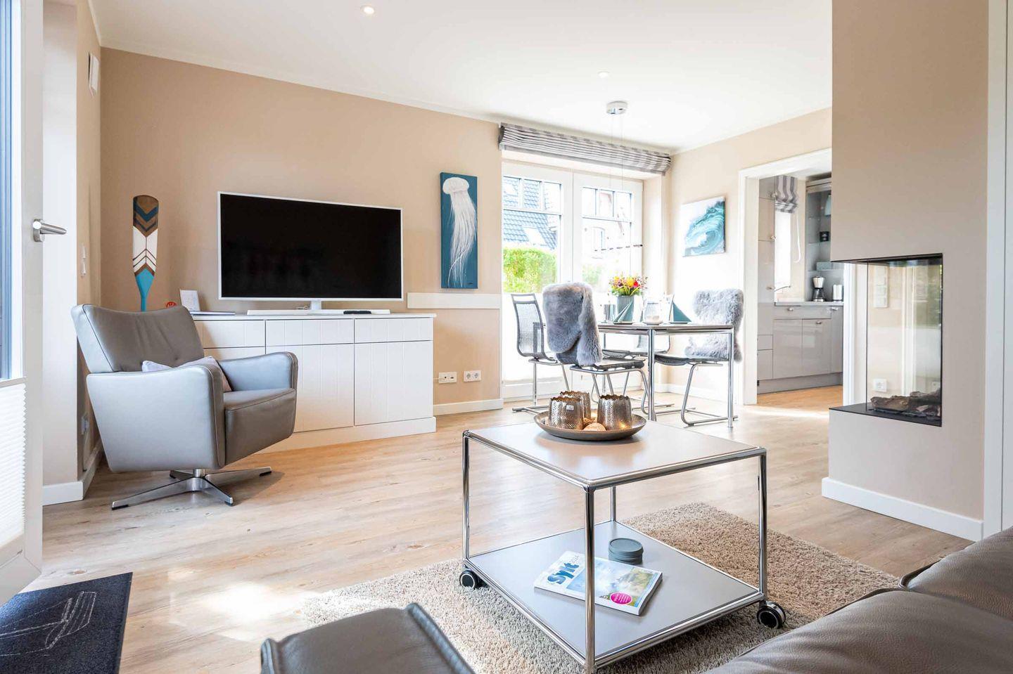 Modernes Domizil auf ca. 78 m² für bis zu 3 Personen zentral und dennoch ruhig in Westerland gelegen. Eine traumhafte Terrasse und ein Elektro-Kamin runden das helle und im maritimen Stil gehaltene Objekt ab.