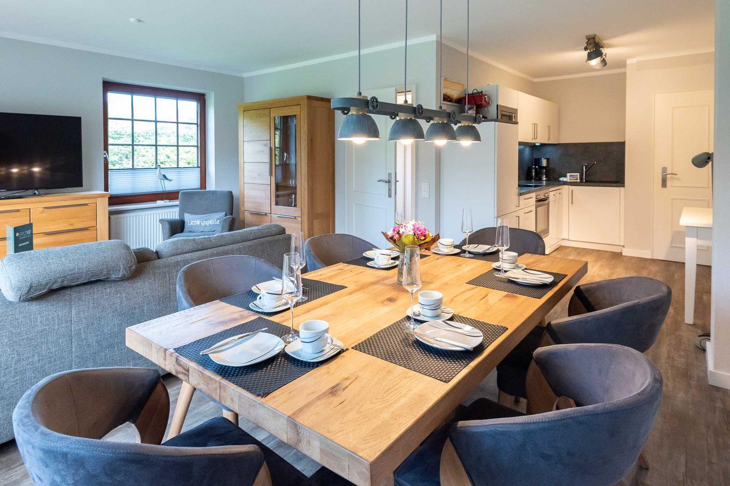Wohn-/Koch-/Essbereich: Im EG liegt der großzügige Wohn- und Essbereich mit Massivholzmöbeln im Beachhouse-Style. Hier finden Sie eine gemütliche Sofaecke mit Flatscreen-TV sowie einen großen Esstisch für gesellige Mahlzeiten. Die offene, voll ausgestattete Küche rundet diesen Raum perfekt ab.